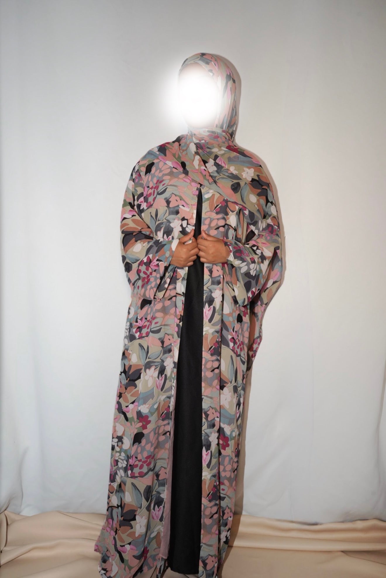 This printed abaya features a loose, comfortable fit with a button attached. Made from lightweight chiffon with a chiffon lining to maintain its flow, it comes with a matching hijab in the same printed fabric.
