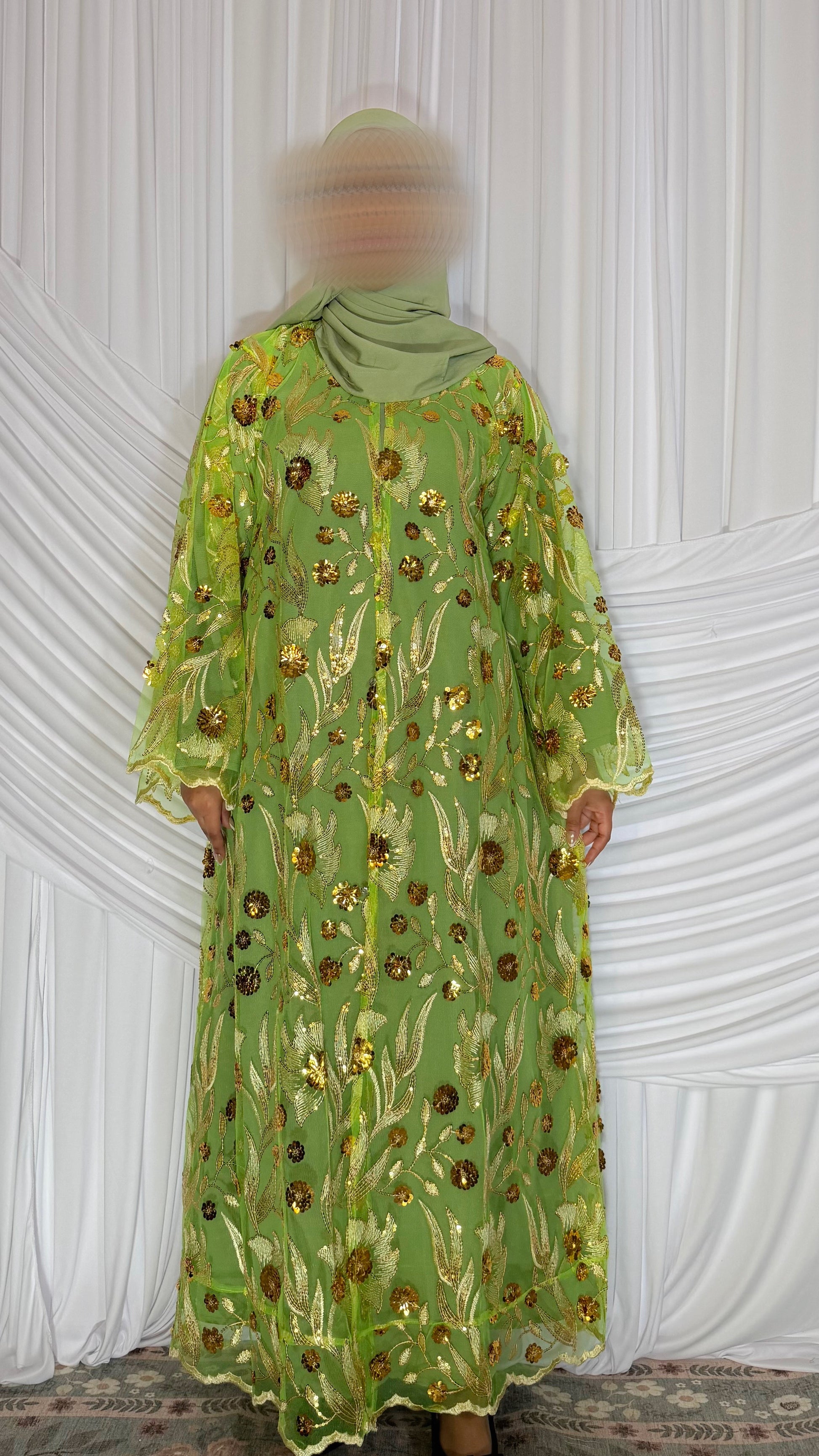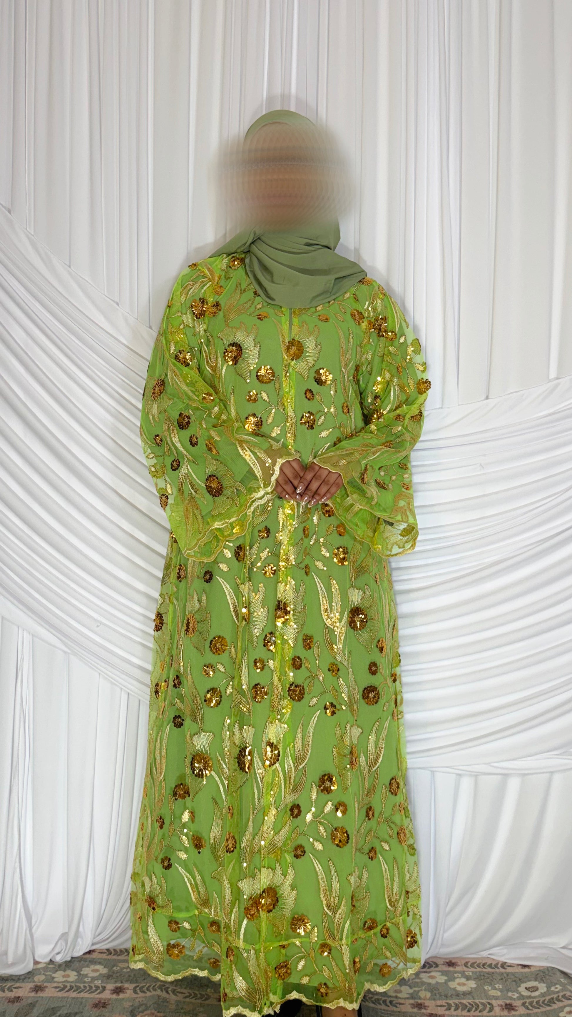 A three-piece abaya set featuring an outer abaya embellished with sequins and embroidery throughout. Paired with a crepe inner dress and a matching hijab