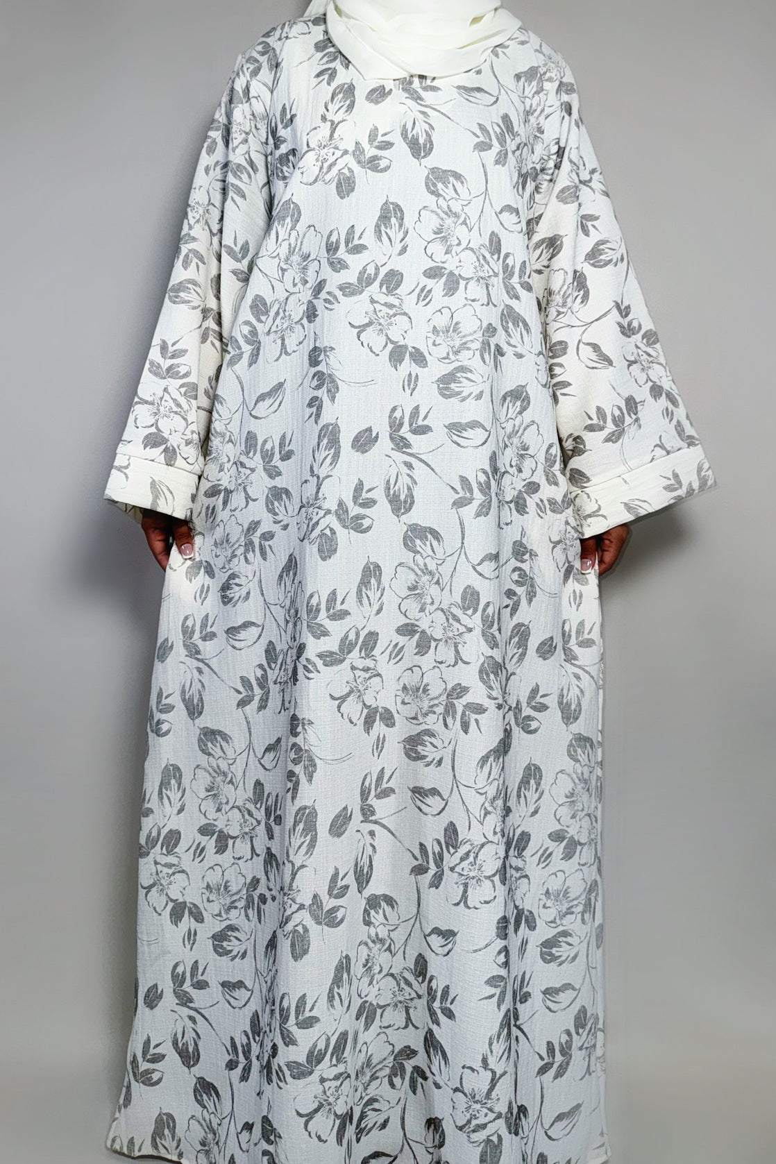 This closed linen abaya offers a straight fit and is designed with convenient pockets. It also features a beautiful floral print.