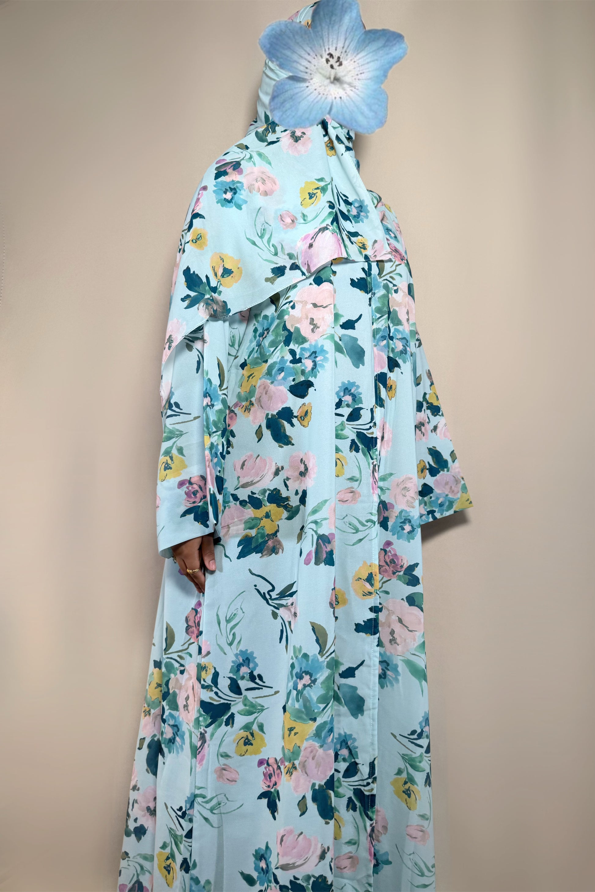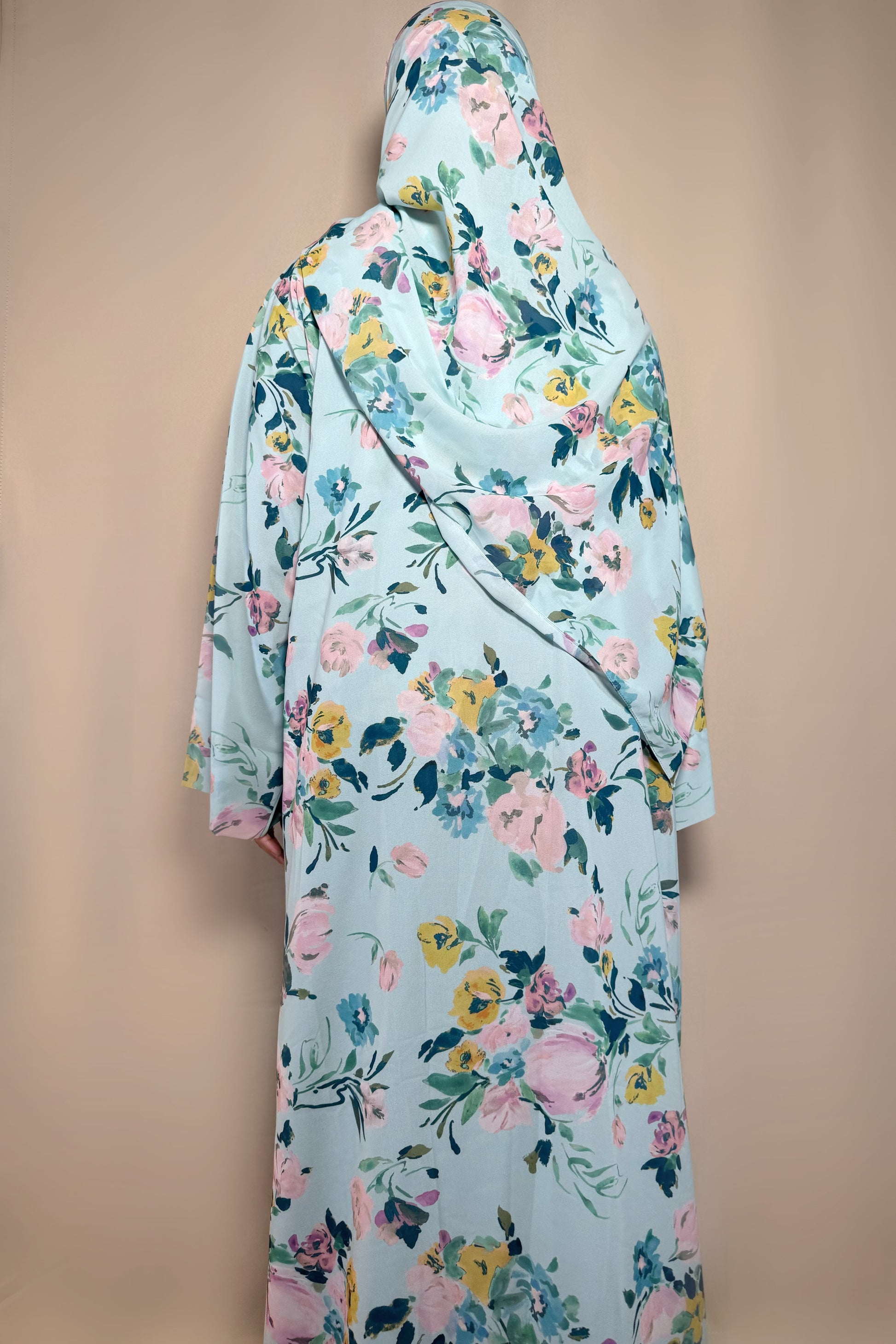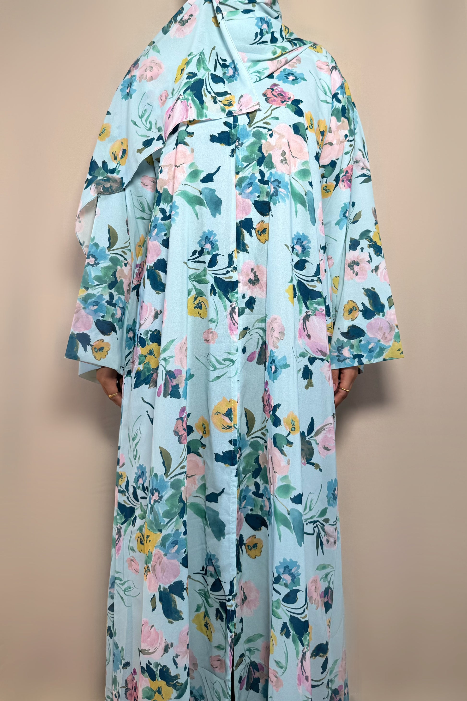 This printed abaya features a loose, comfortable fit with a button attached. Made from lightweight chiffon with a chiffon lining to maintain its flow, it comes with a matching hijab in the same printed fabric.