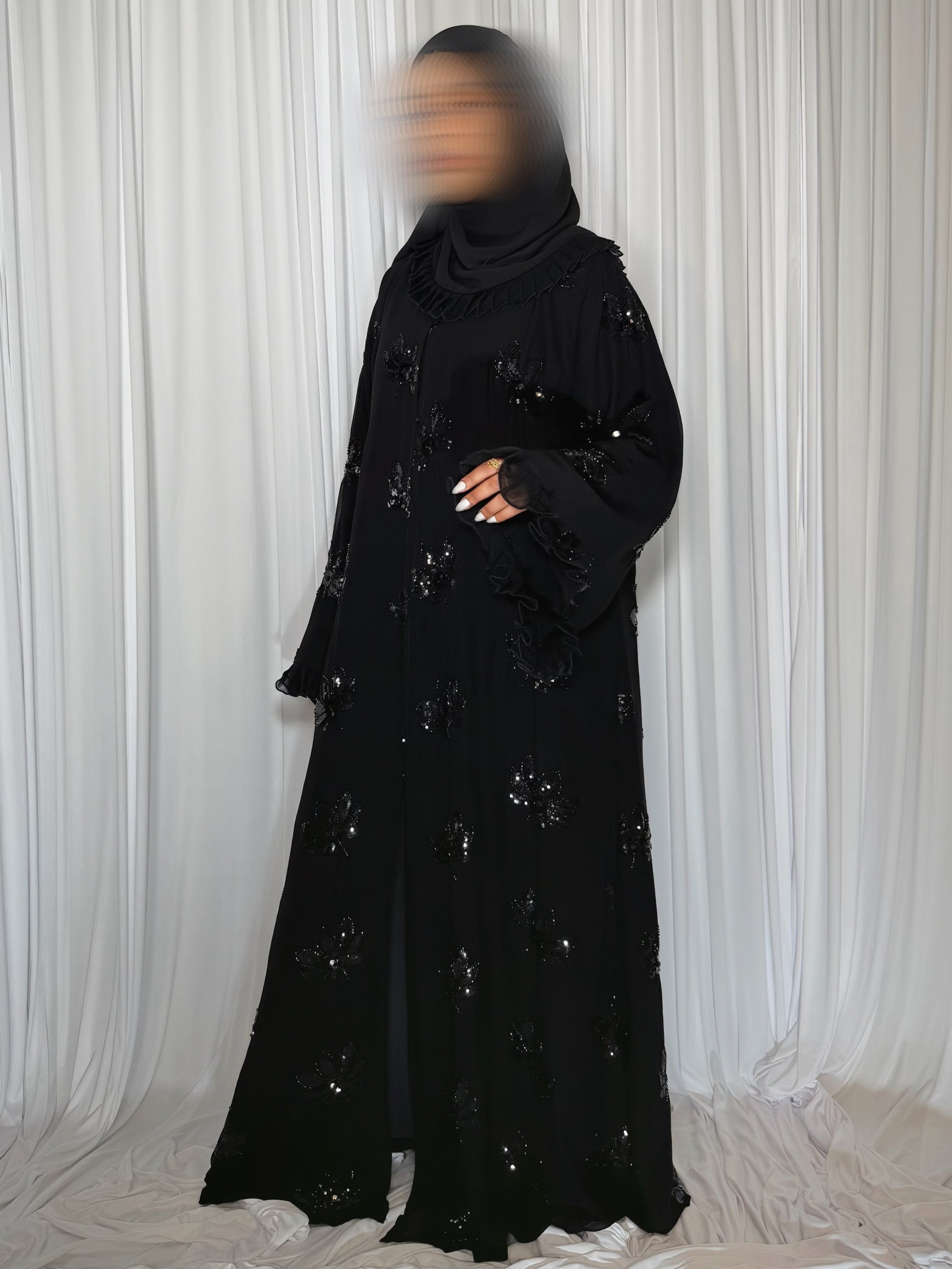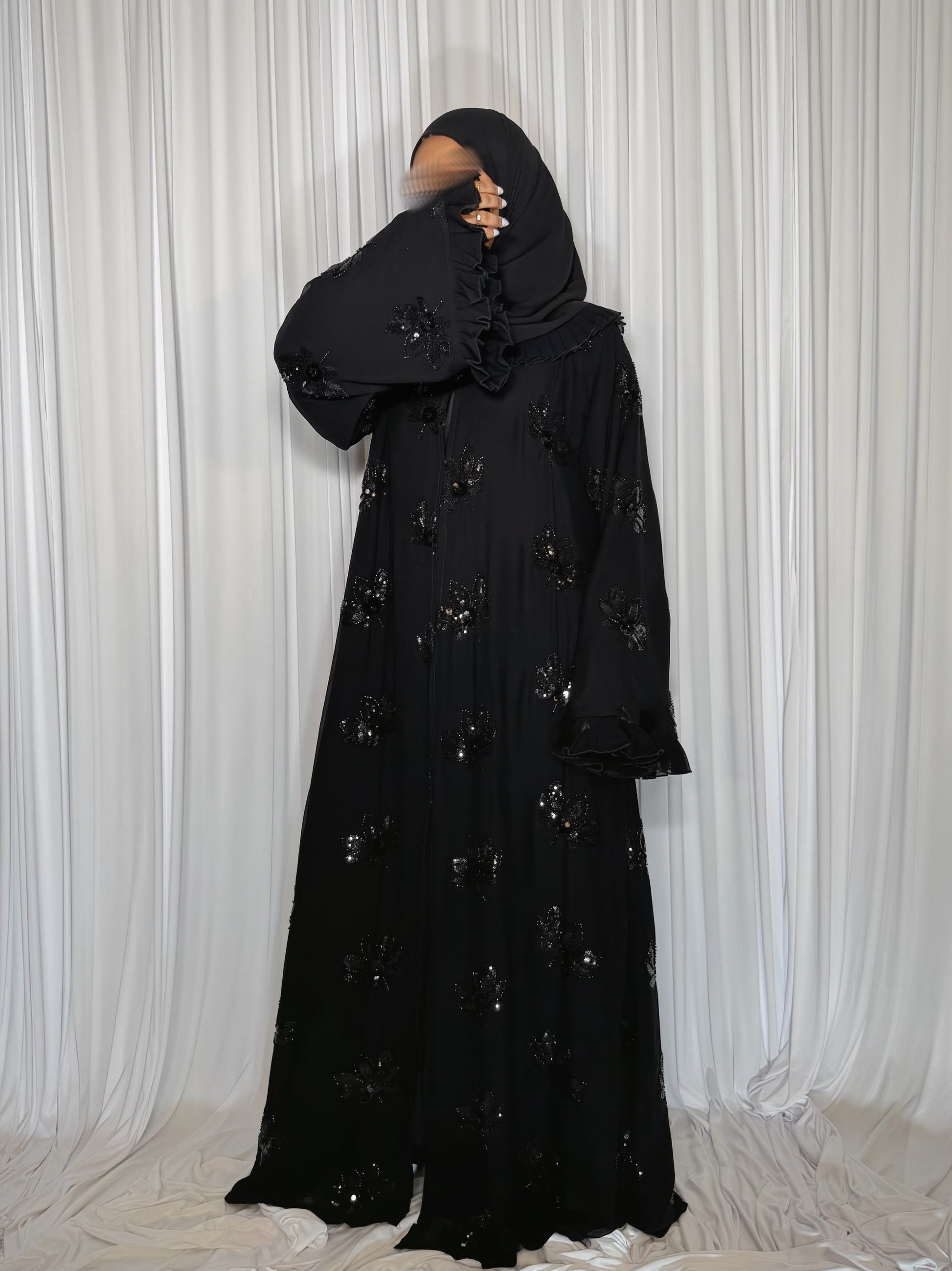 A flared tapered abaya adorned with subtle sparkles from delicate sequins and hand-applied beading. Designed with ruffled, pleated cuffs for a soft statement and a matching hijab finished with a ruffled pleated border.