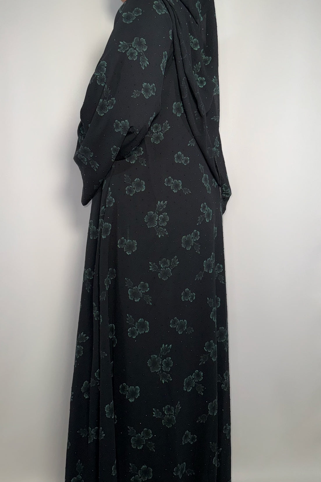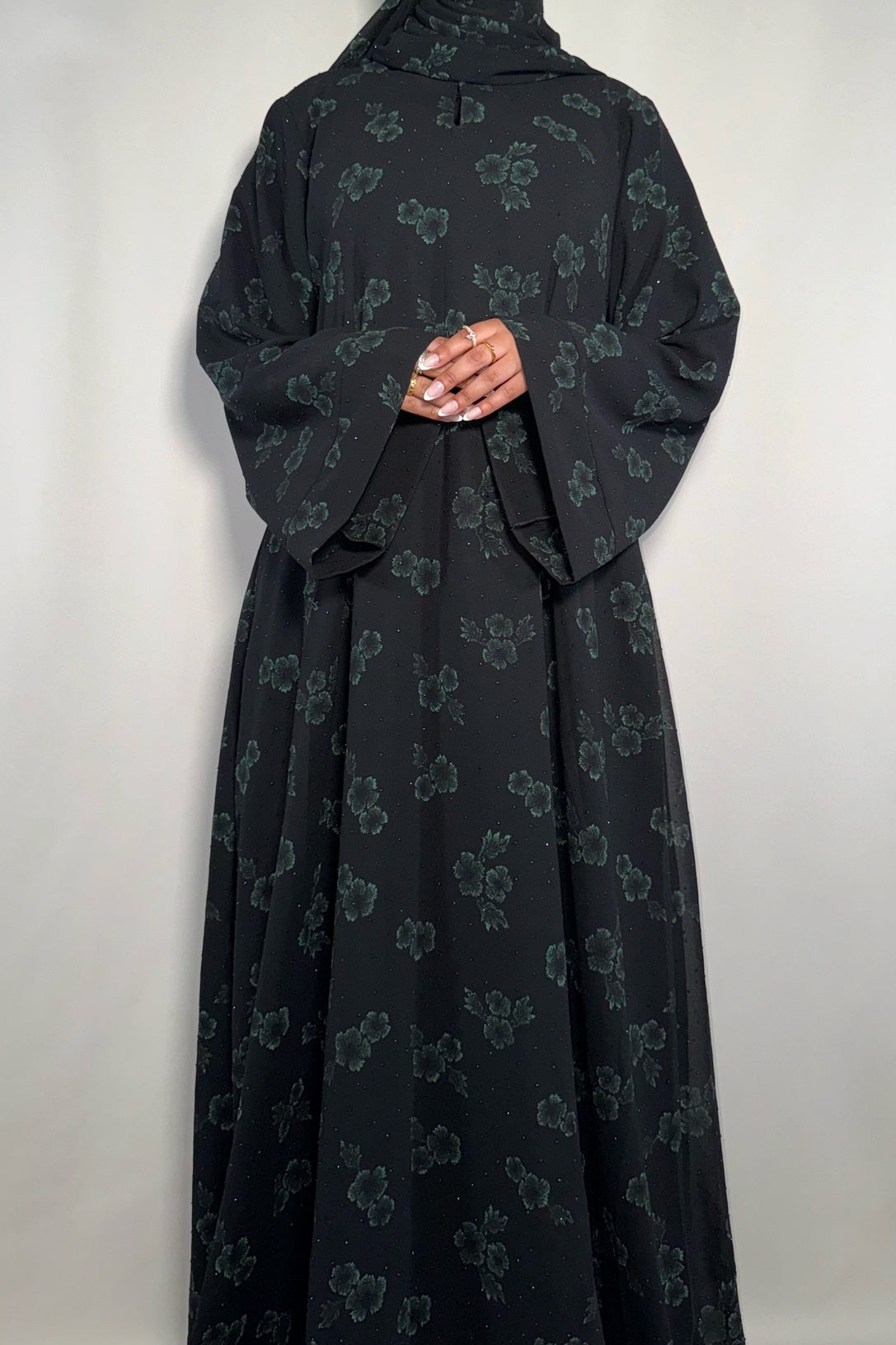 This black double-layered chiffon abaya features a colorful shimmer print and sparkling stones throughout. It is a closed abaya that has pockets for functionality, and comes with a matching hijab for a coordinated look.