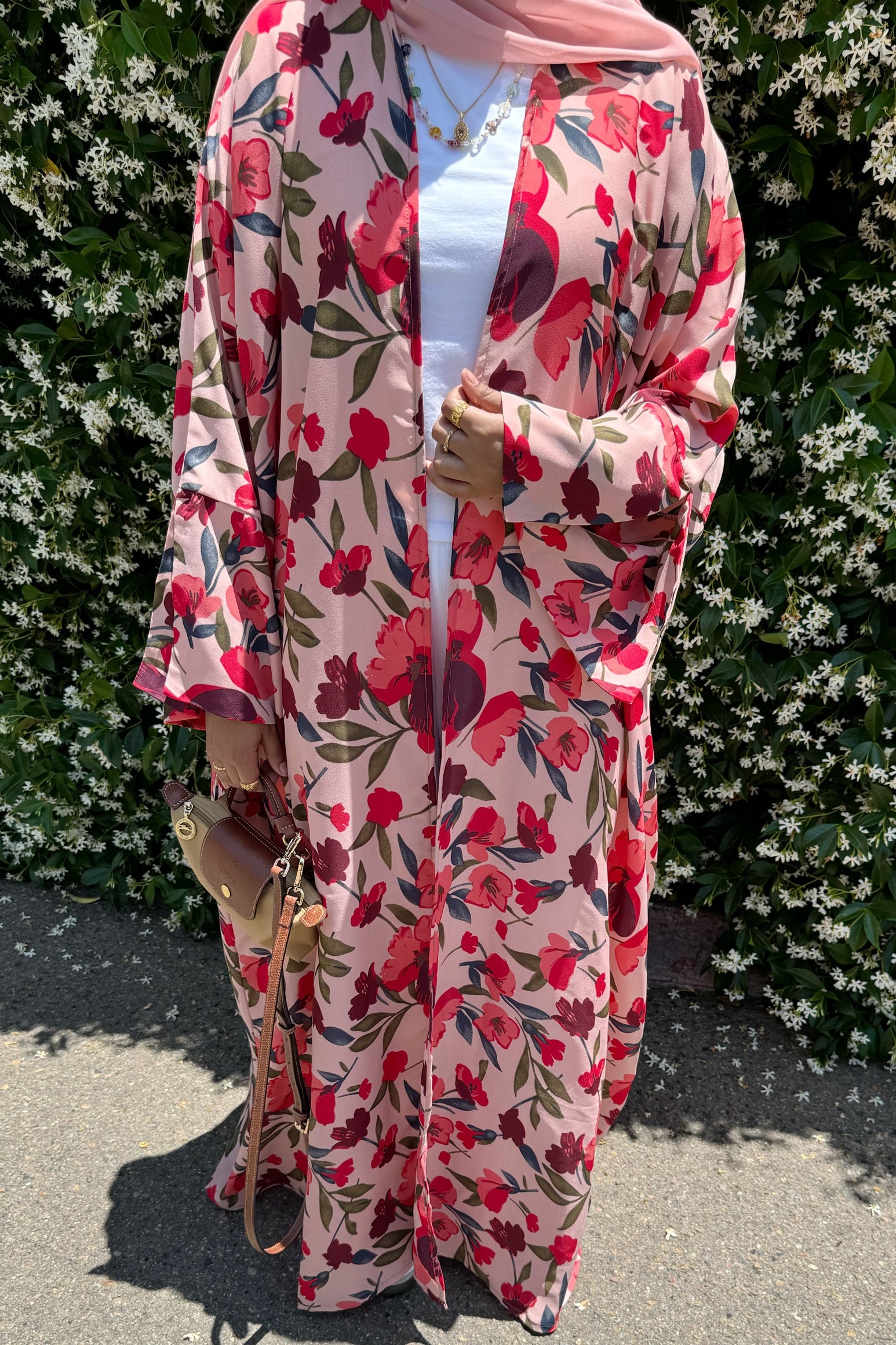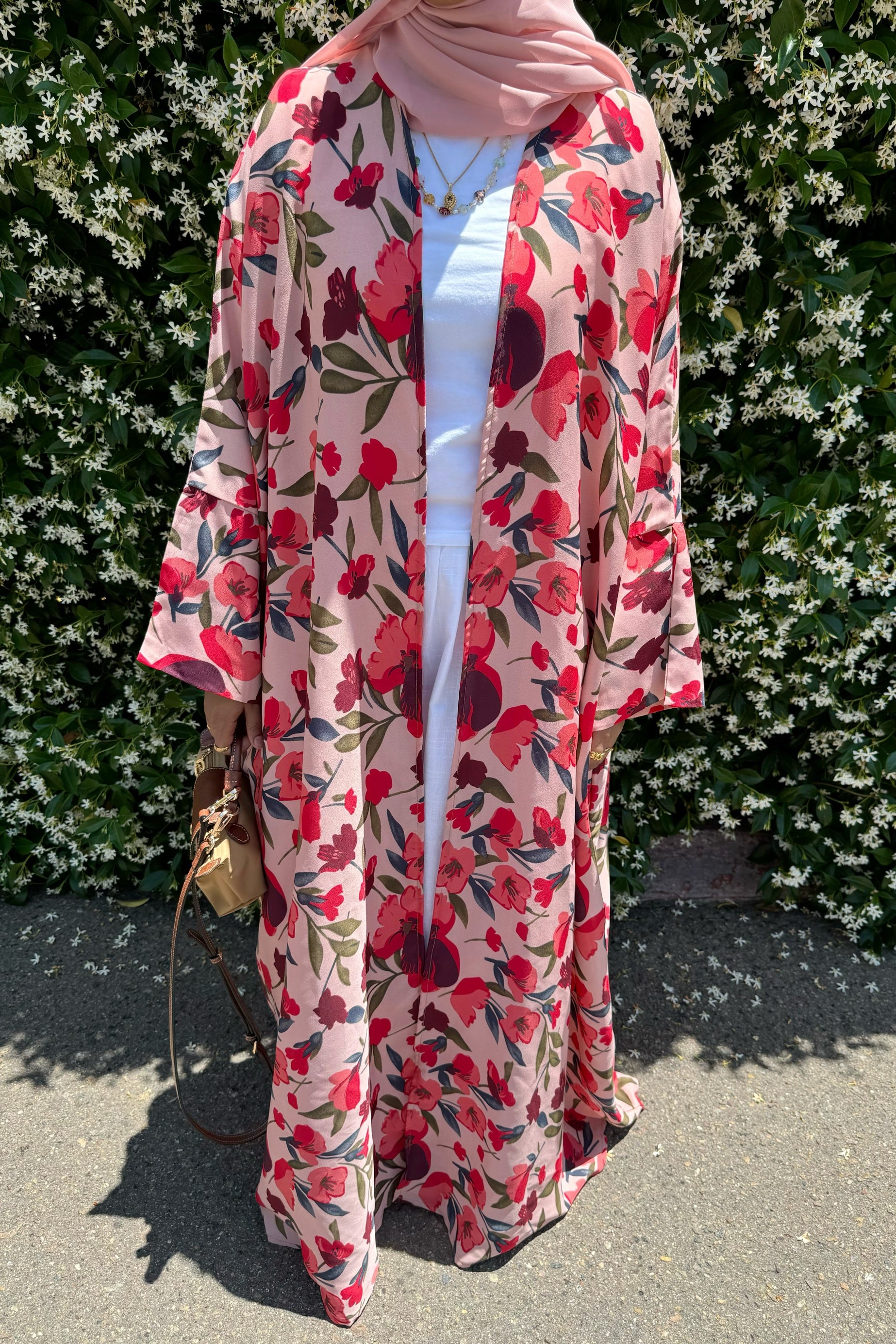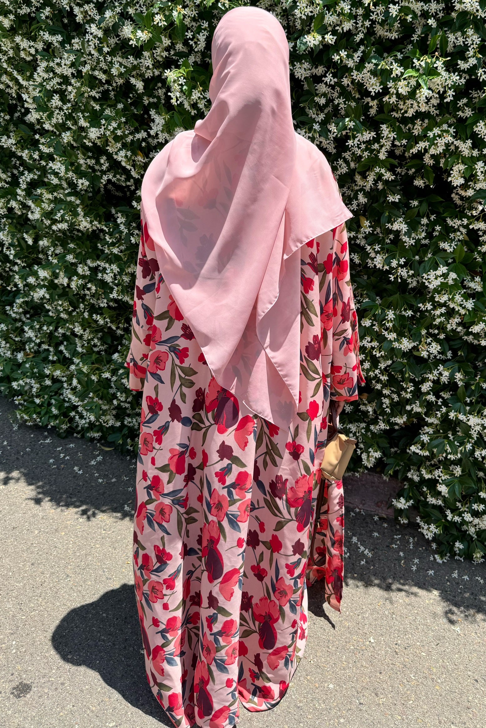 This printed abaya features a soft floral design with a wide, comfortable fit. Made from lightweight chiffon crepe, it offers a flowing silhouette and includes hand splits for added ease.