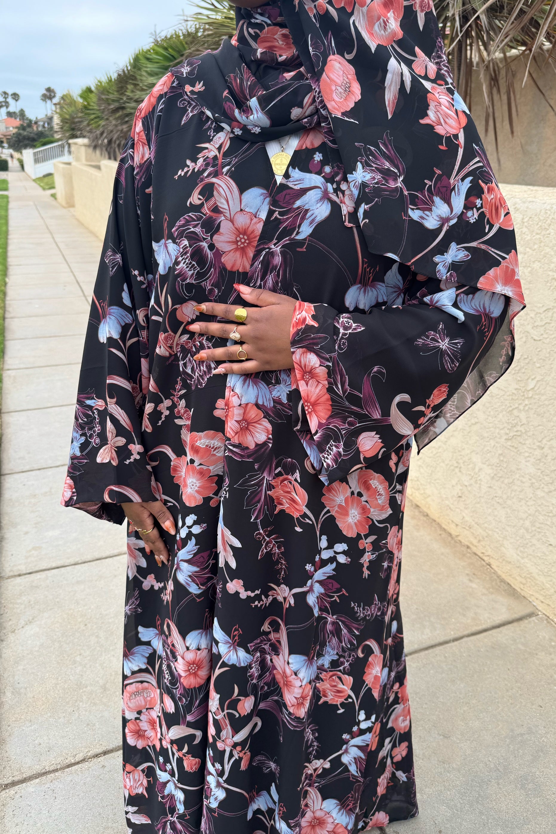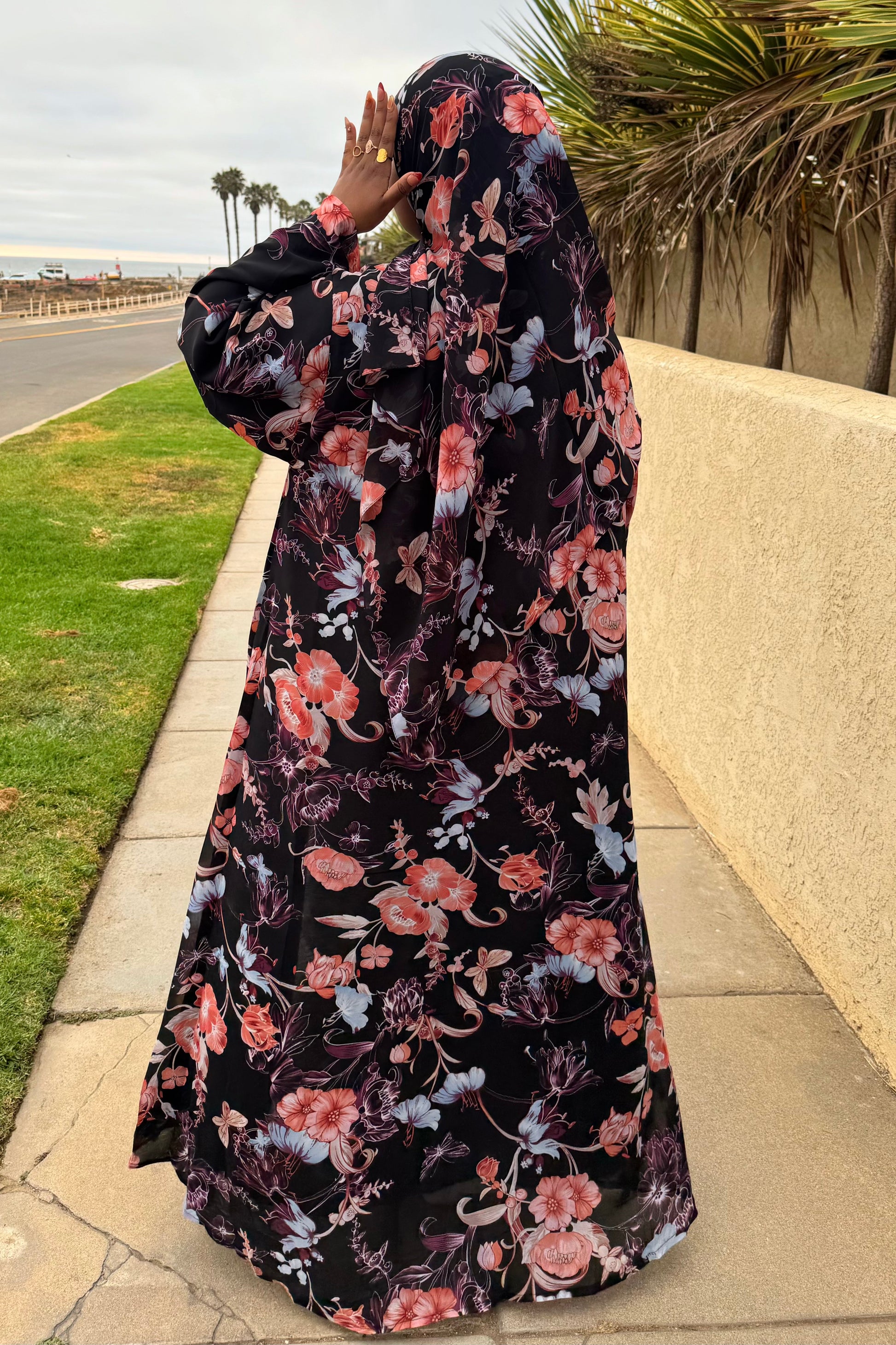 This printed abaya features a floral design and a loose, comfortable fit. Made from lightweight chiffon with a chiffon lining to maintain its flow, it comes with a matching hijab in the same printed fabric.