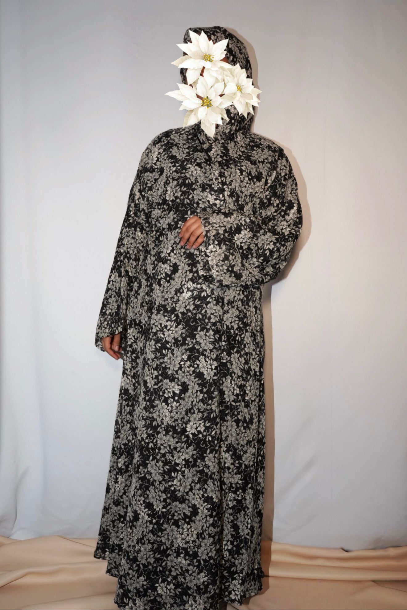 This printed abaya features a loose, comfortable fit with a button attached. Made from lightweight chiffon with a chiffon lining to maintain its flow, it comes with a matching hijab in the same printed fabric.