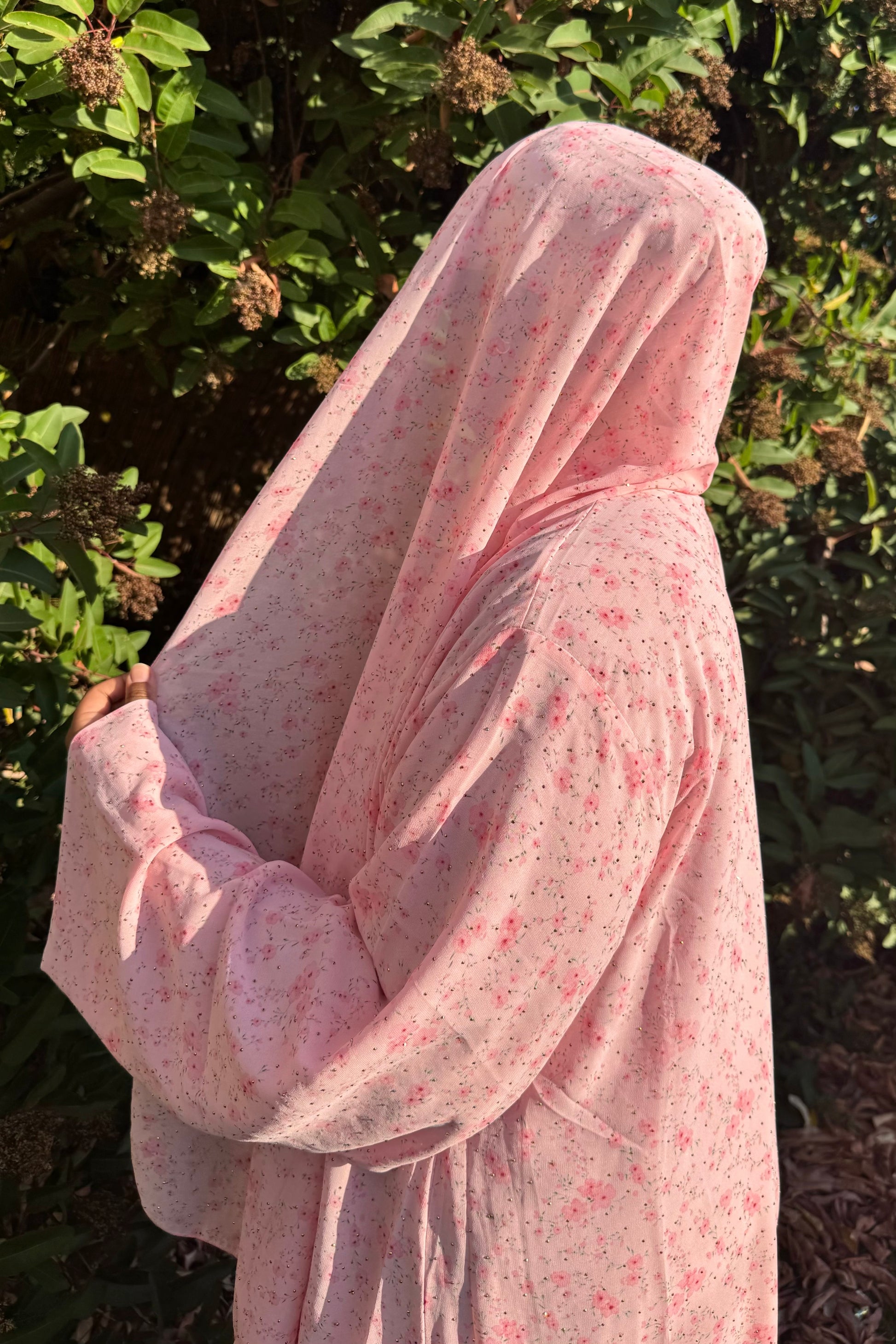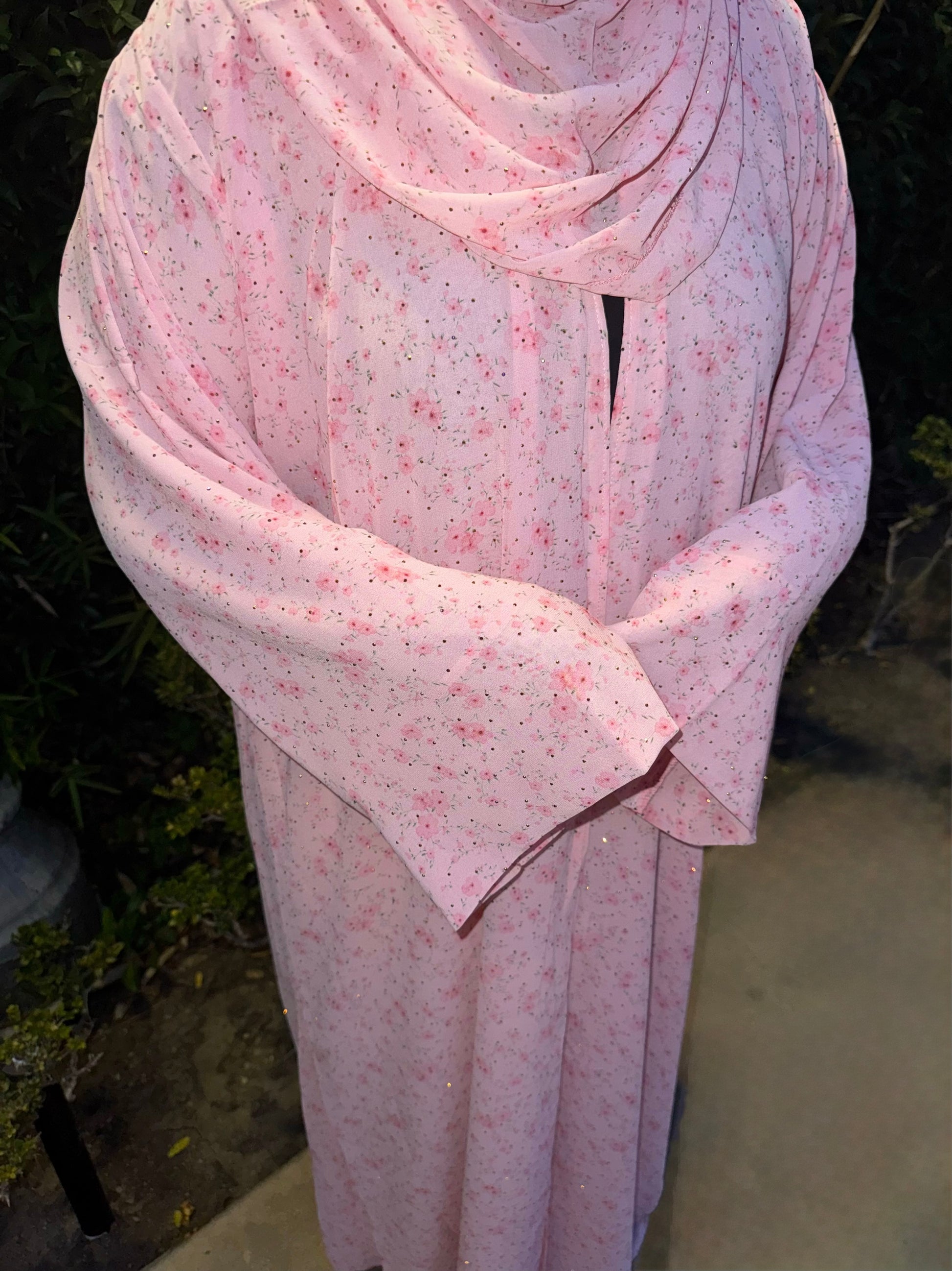 This crystal printed abaya features a soft floral design and a loose, comfortable fit. Made from lightweight chiffon with a chiffon lining to maintain its flow, it comes with a matching hijab in the same printed fabric.