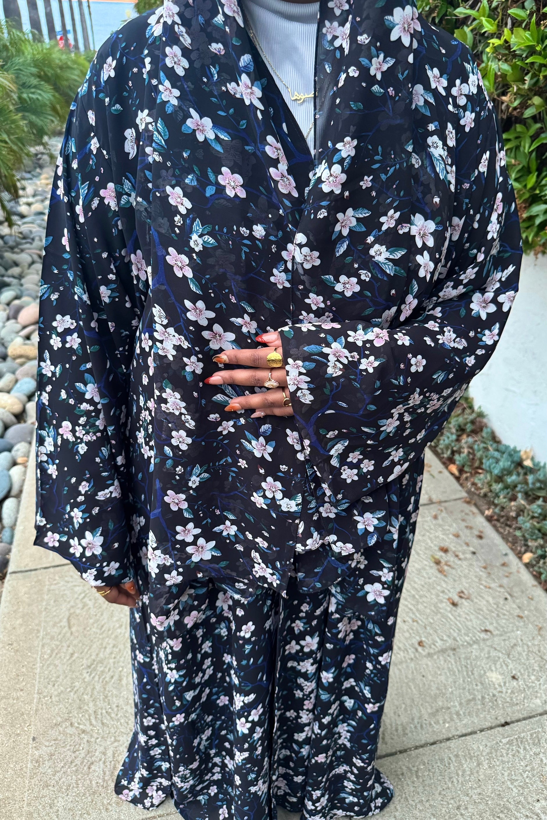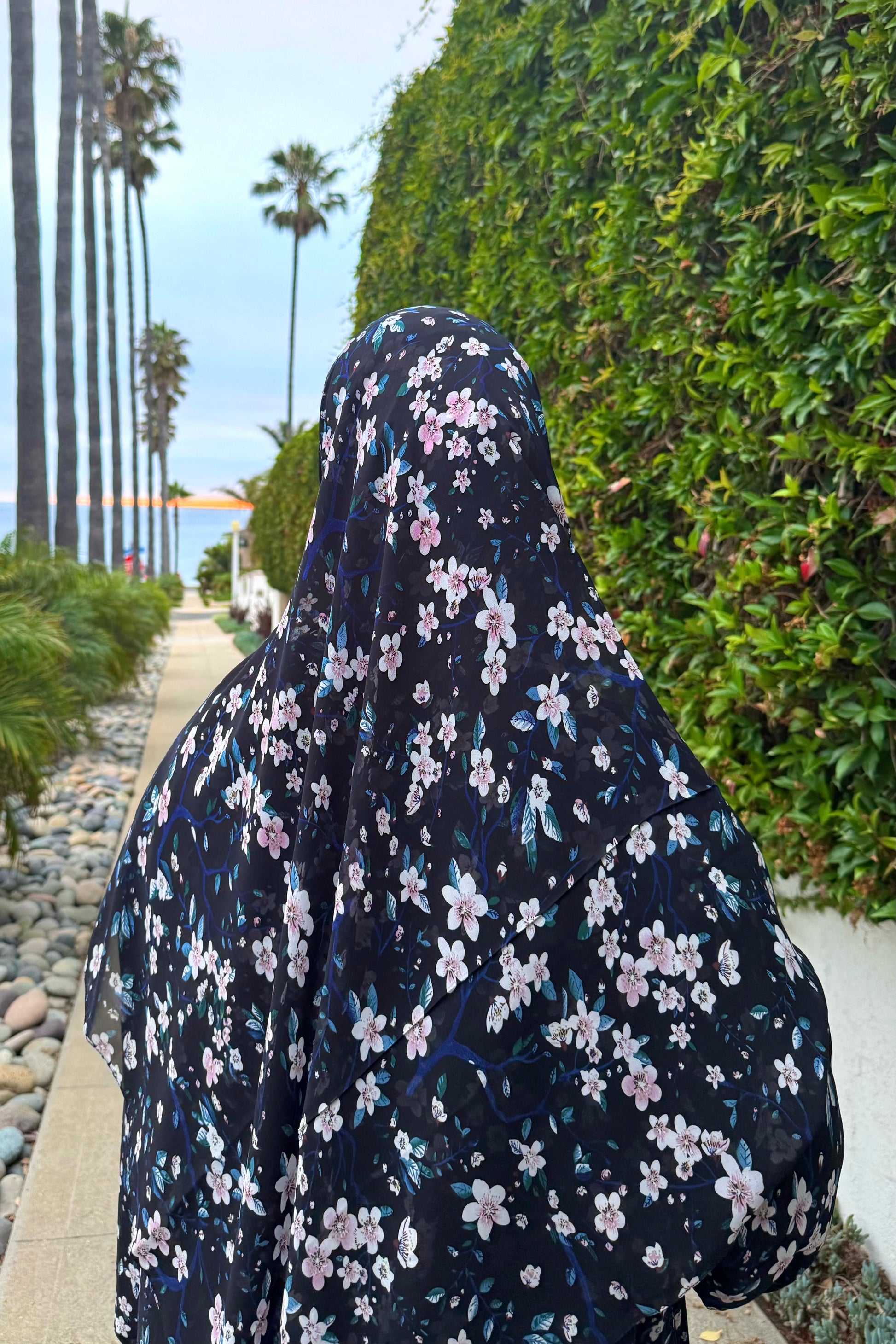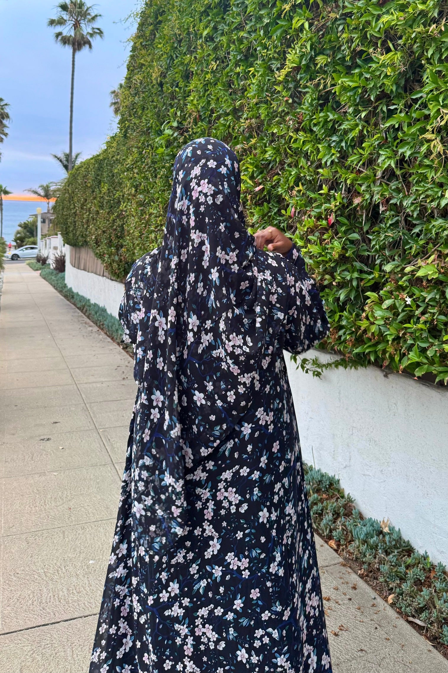 This printed abaya features a floral design and a loose, comfortable fit. Made from lightweight chiffon with a chiffon lining to maintain its flow, it comes with a matching hijab in the same printed fabric.