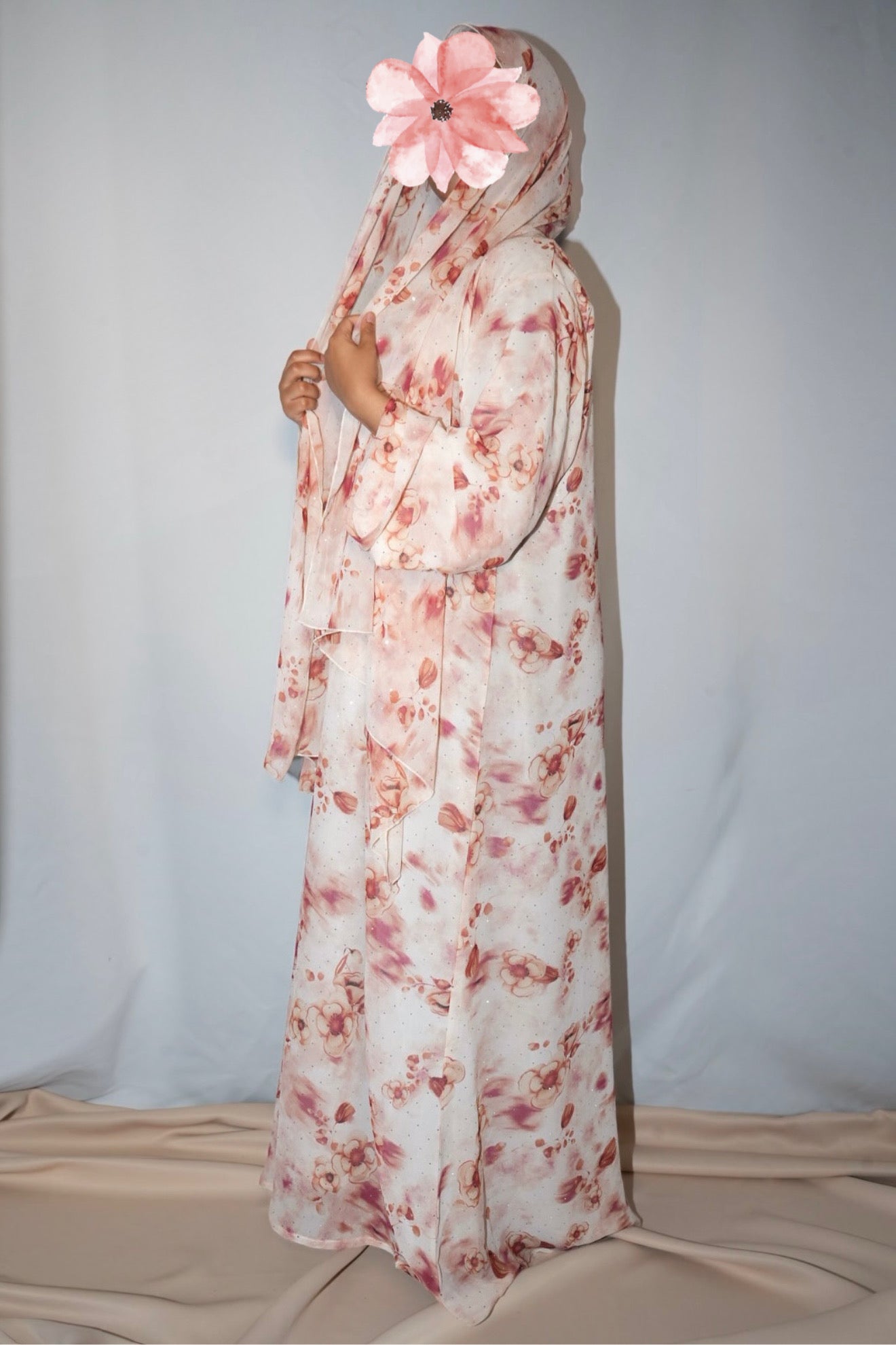 This printed abaya features a loose, comfortable fit with a button attached. Made from lightweight chiffon with a chiffon lining to maintain its flow, it comes with a matching hijab in the same printed fabric.