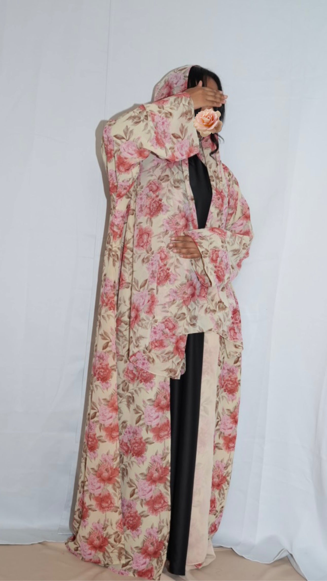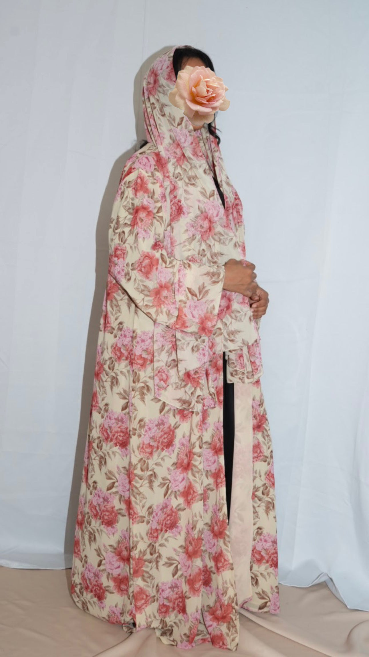 This printed abaya features a loose, comfortable fit with a button attached. Made from lightweight chiffon with a chiffon lining to maintain its flow, it comes with a matching hijab in the same printed fabric.