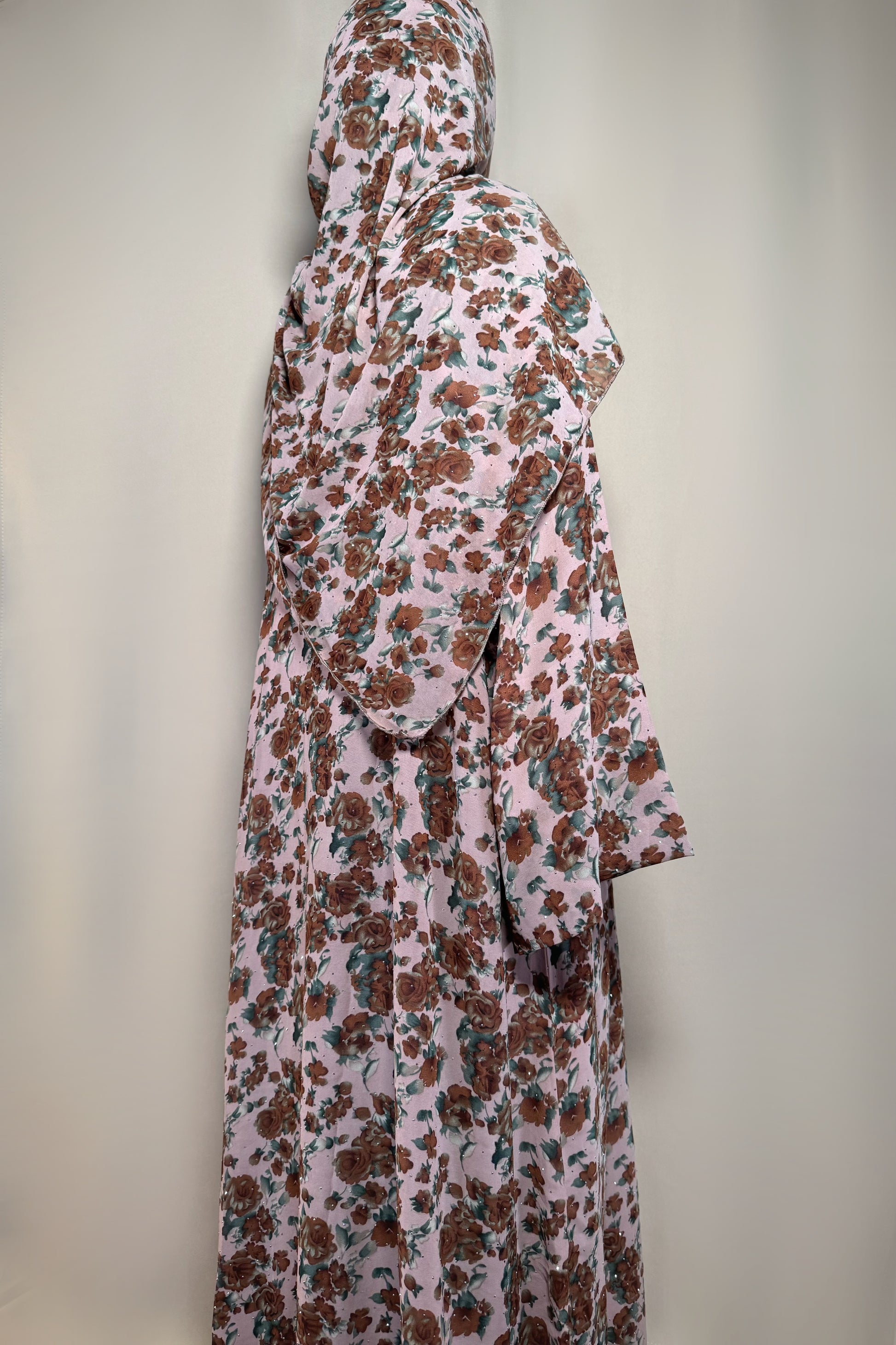This printed abaya features a loose, comfortable fit with a button attached. Made from lightweight chiffon with a chiffon lining to maintain its flow, it comes with a matching hijab in the same printed fabric.