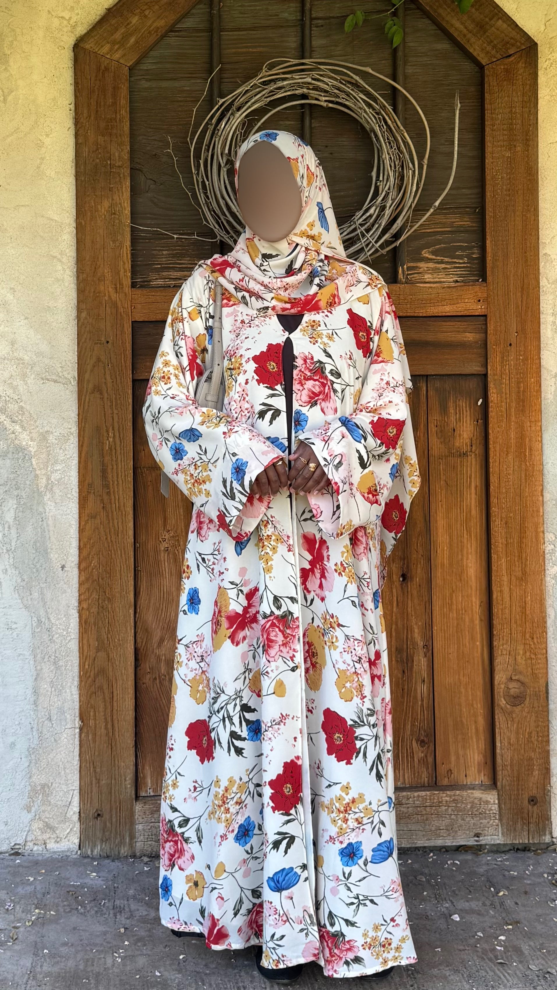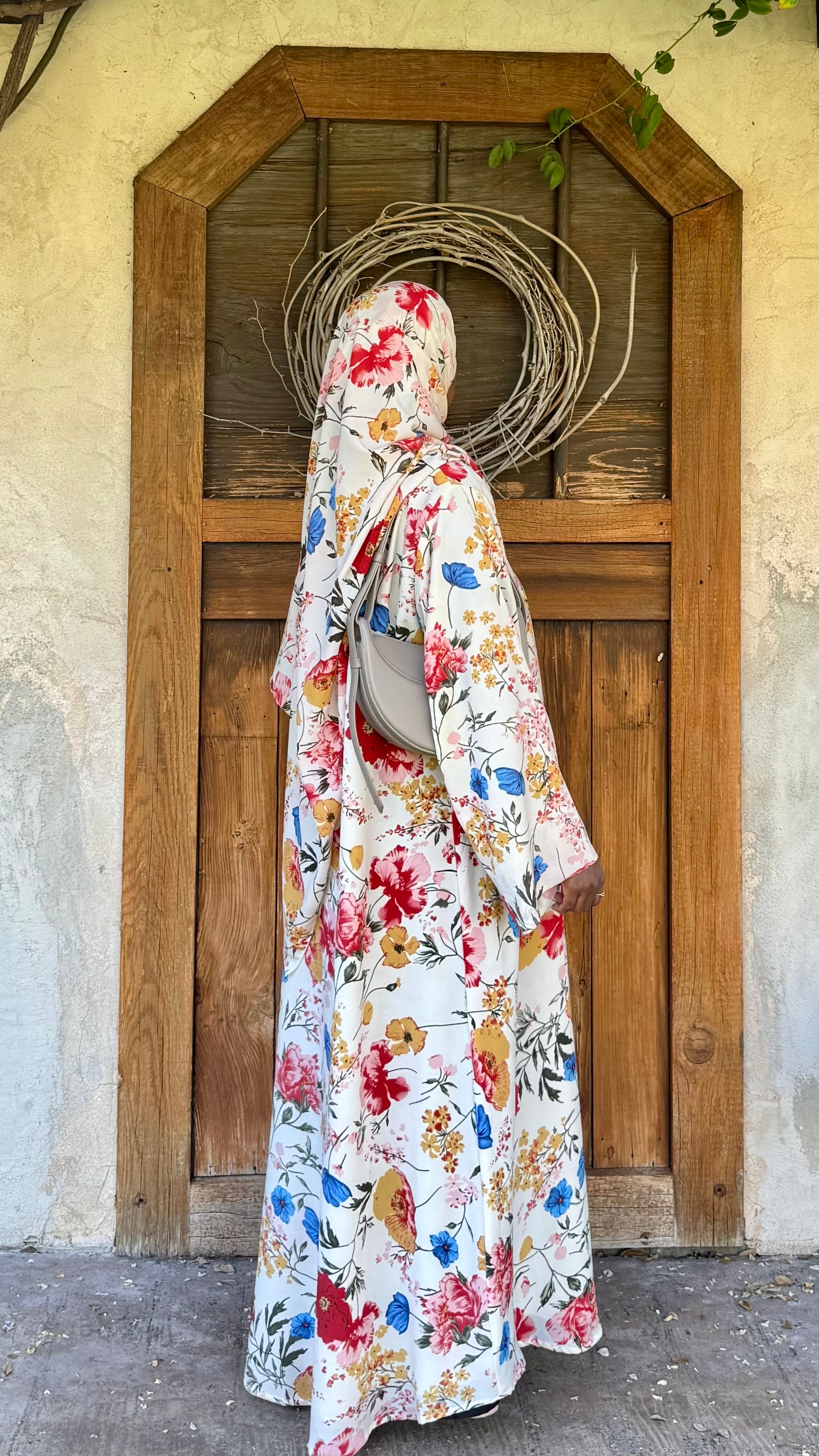 This printed abaya features a loose, comfortable fit with a button attached. Made from lightweight crepe with a chiffon lining to maintain its flow, it comes with a matching hijab in the same printed fabric.