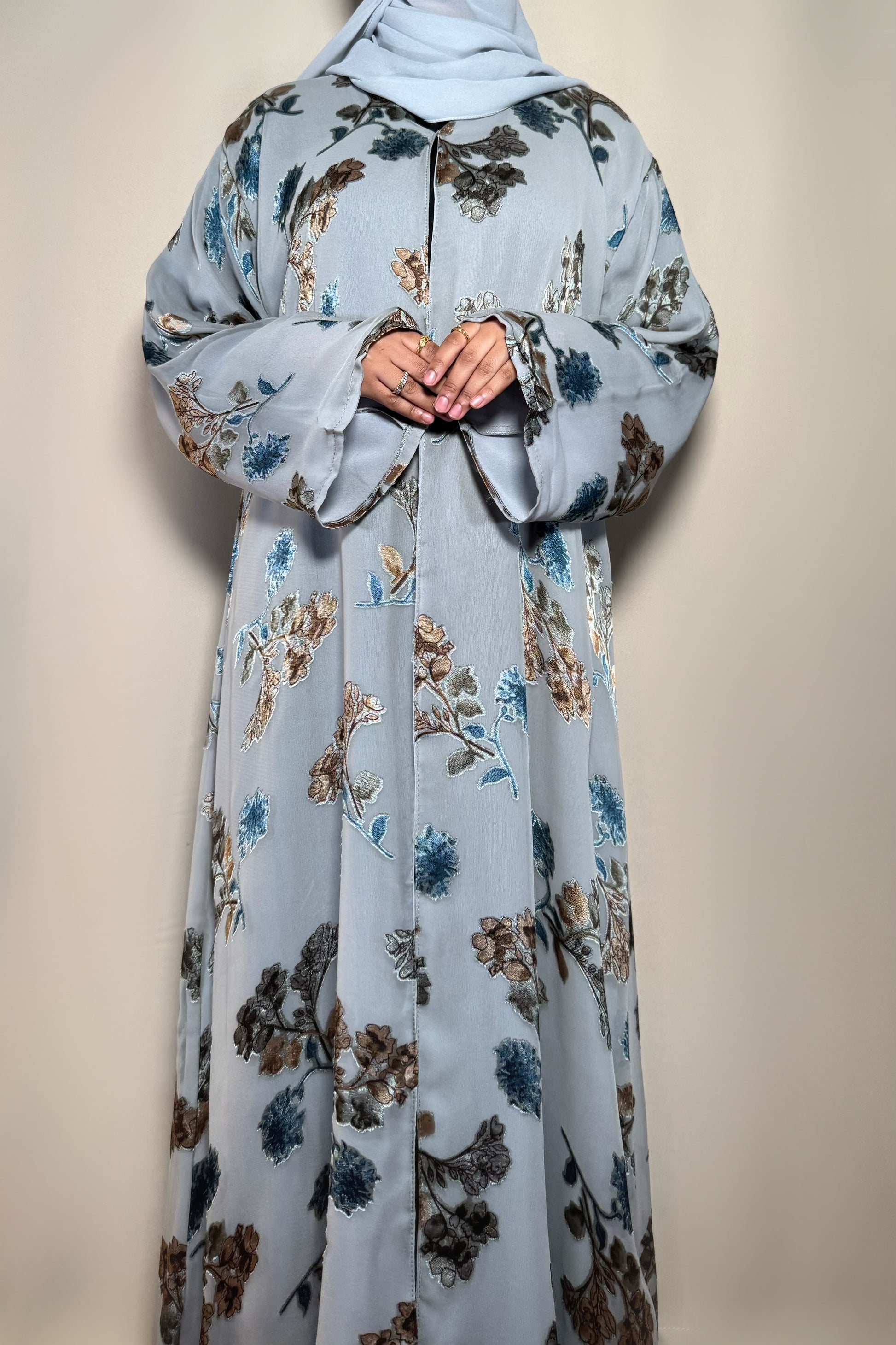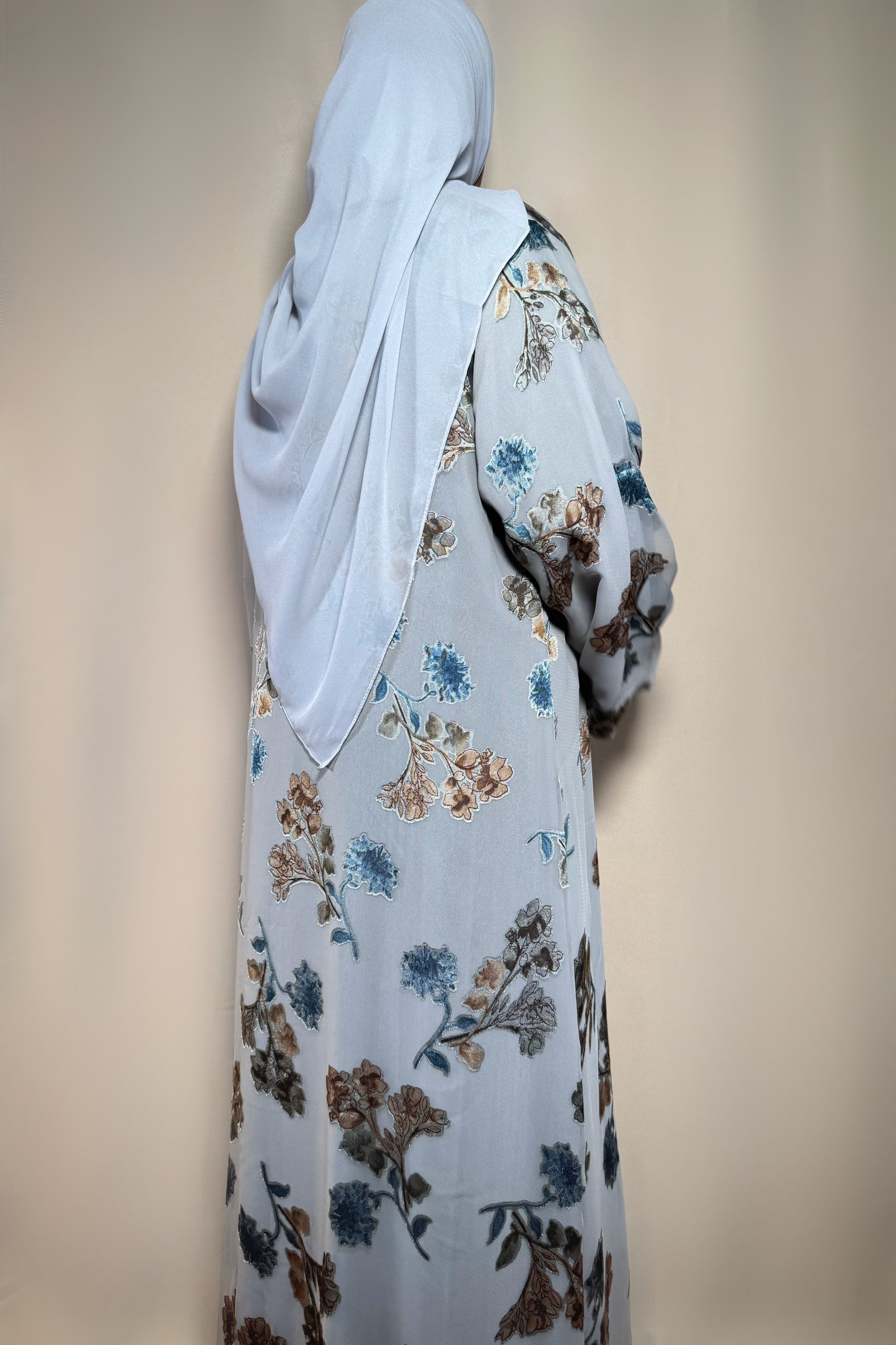 This printed chiffon abaya features a luxurious velvet print and a loose, comfortable fit with a button detail. The lightweight chiffon ensures a soft and flowing movement, and it comes with a matching plain hijab.