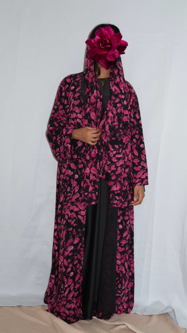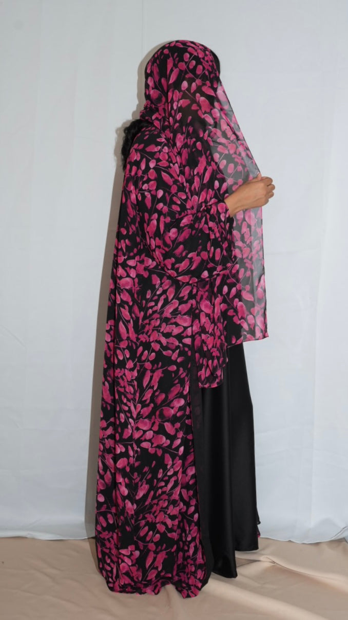 This printed abaya features a loose, comfortable fit with a button attached. Made from lightweight chiffon with a chiffon lining to maintain its flow, it comes with a matching hijab in the same printed fabric.