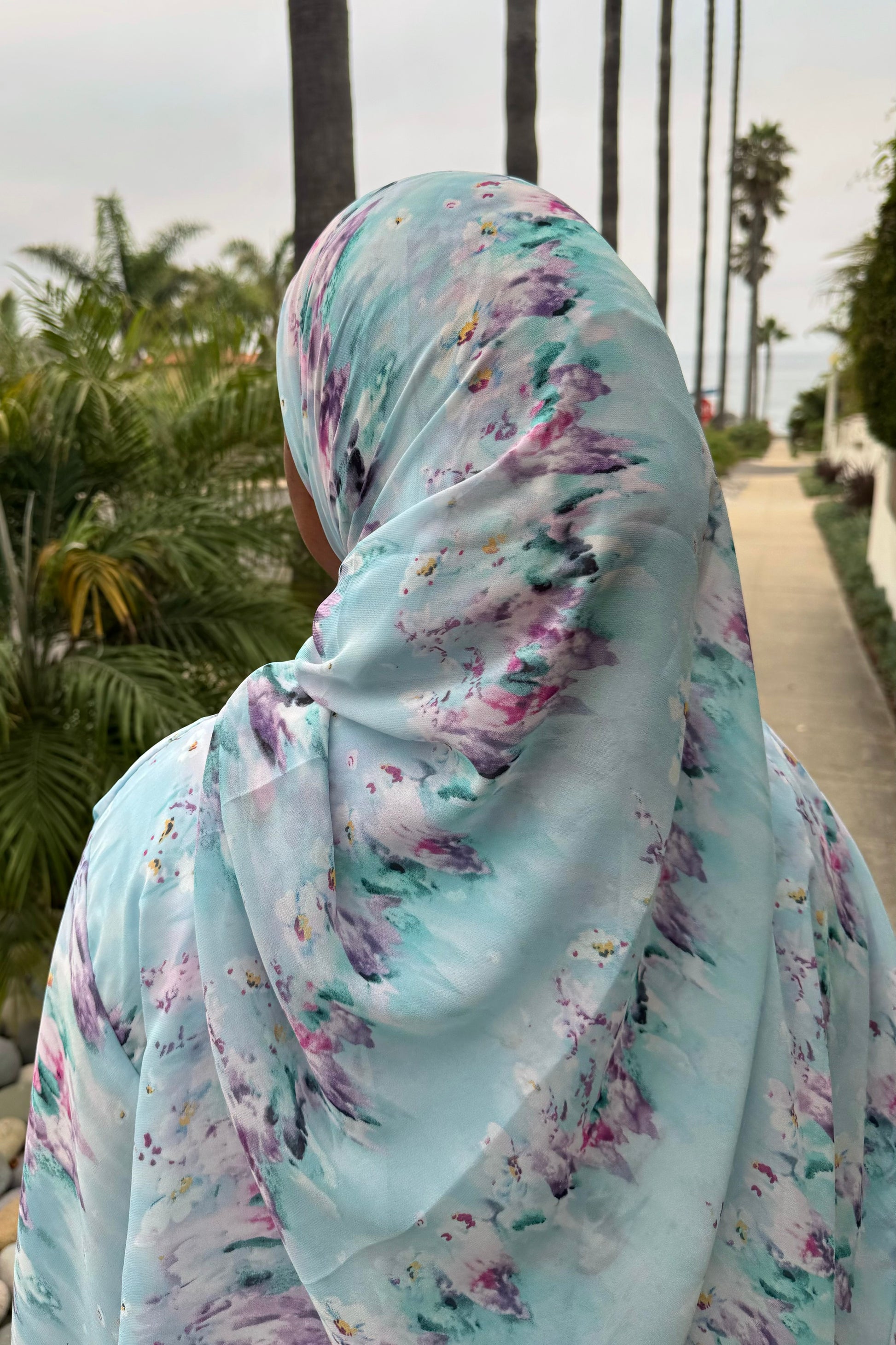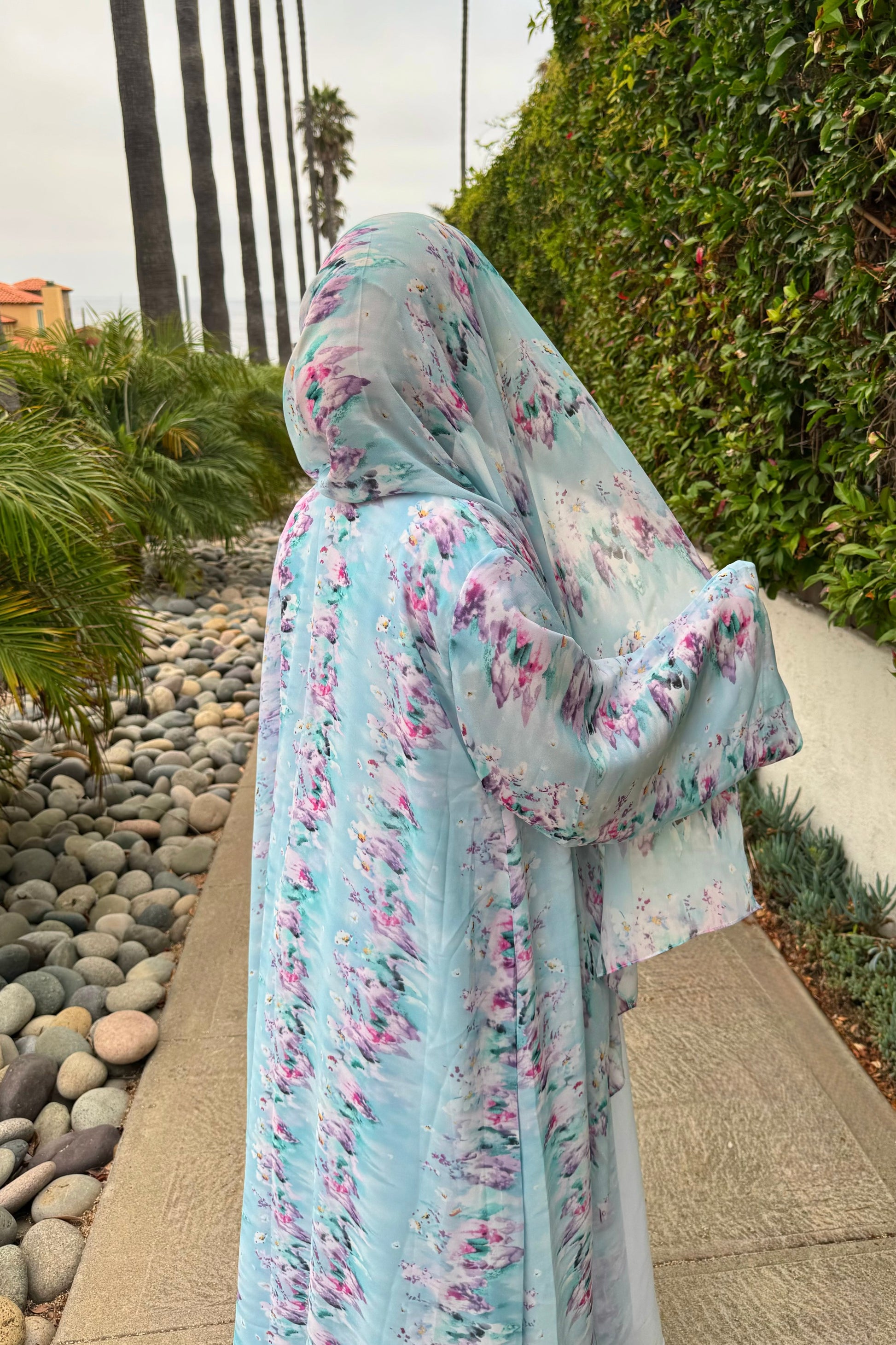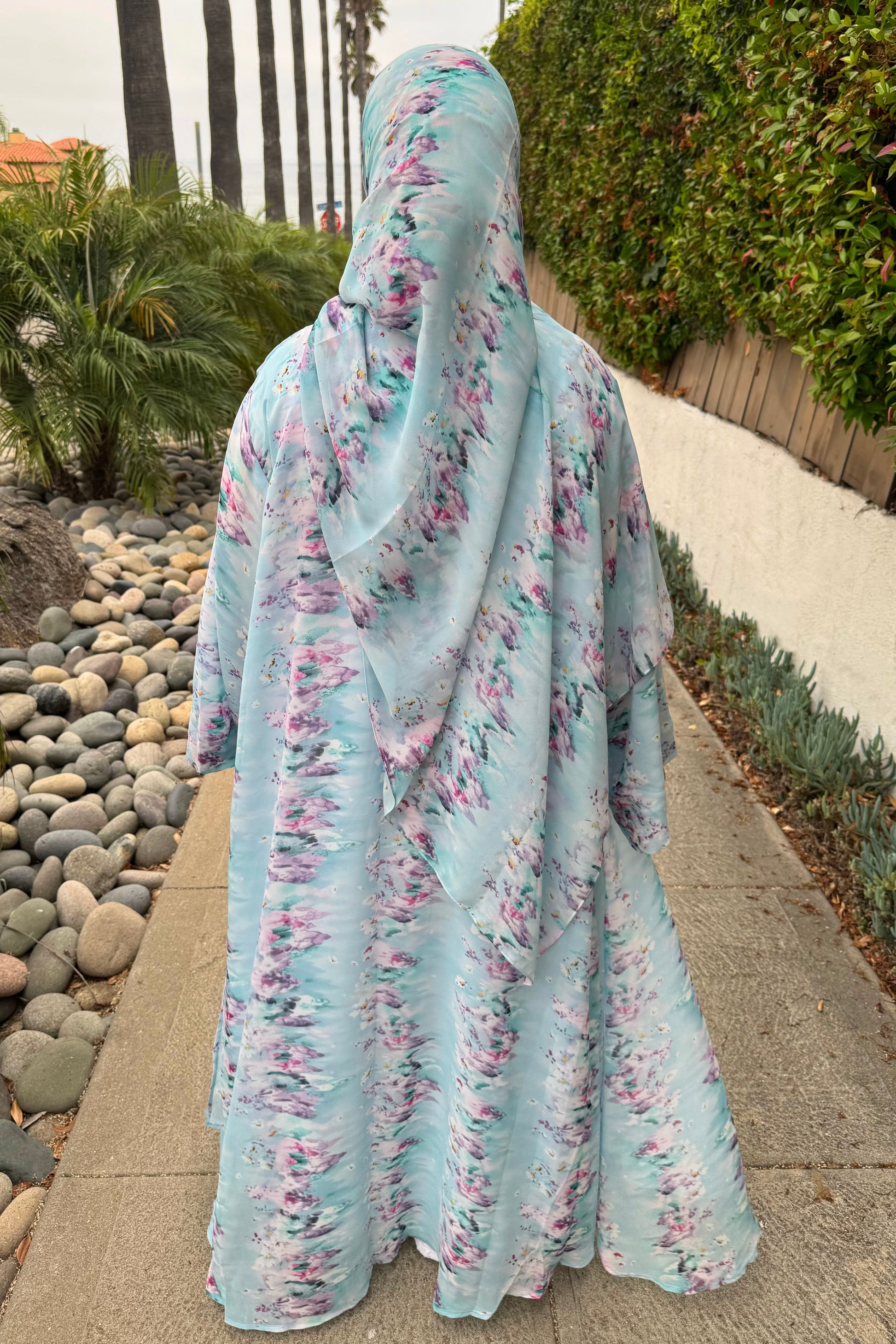 This printed abaya features a soft floral design and a loose, comfortable fit. Made from lightweight chiffon with a chiffon lining to maintain its flow, it comes with a matching hijab in the same printed fabric.