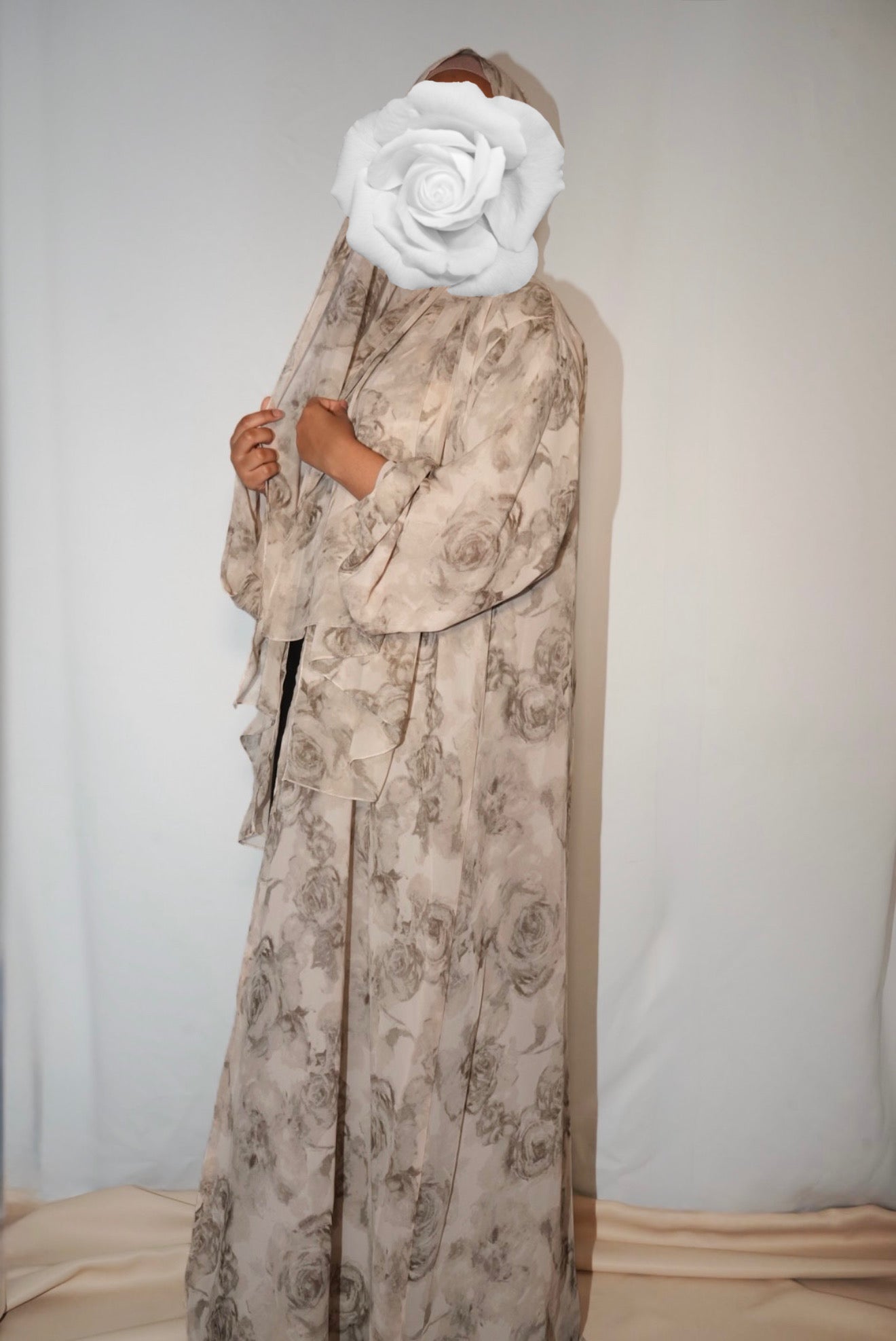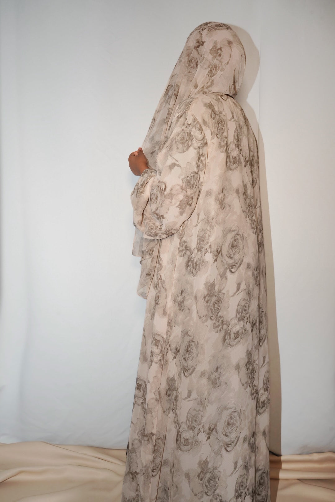 This printed abaya features a loose, comfortable fit with a button attached. Made from lightweight chiffon with a chiffon lining to maintain its flow, it comes with a matching hijab in the same printed fabric.
