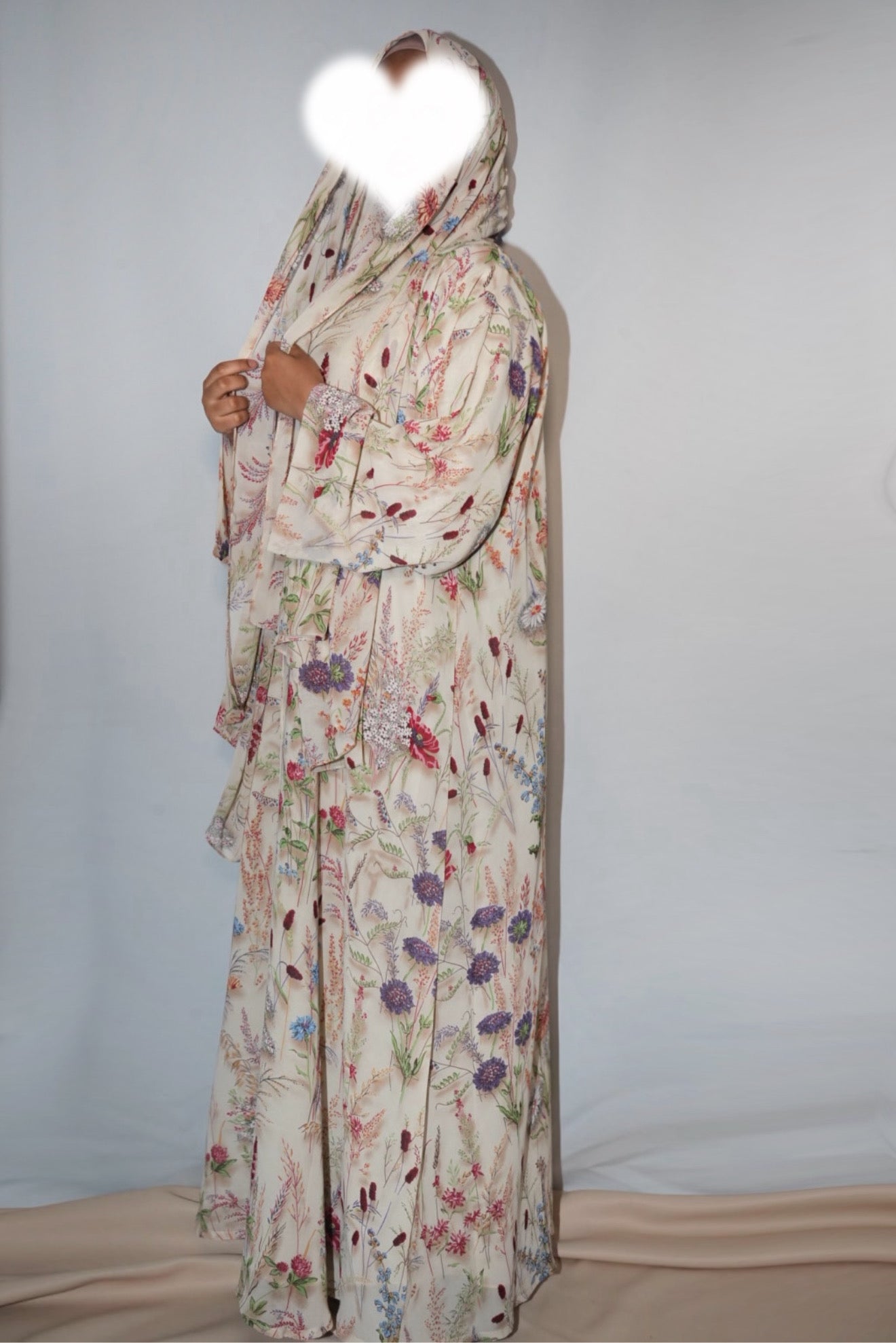 This printed abaya features a loose, comfortable fit with a button attached. Made from lightweight crepe with a chiffon lining to maintain its flow, it comes with a matching hijab in the same printed fabric.