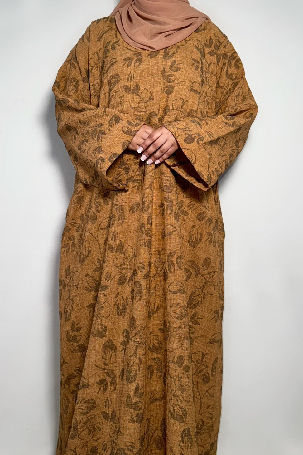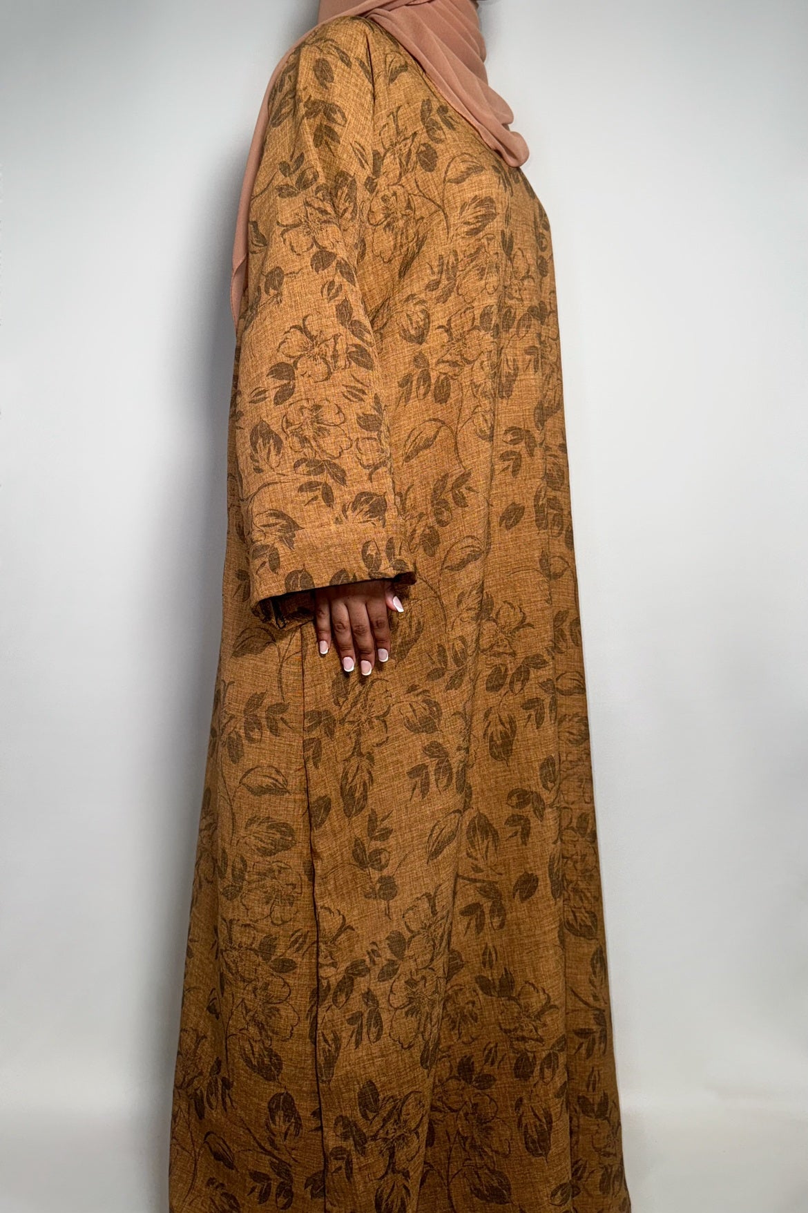 This closed linen abaya offers a straight fit and is designed with convenient pockets. It also features a beautiful floral print.