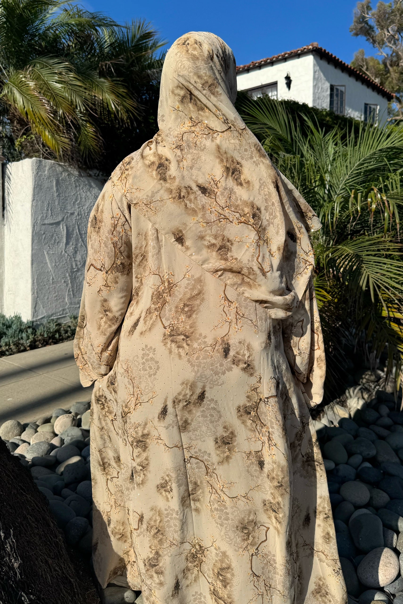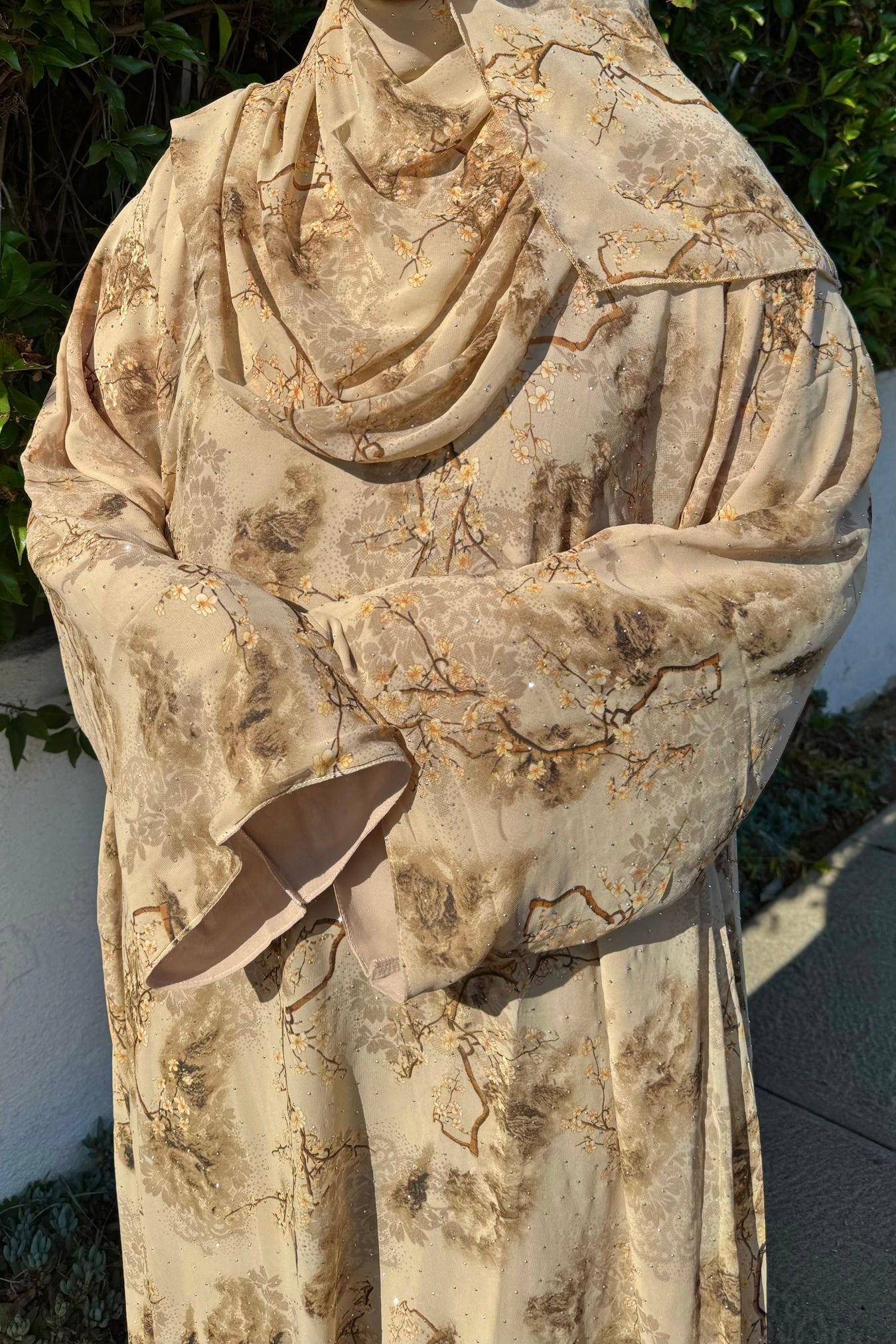 This closed printed abaya features a floral design and a loose, comfortable fit. Made from lightweight chiffon with a chiffon lining to maintain its flow, it comes with a matching hijab in the same printed fabric.