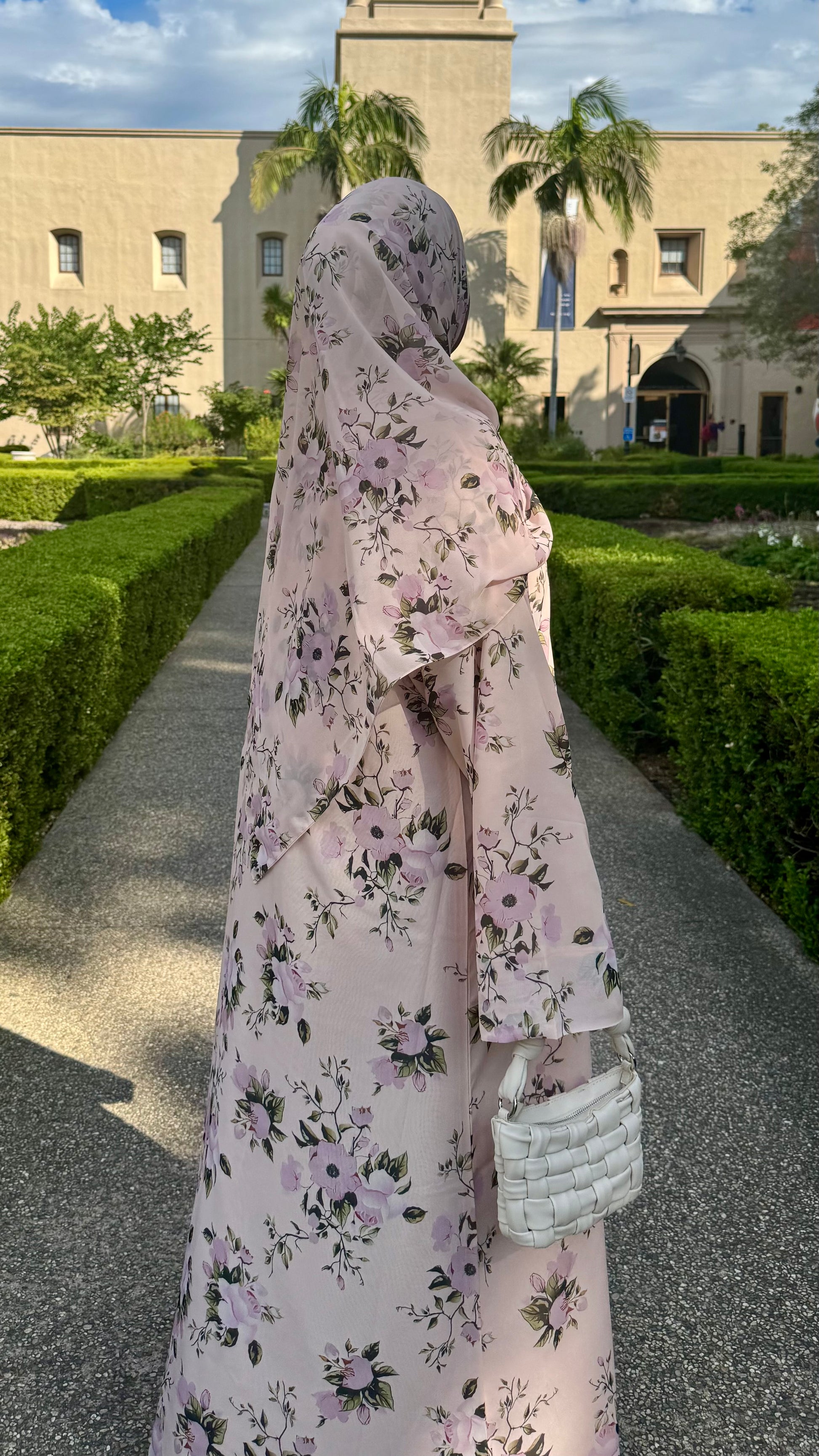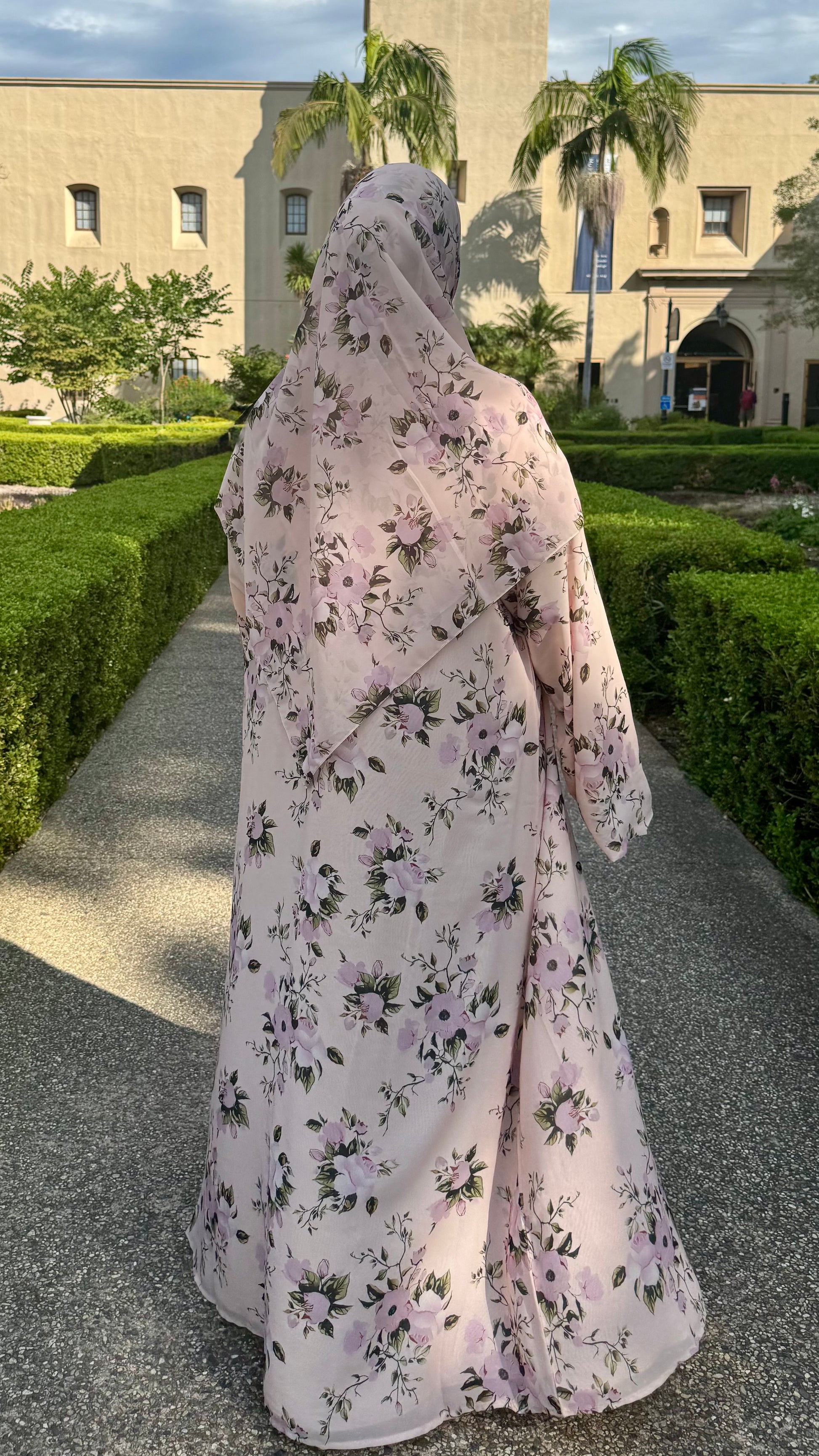 This printed abaya features a loose, comfortable fit with a button attached. Made from lightweight chiffon with a chiffon lining to maintain its flow, it comes with a matching hijab in the same printed fabric.