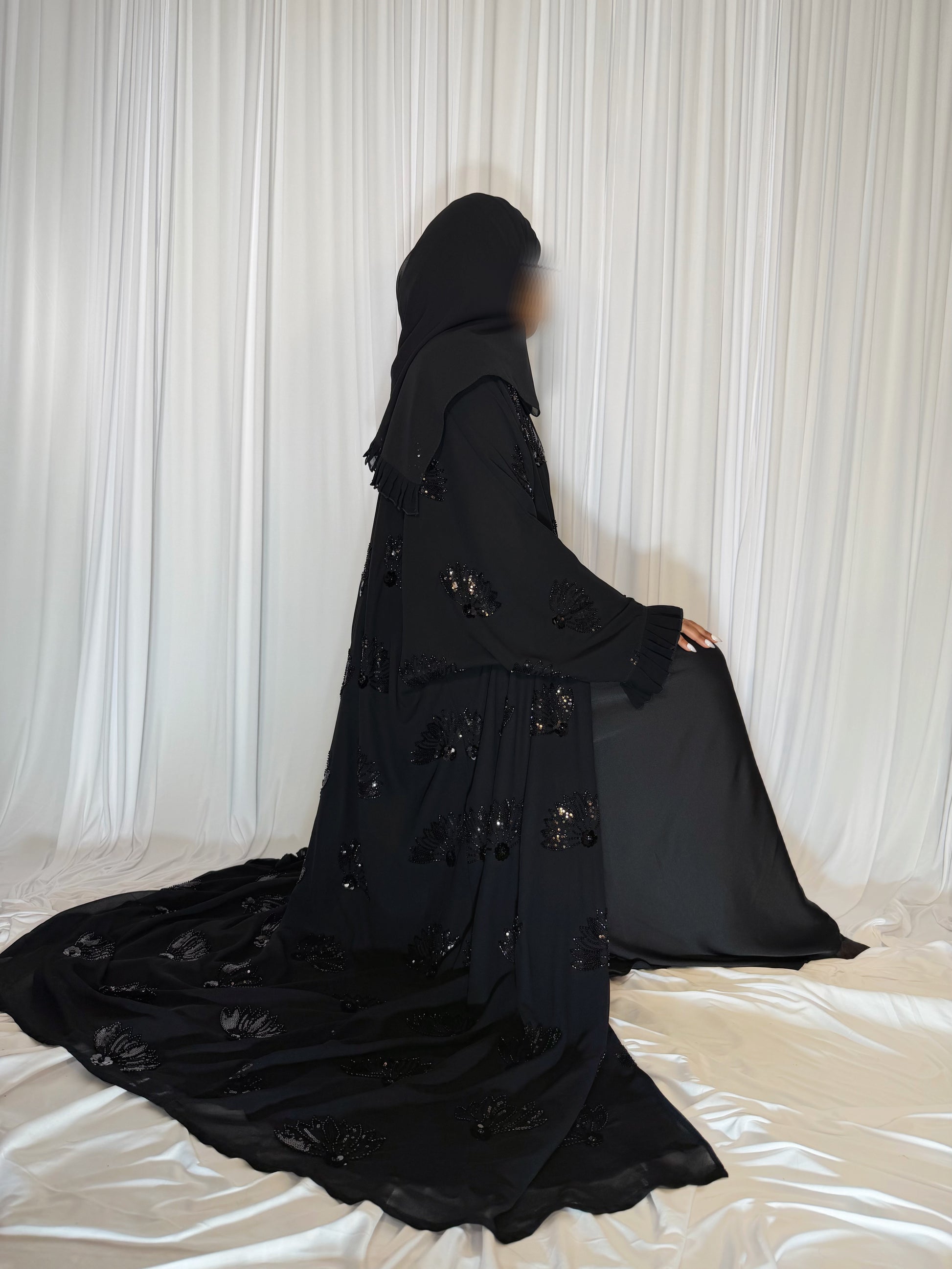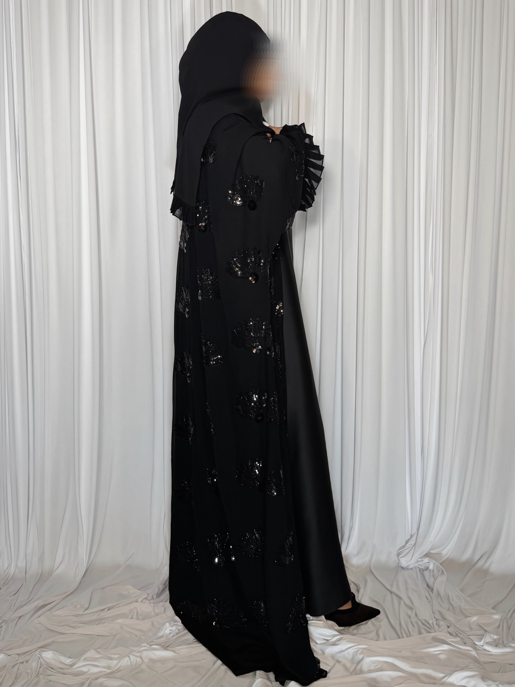 A Bahrain-style abaya adorned with subtle sparkles from delicate sequins and hand-applied beading. Designed with ruffled, pleated cuffs for a soft statement and a matching hijab finished with a ruffled pleated border.