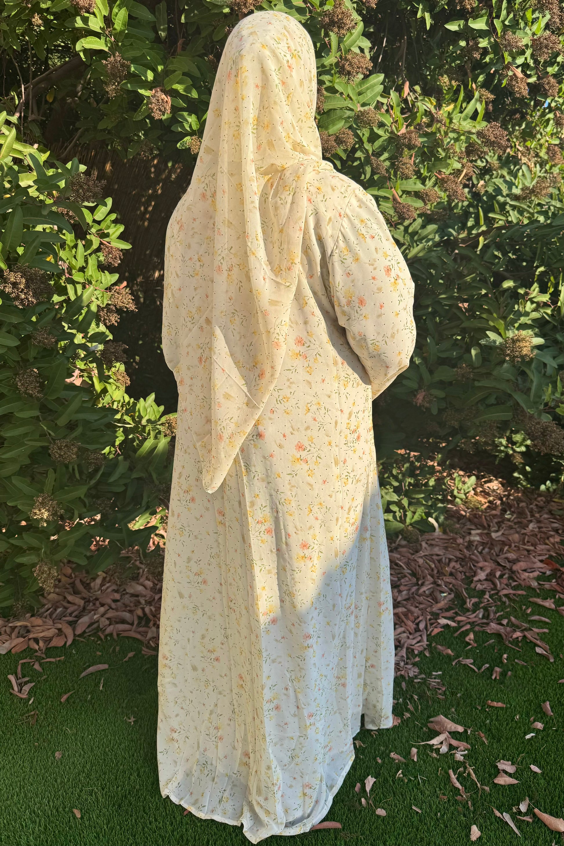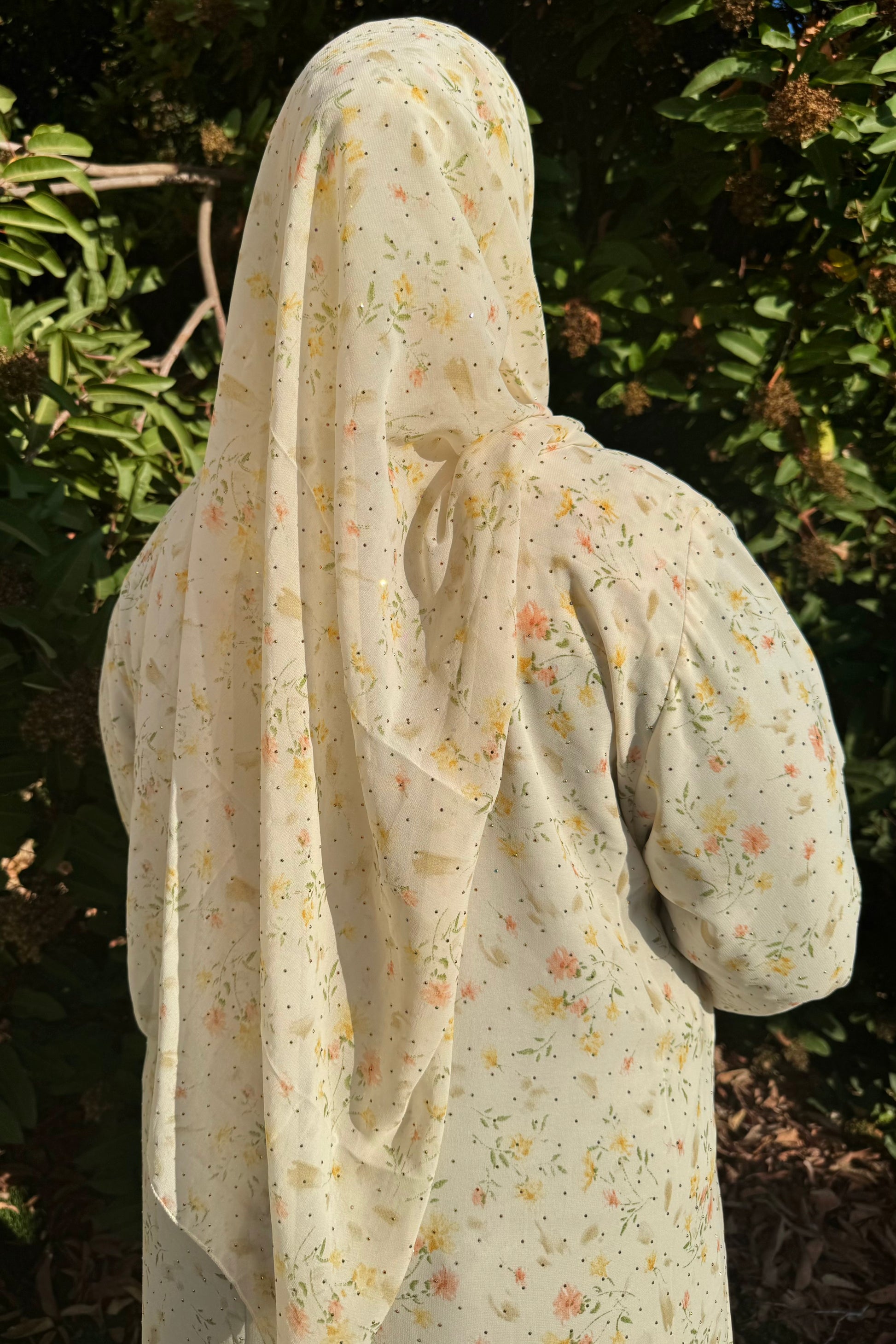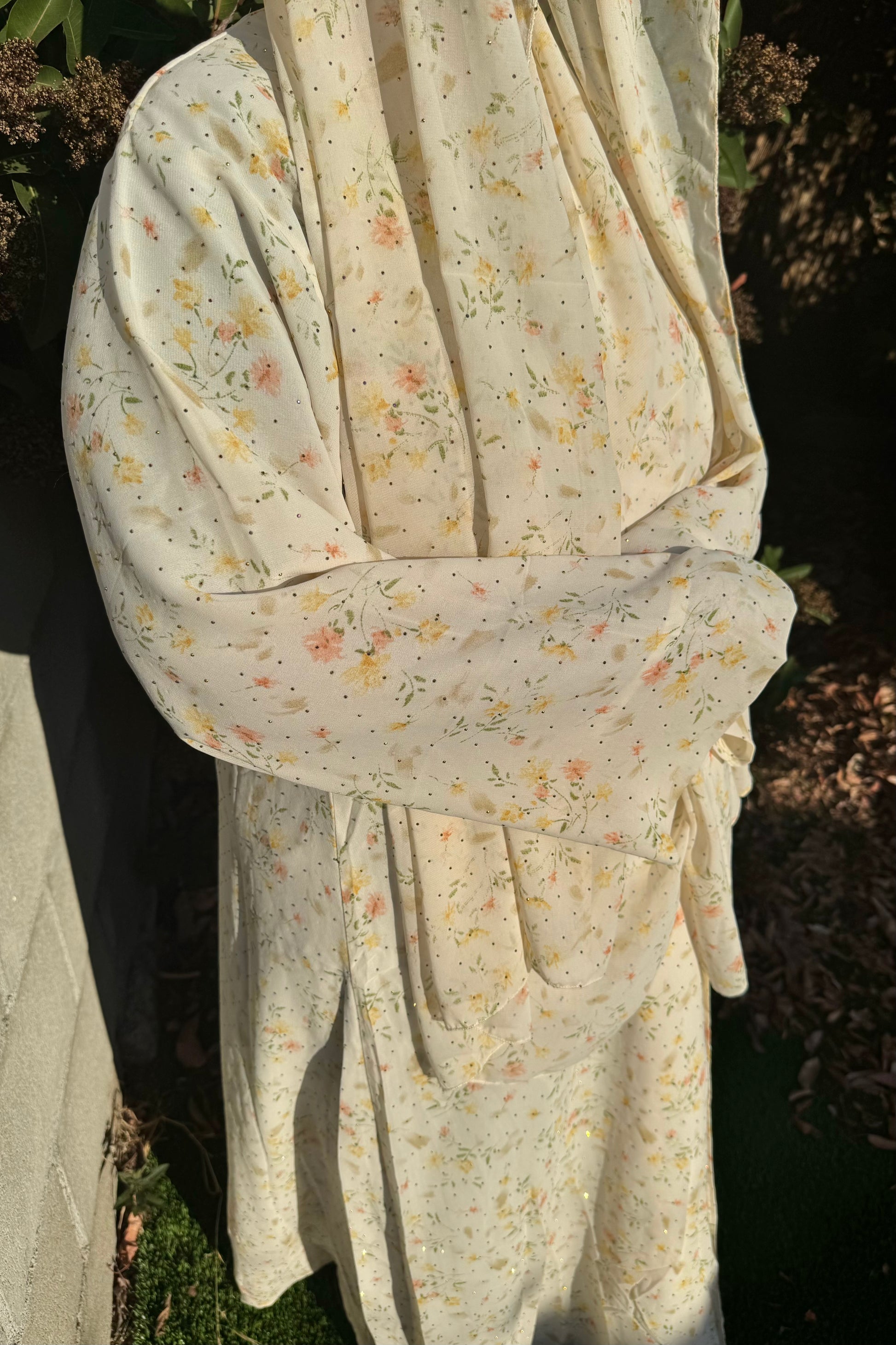 This crystal printed abaya features a soft floral design and a loose, comfortable fit. Made from lightweight chiffon with a chiffon lining to maintain its flow, it comes with a matching hijab in the same printed fabric.