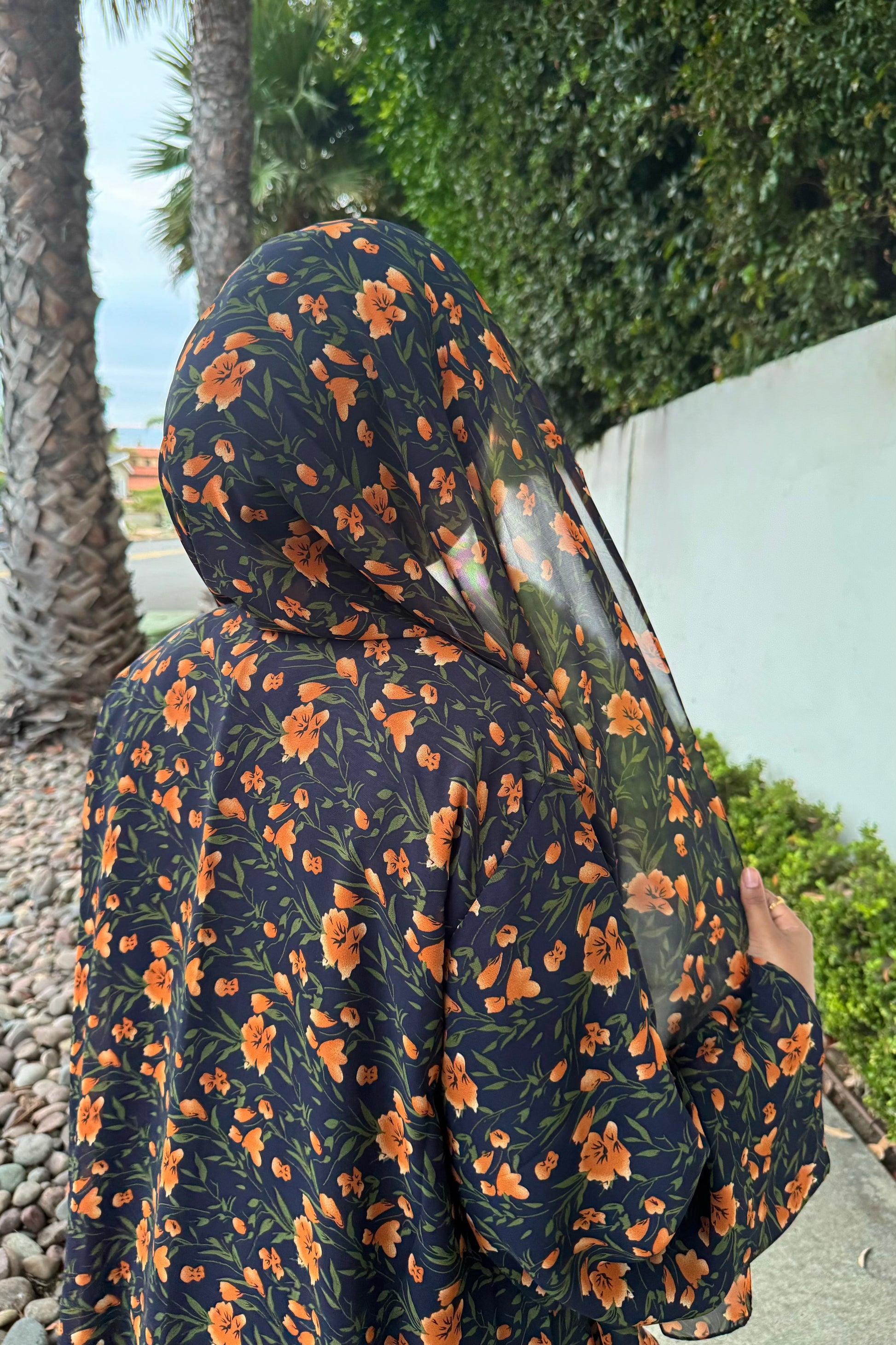 This printed abaya features a floral design and a loose, comfortable fit. Made from lightweight chiffon with a chiffon lining to maintain its flow, it comes with a matching hijab in the same printed fabric.