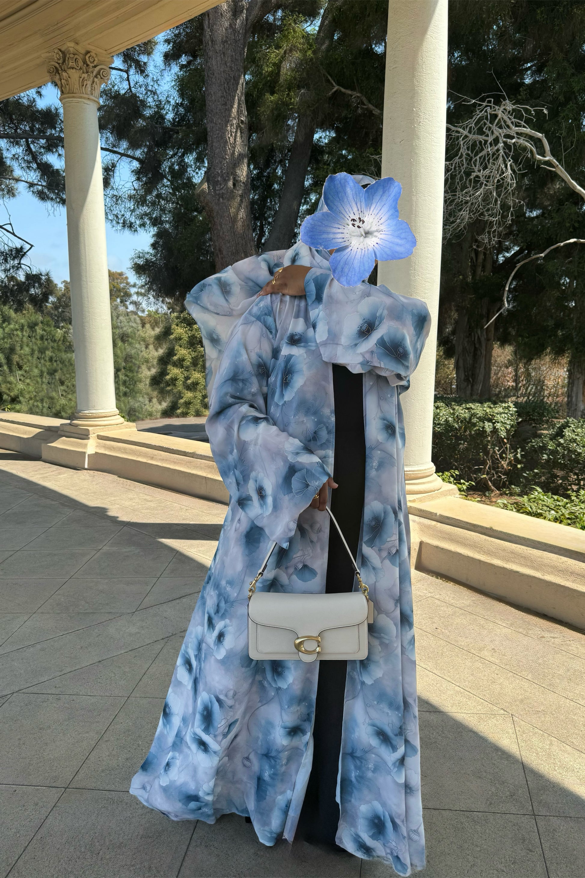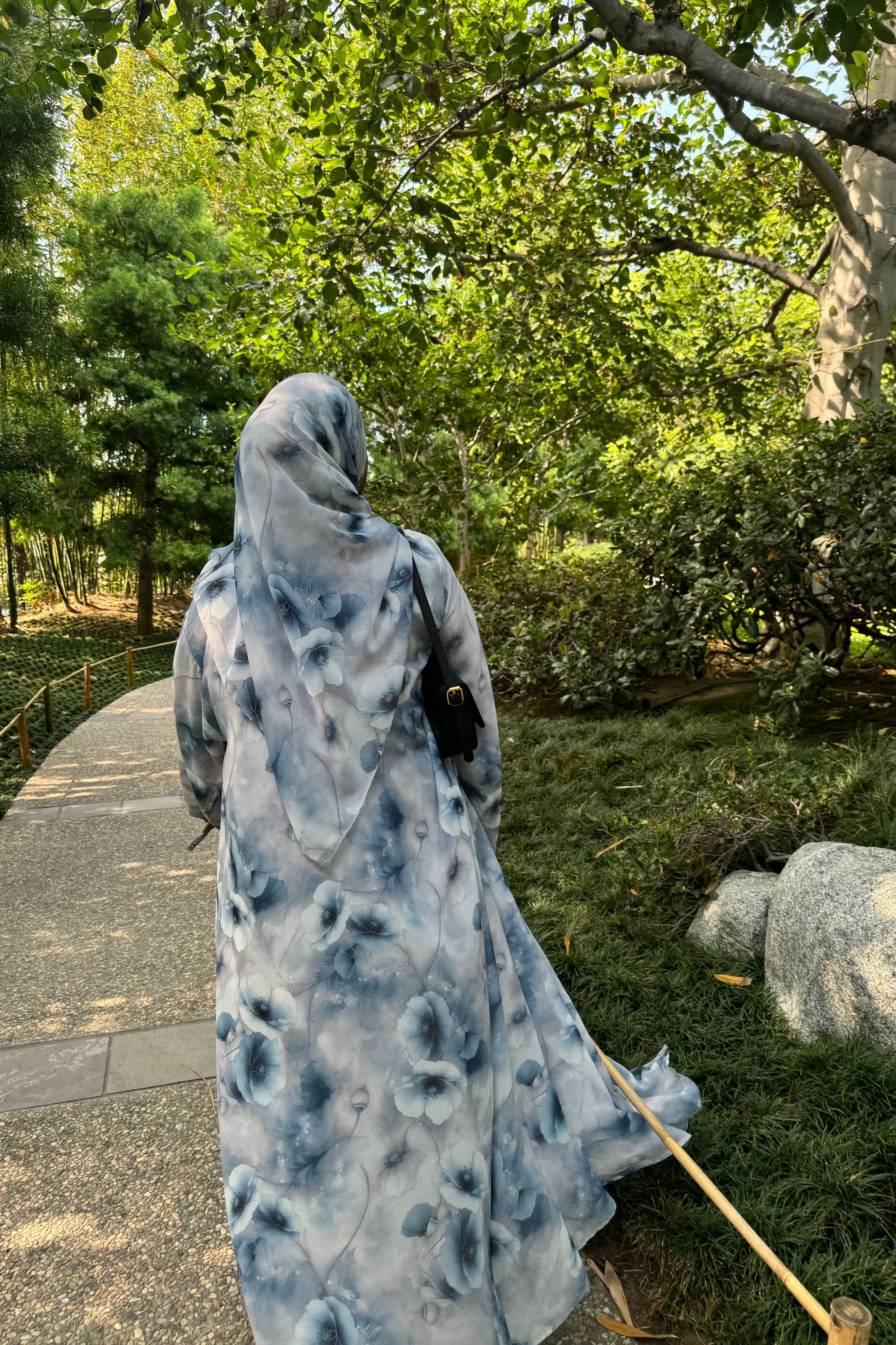 This printed abaya features a floral design with metallic threading and a loose, comfortable fit. Made from lightweight chiffon with a chiffon lining to maintain its flow, it comes with a matching hijab in the same printed fabric.