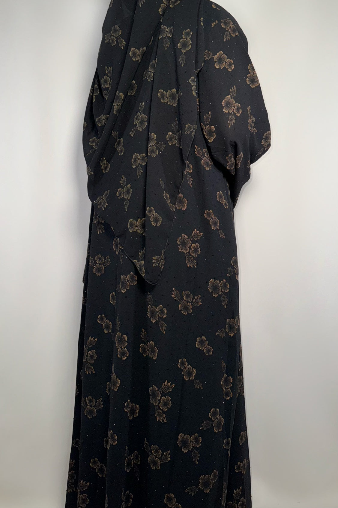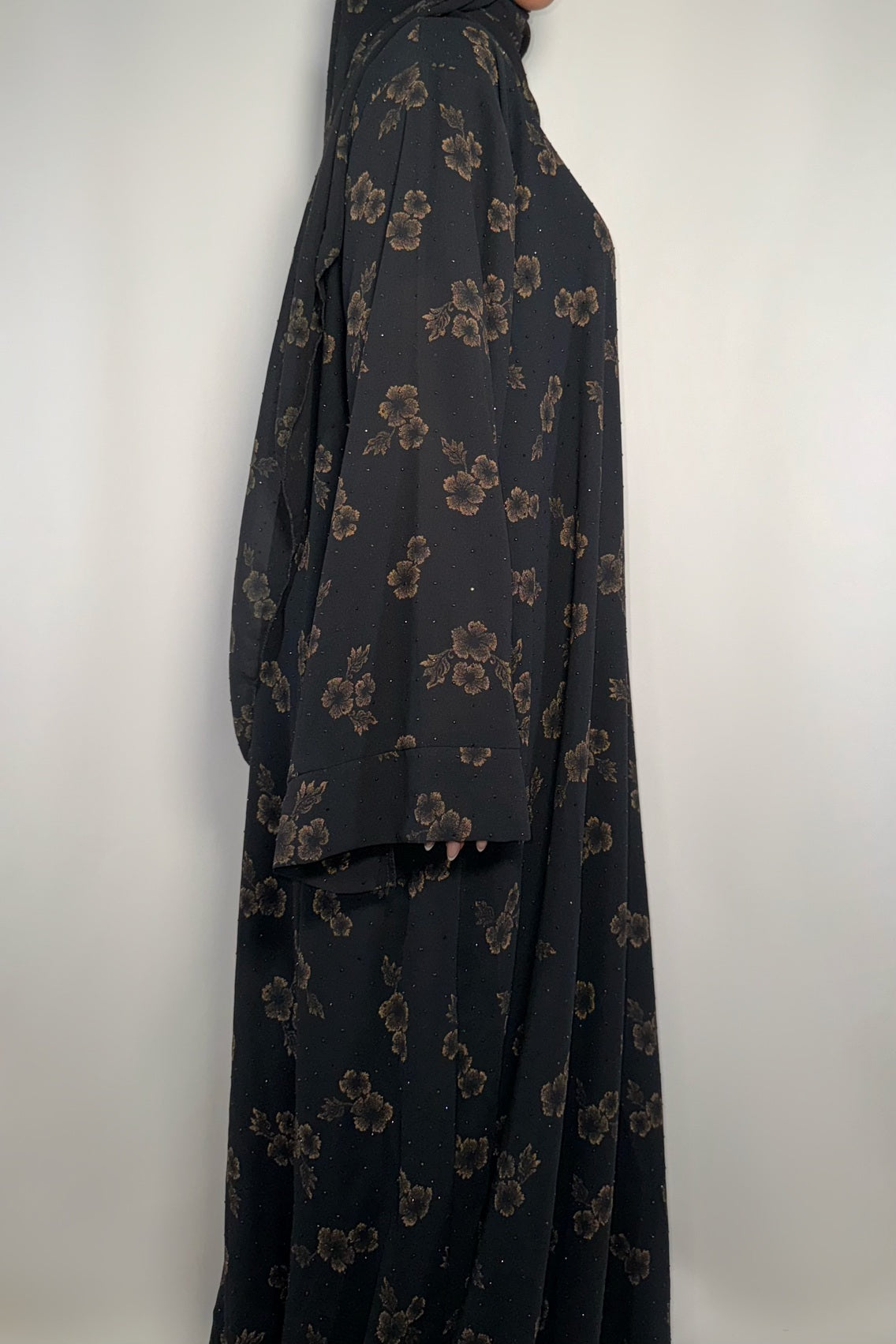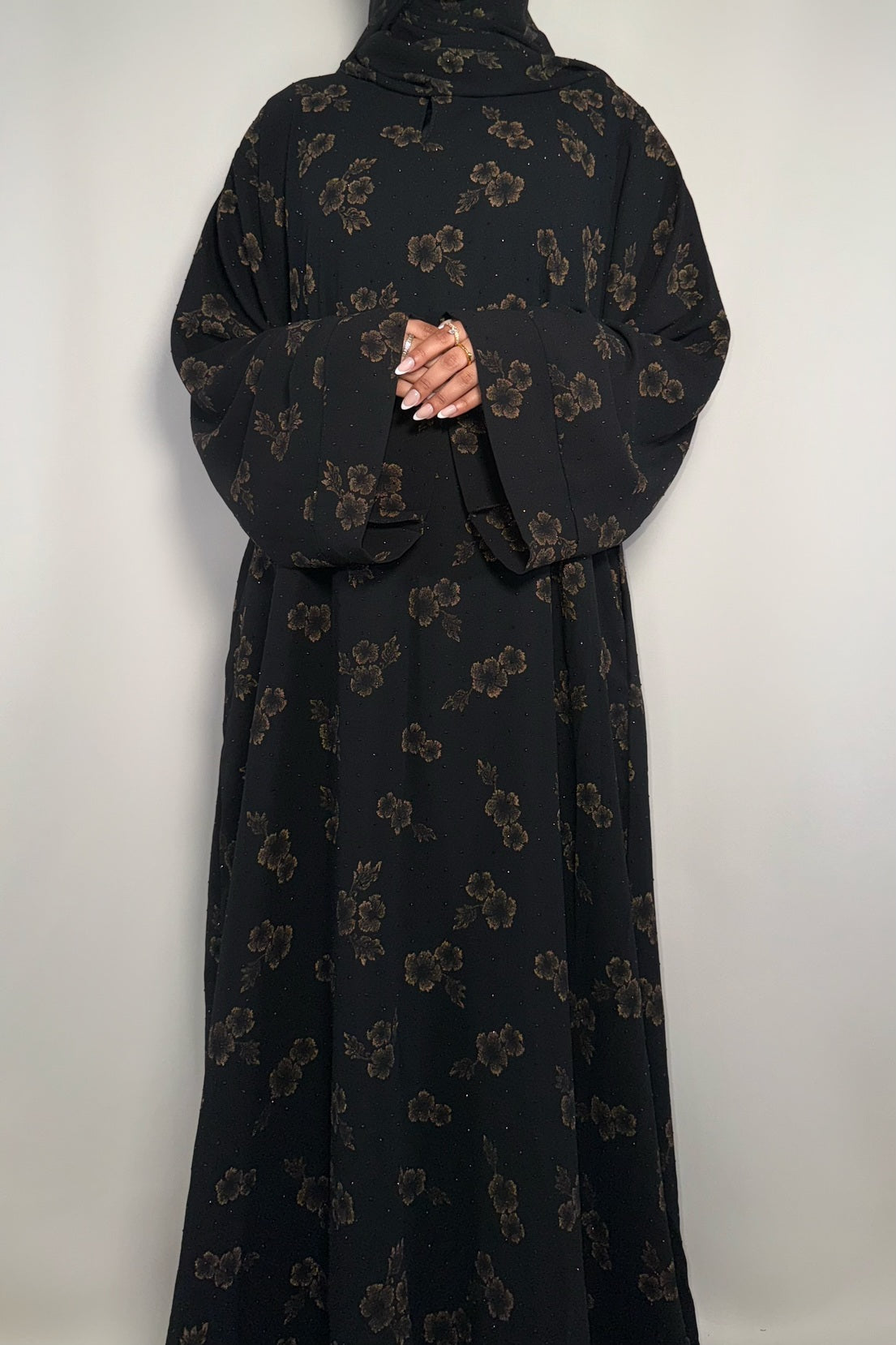 This black double-layered chiffon abaya features a colorful shimmer print and sparkling stones throughout. It is a closed abaya that has pockets for functionality, and comes with a matching hijab for a coordinated look.