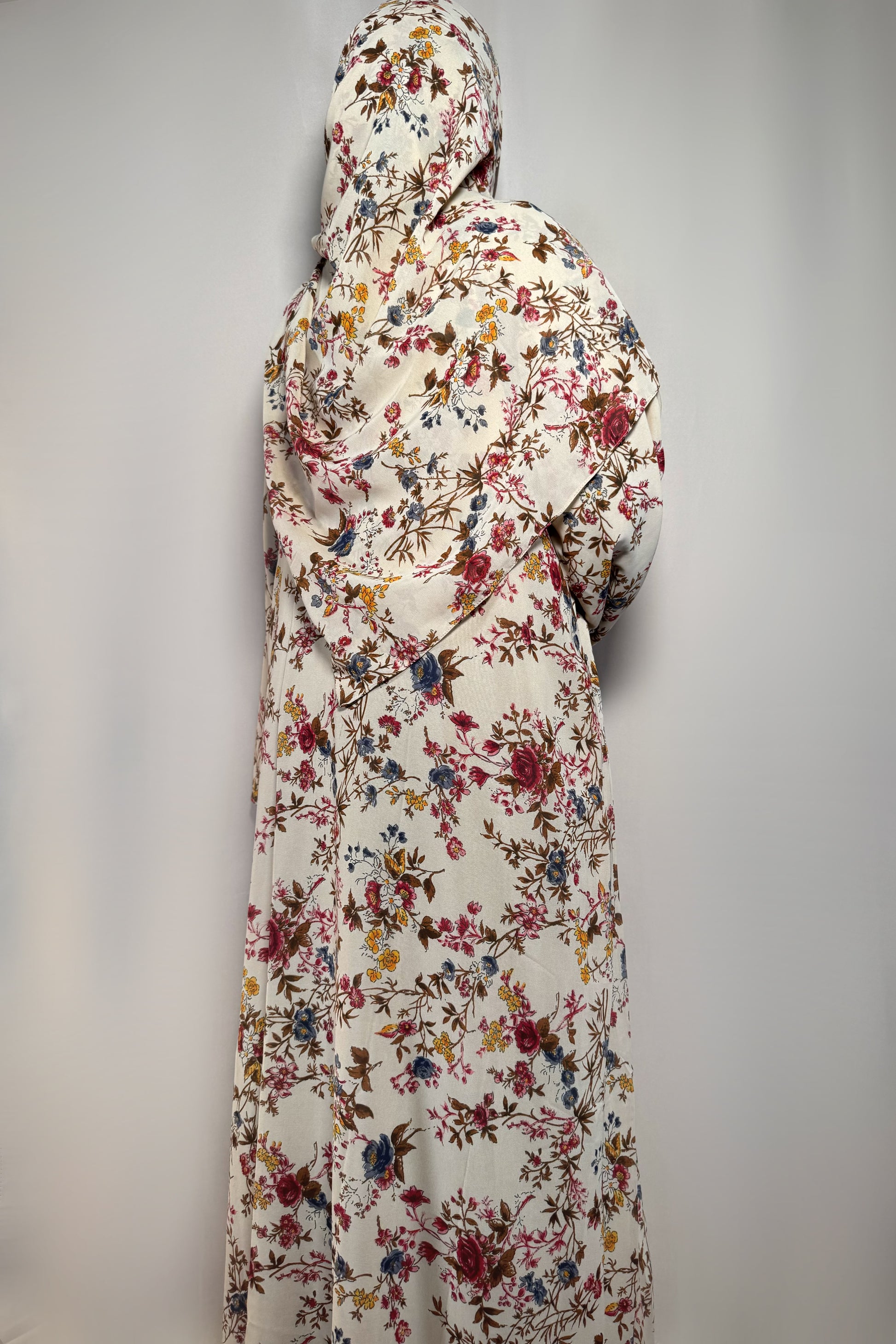 This printed abaya features a loose, comfortable fit with a button attached. Made from lightweight chiffon with a chiffon lining to maintain its flow, it comes with a matching hijab in the same printed fabric.