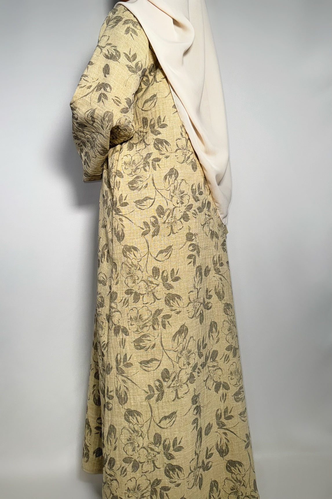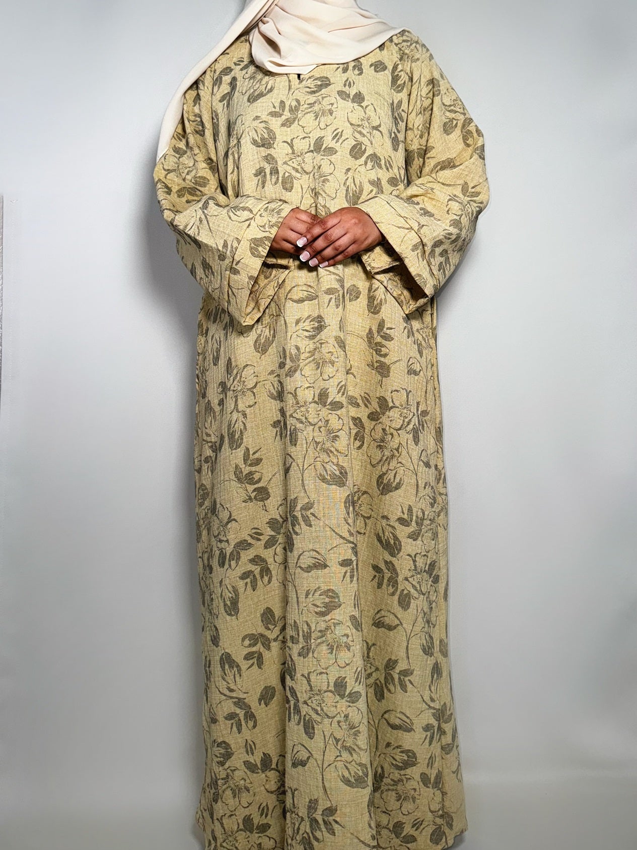 This closed linen abaya offers a straight fit and is designed with convenient pockets. It also features a beautiful floral print.