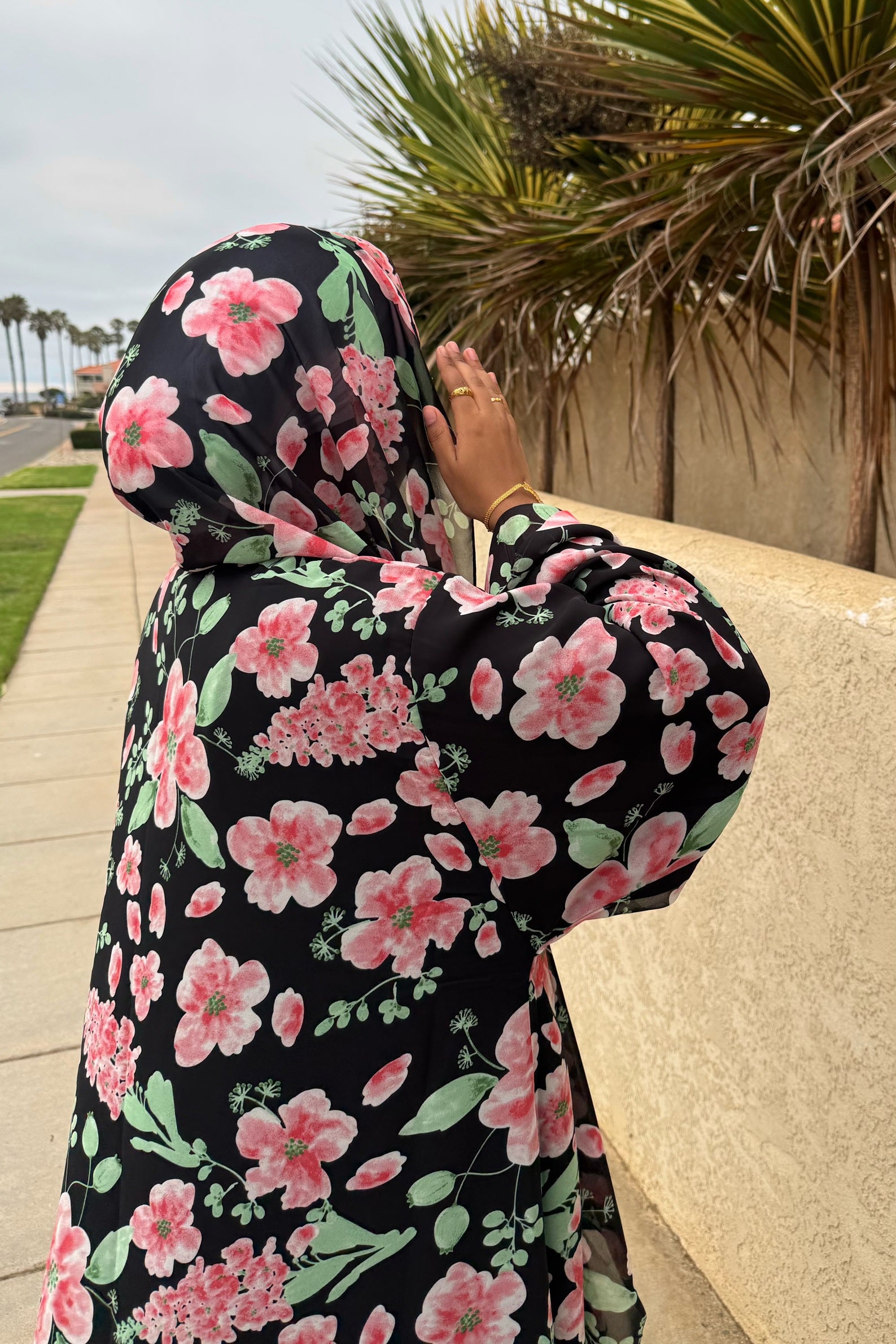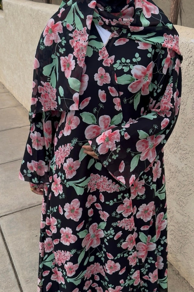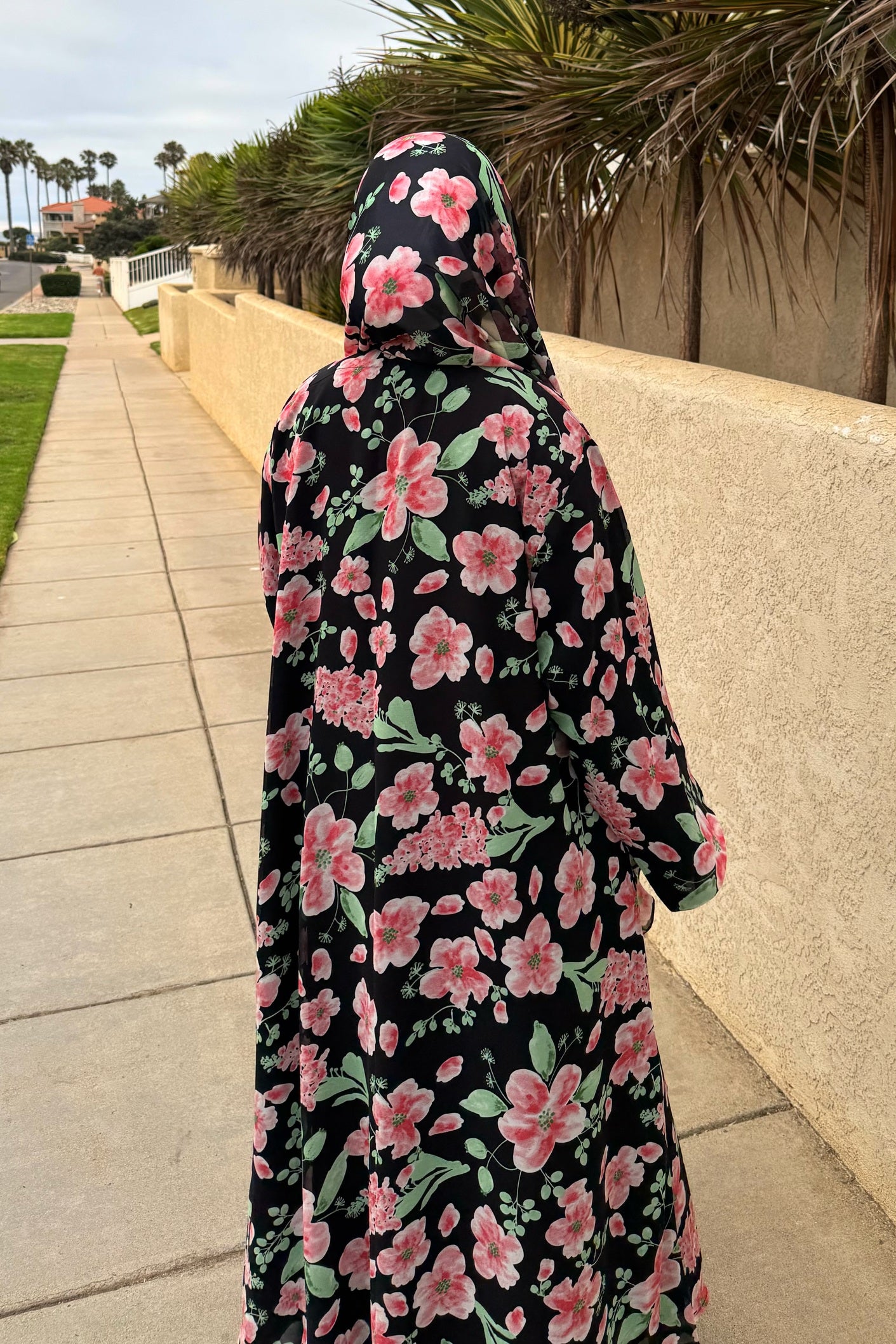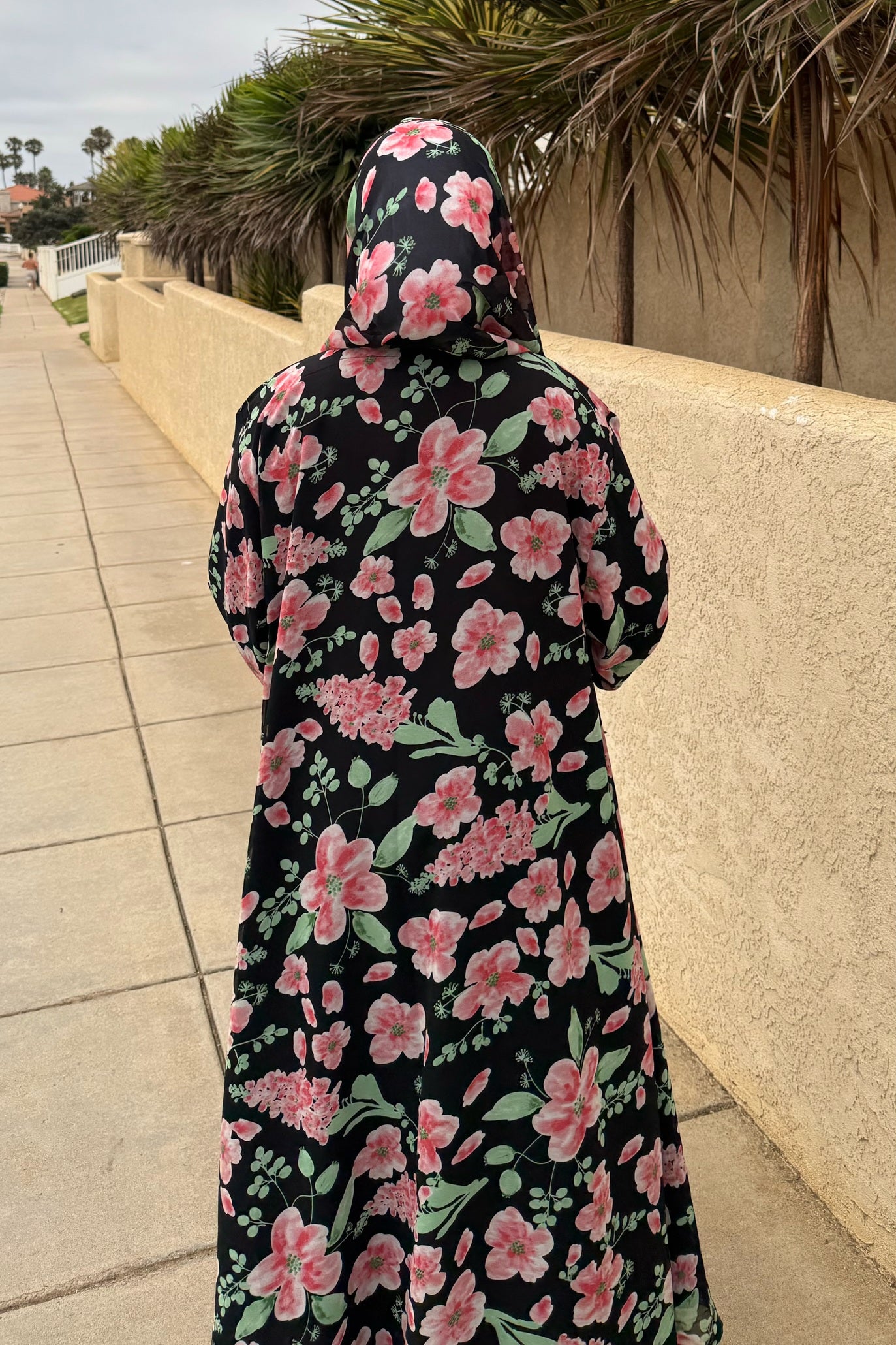 This printed abaya features a floral design and a loose, comfortable fit. Made from lightweight chiffon with a chiffon lining to maintain its flow, it comes with a matching hijab in the same printed fabric.