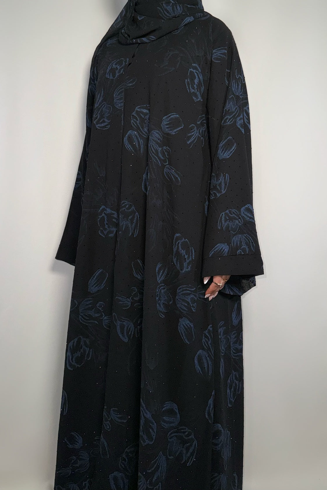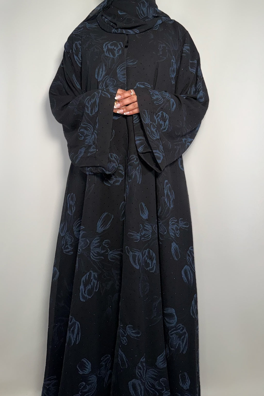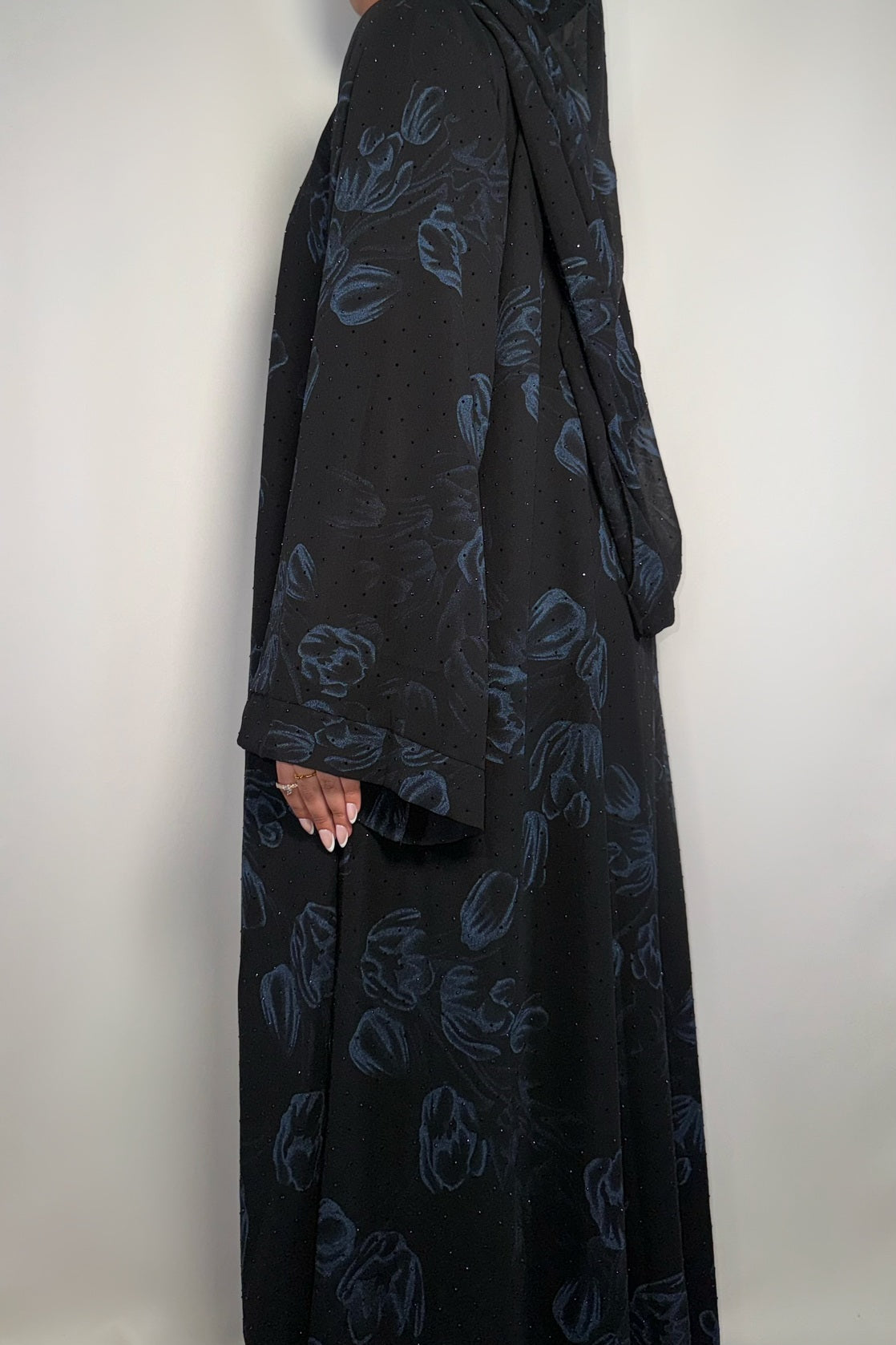 This black double-layered chiffon abaya features a colorful shimmer print and sparkling stones throughout. It is a open abaya that has buttons for functionality, and comes with a matching hijab for a coordinated look.