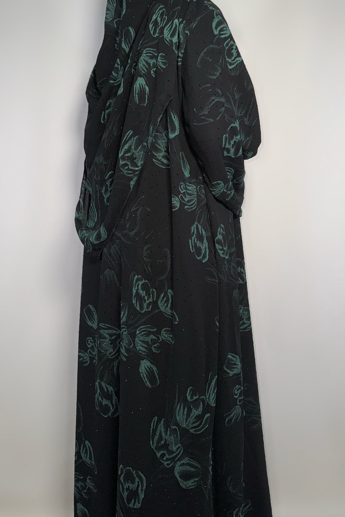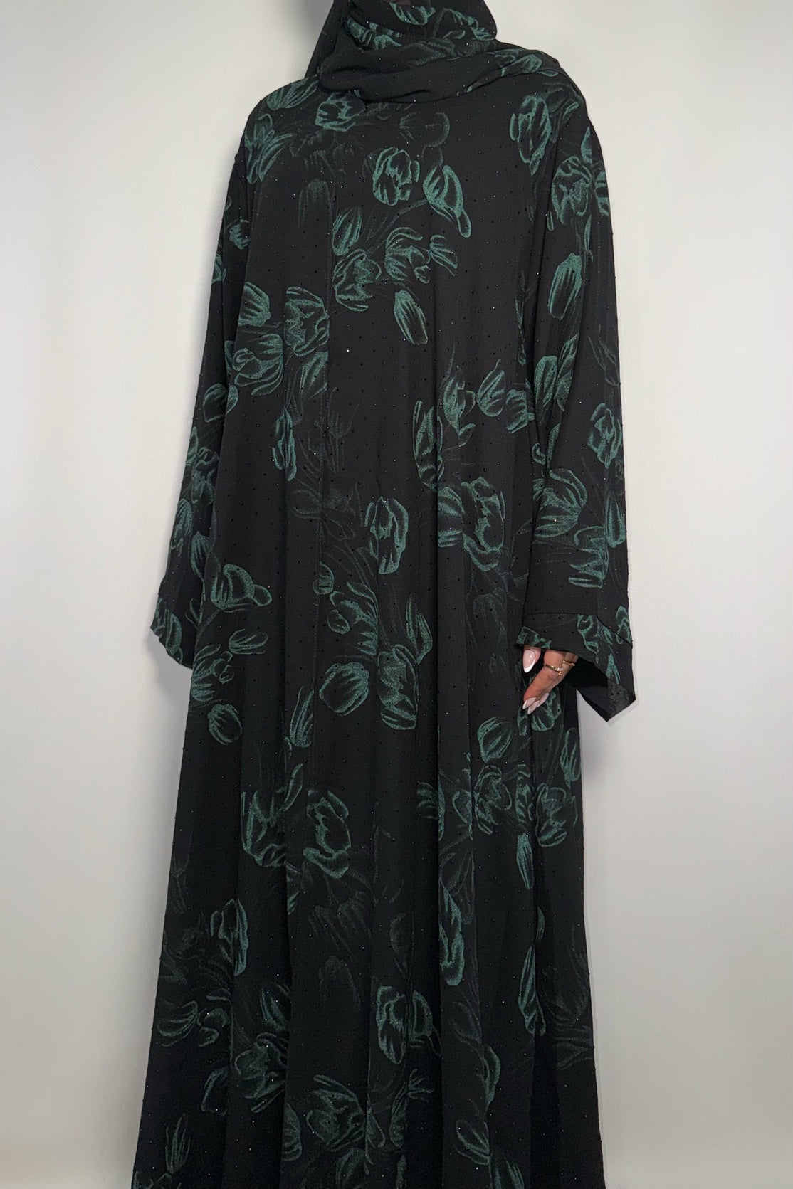 This black double-layered chiffon abaya features a colorful shimmer print and sparkling stones throughout. It is a open abaya that has buttons for functionality, and comes with a matching hijab for a coordinated look.
