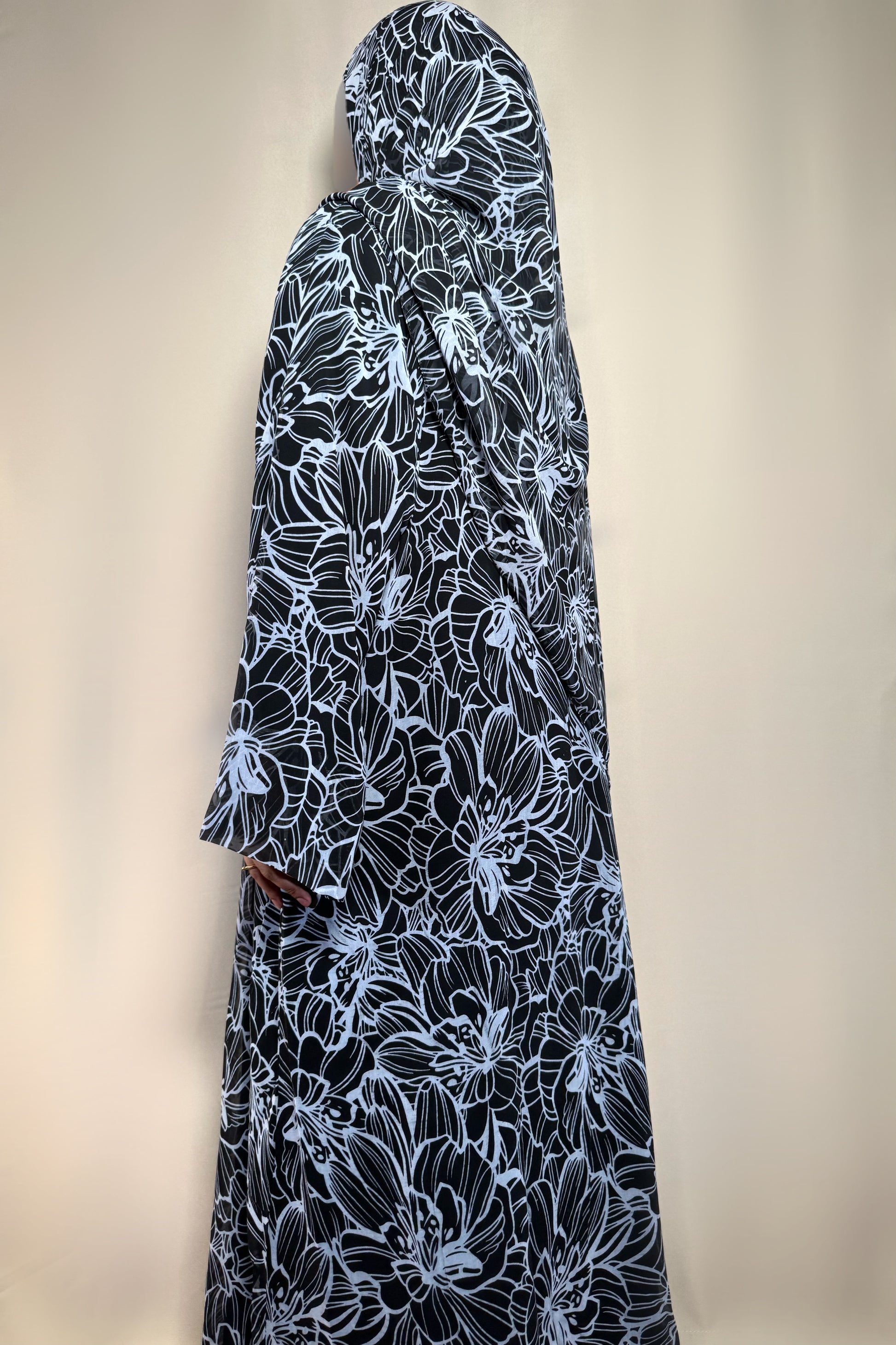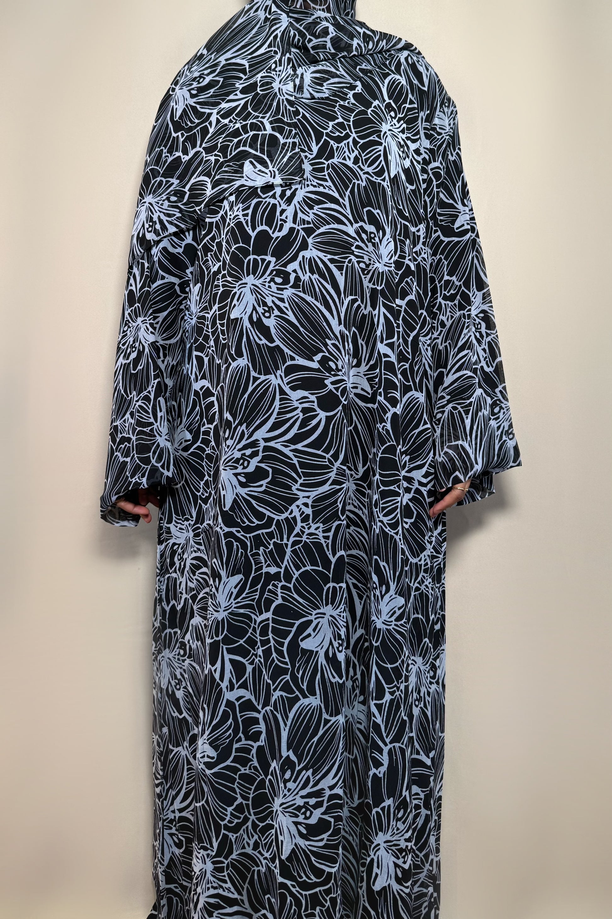This printed abaya features a loose, comfortable fit with a button attached. Made from lightweight chiffon with a chiffon lining to maintain its flow, it comes with a matching hijab in the same printed fabric.