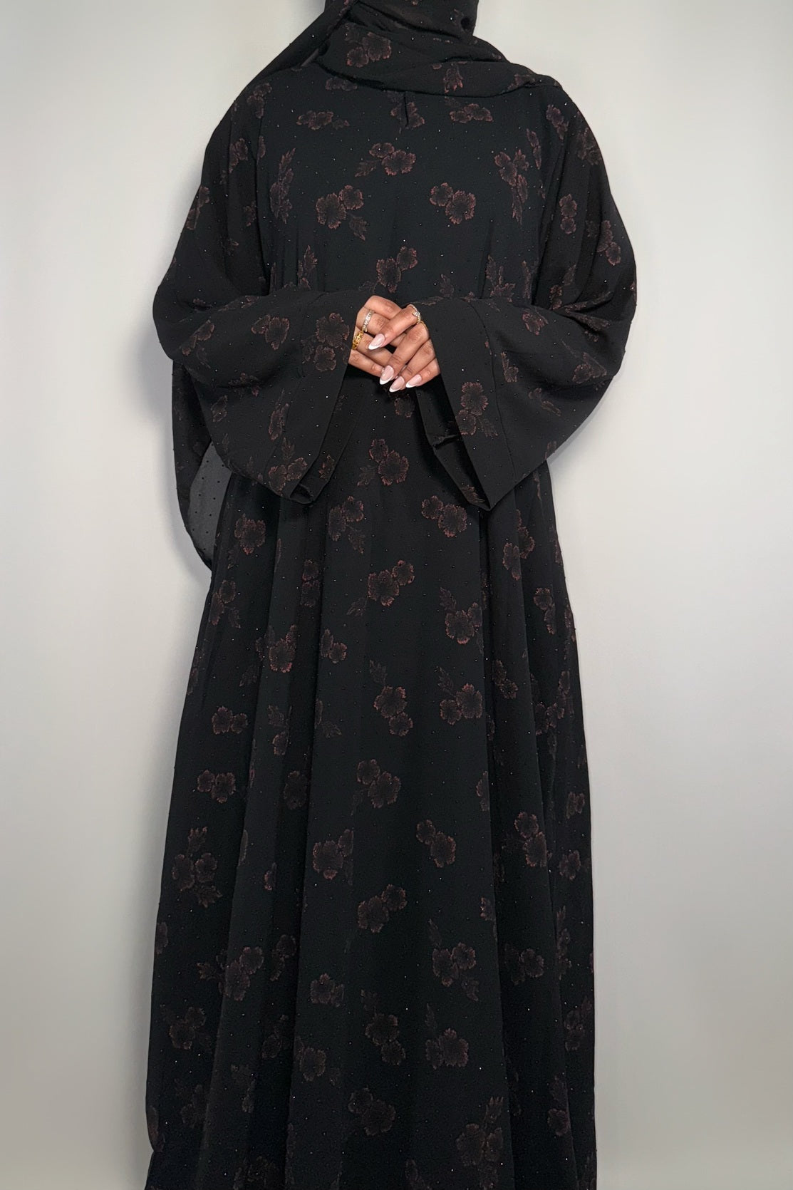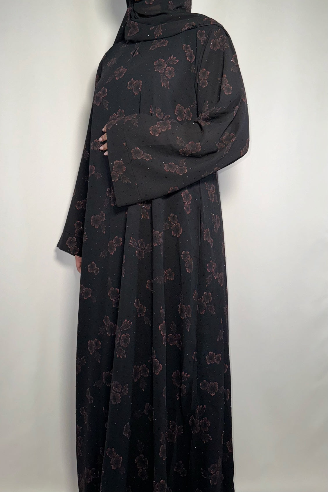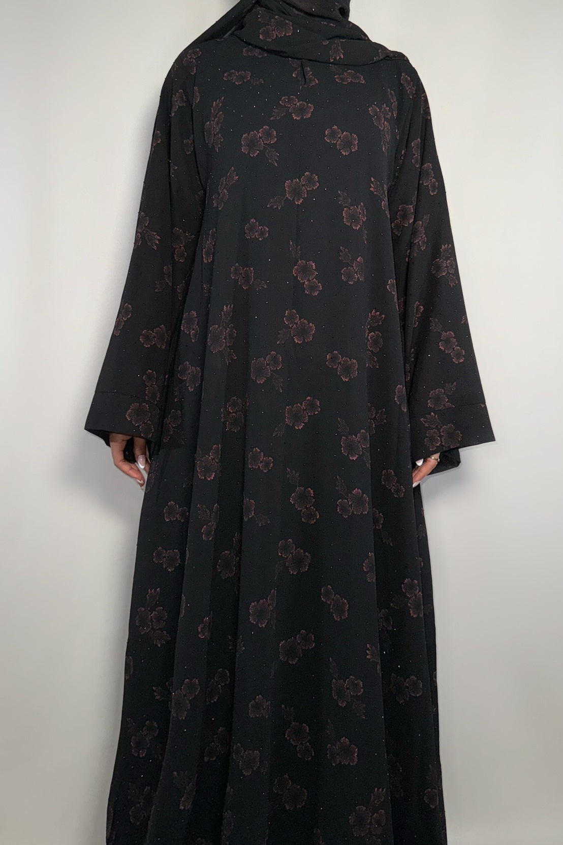 This black double-layered chiffon abaya features a colorful shimmer print and sparkling stones throughout. It is a closed abaya that has pockets for functionality, and comes with a matching hijab for a coordinated look.
