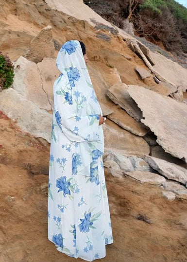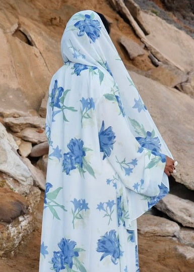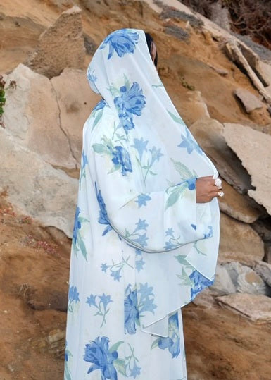 This printed abaya features a floral design and a loose, comfortable fit. Made from lightweight chiffon with a chiffon lining to maintain its flow, it comes with a matching hijab in the same printed fabric.