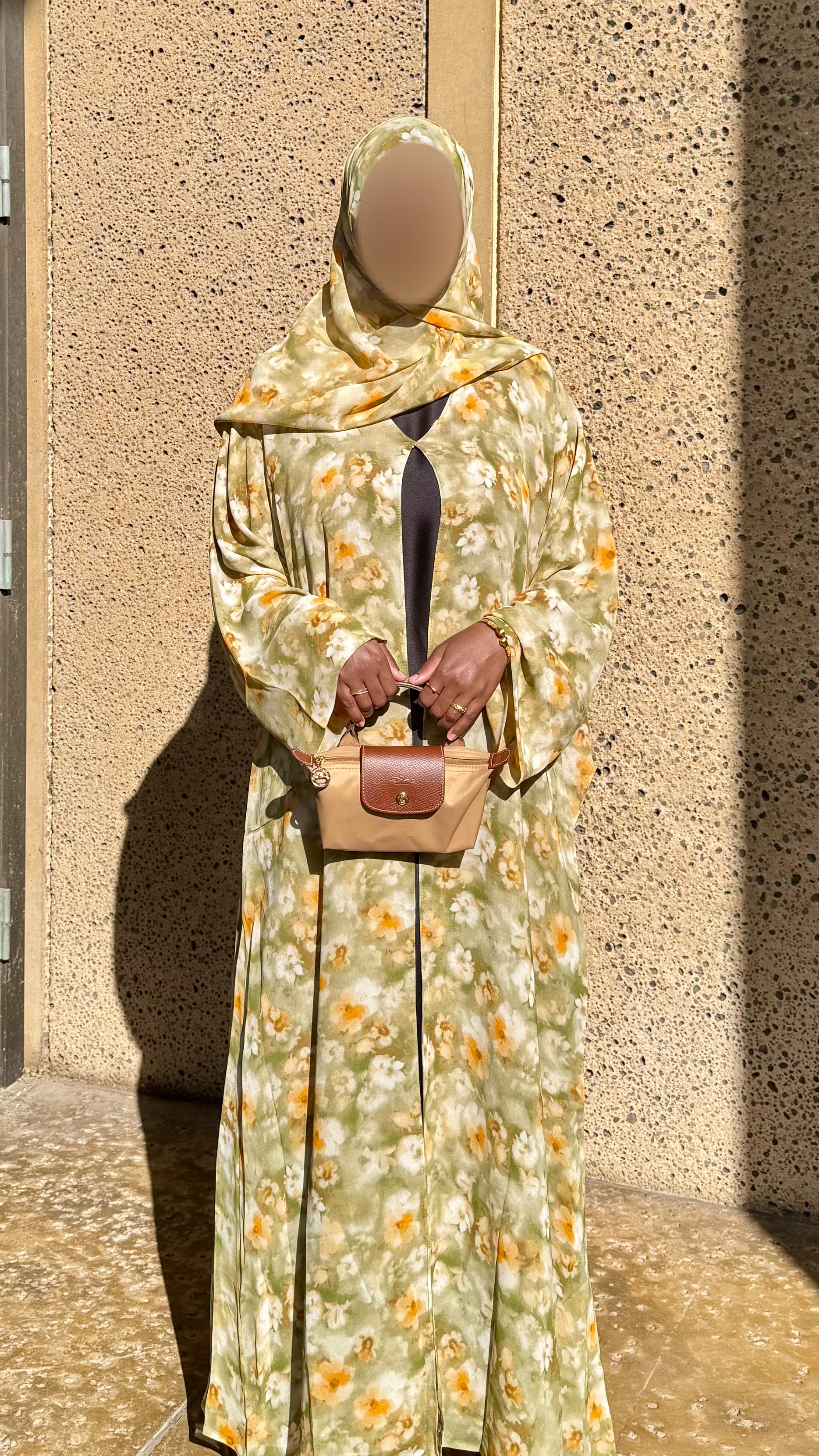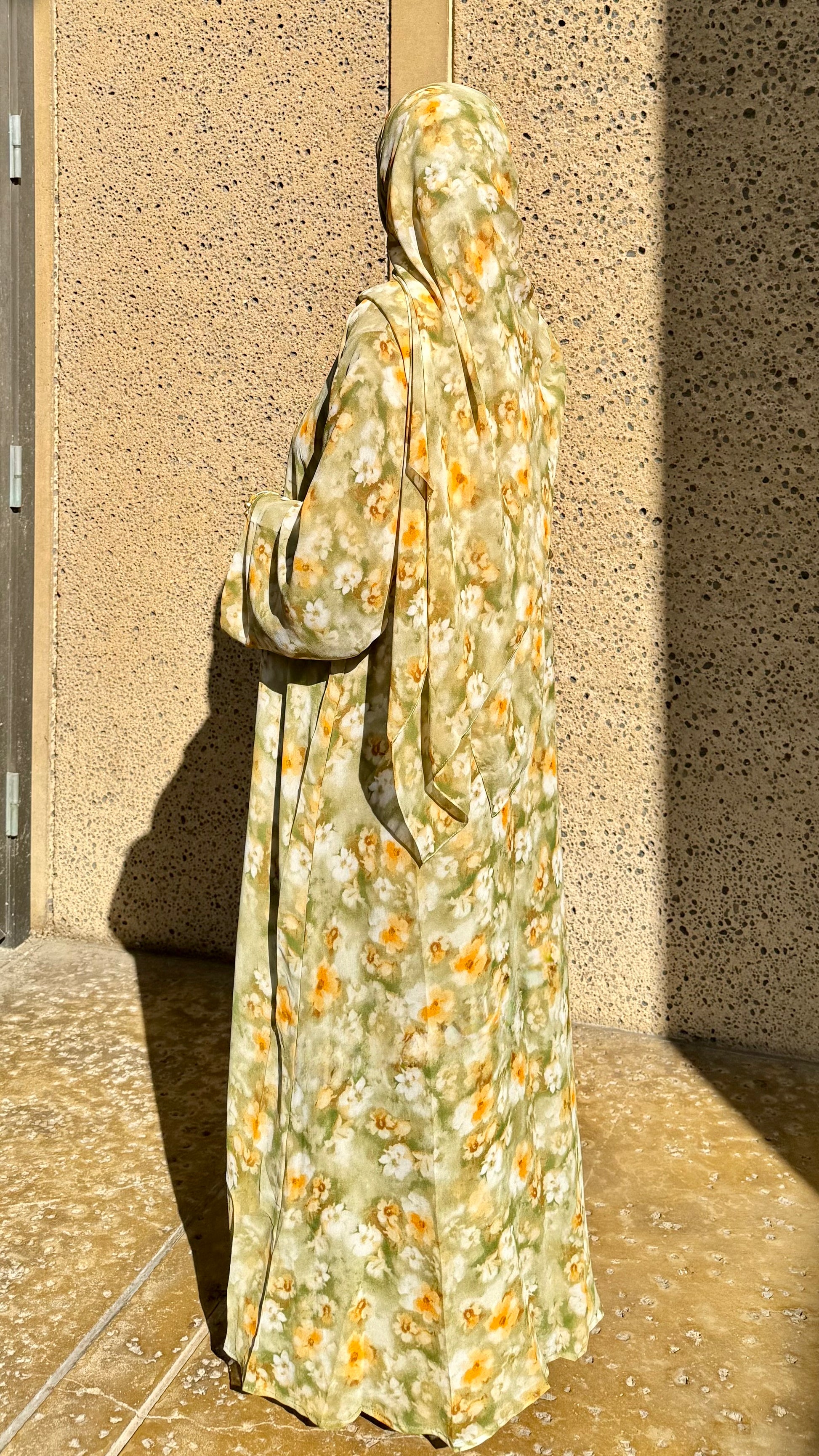 This printed abaya features a loose, comfortable fit with a button attached. Made from lightweight chiffon with a chiffon lining to maintain its flow, it comes with a matching hijab in the same printed fabric.