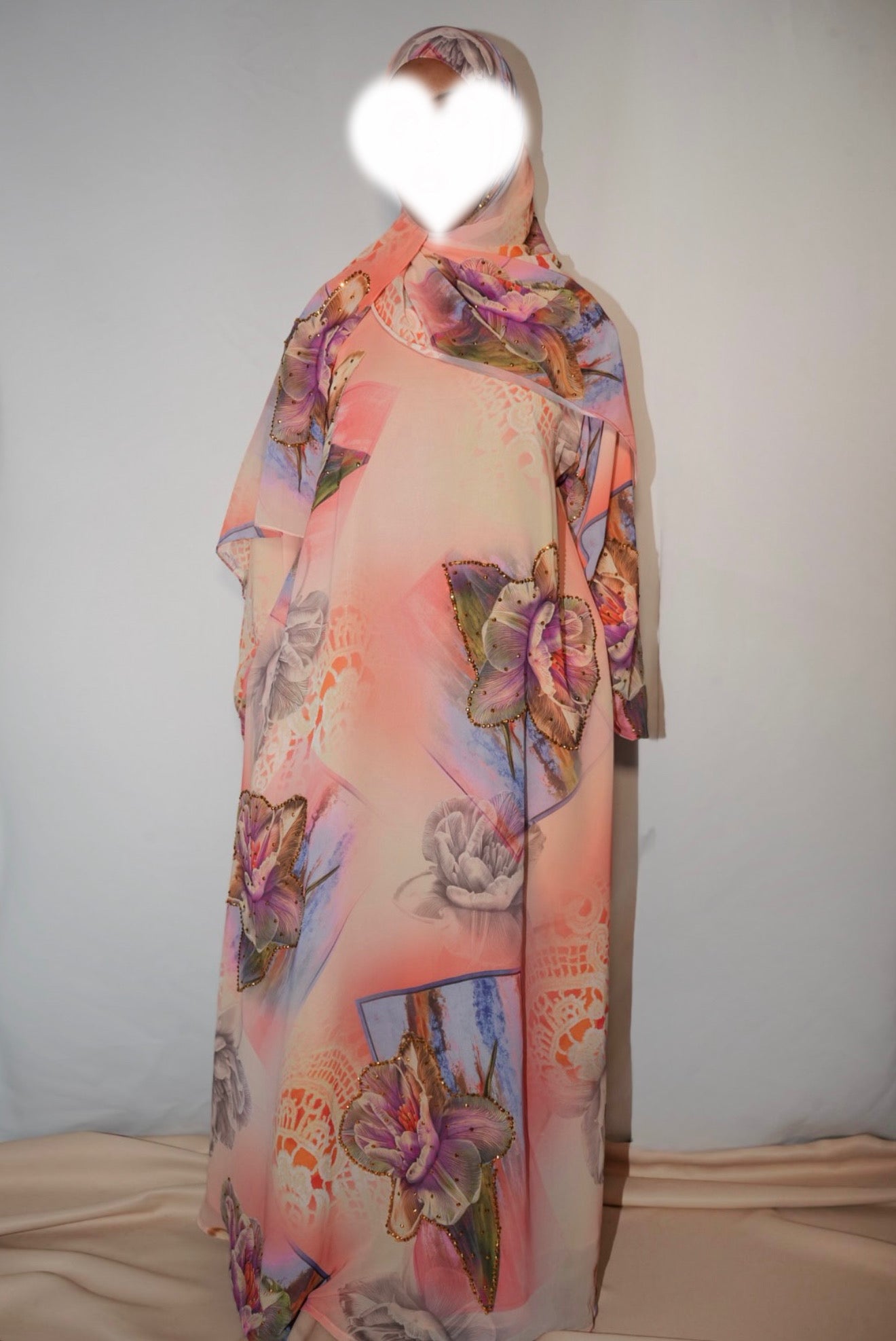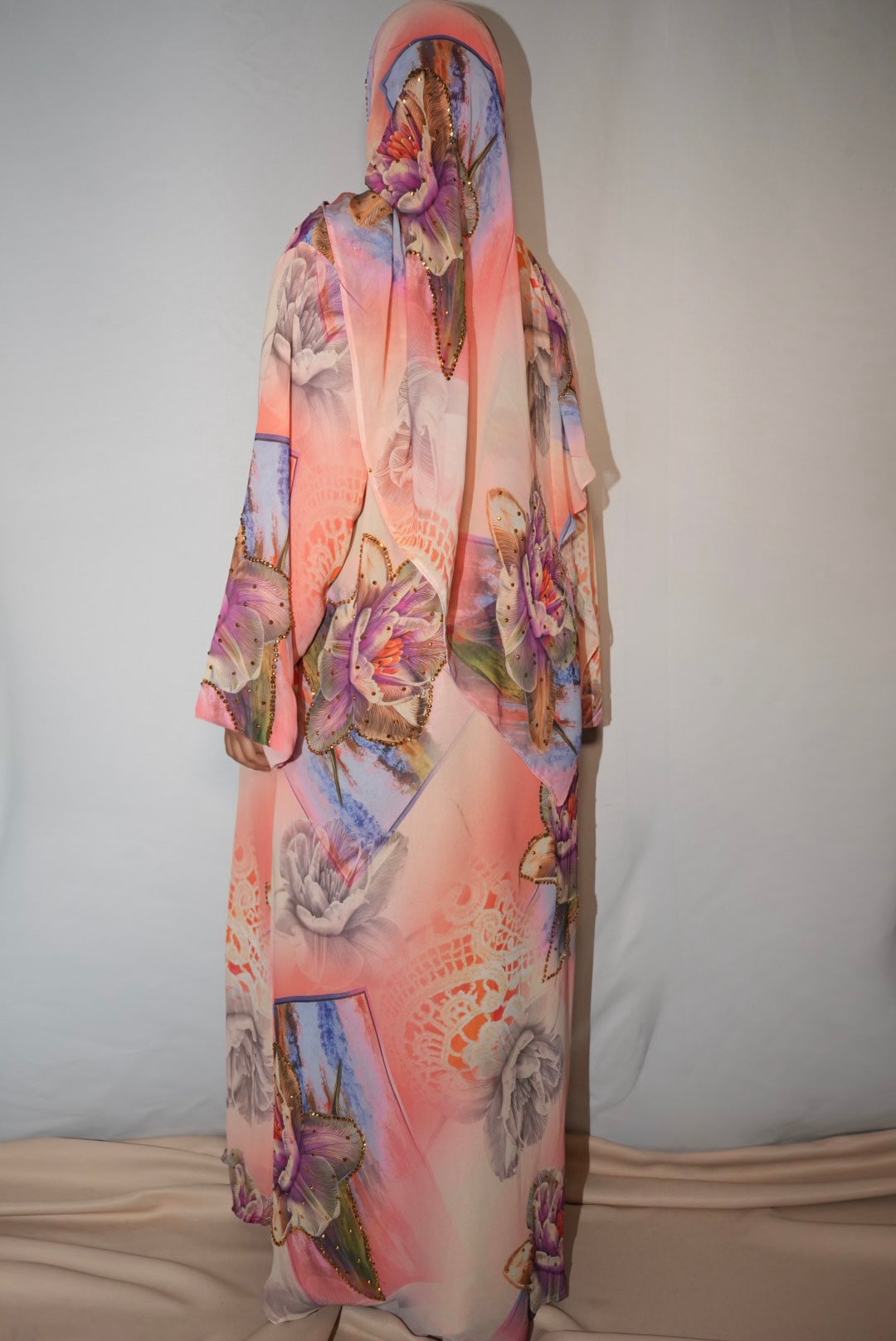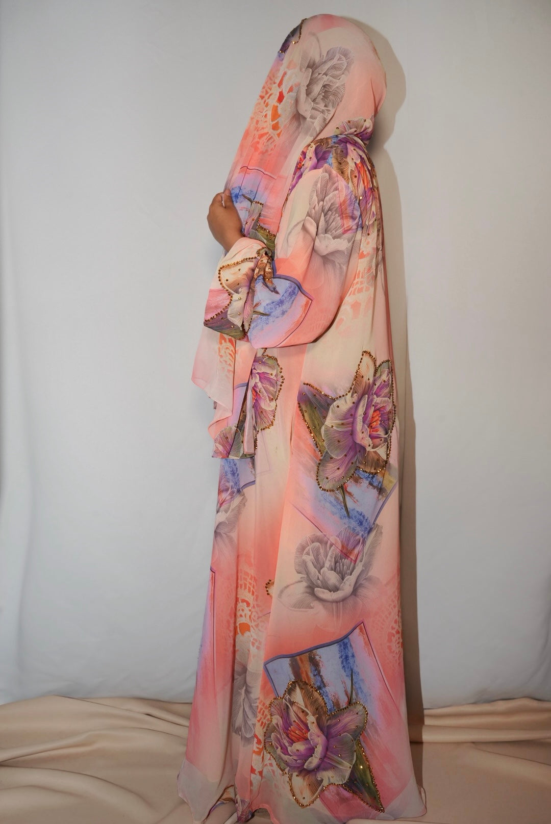This closed printed abaya features a loose, comfortable fit with a button attached. Made from lightweight chiffon with a chiffon lining to maintain its flow, it also includes gold sparkle detailing throughout the print, adding a soft, luminous touch. It comes with a matching hijab in the same printed fabric.