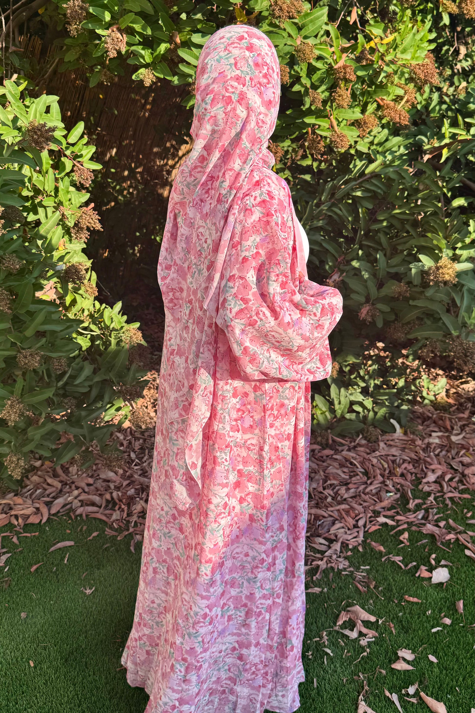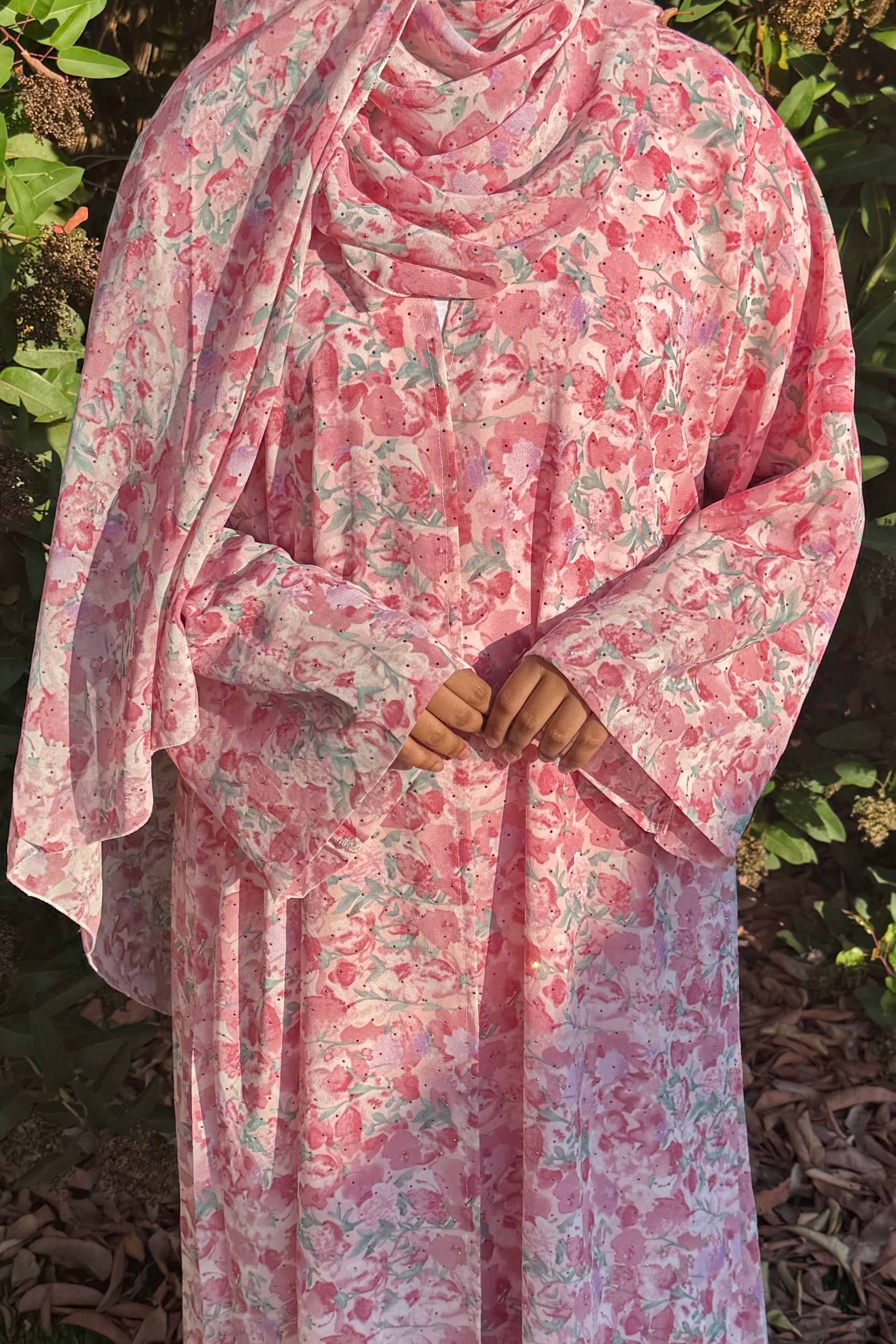 This crystal printed abaya features a soft floral design and a loose, comfortable fit. Made from lightweight chiffon with a chiffon lining to maintain its flow, it comes with a matching hijab in the same printed fabric.