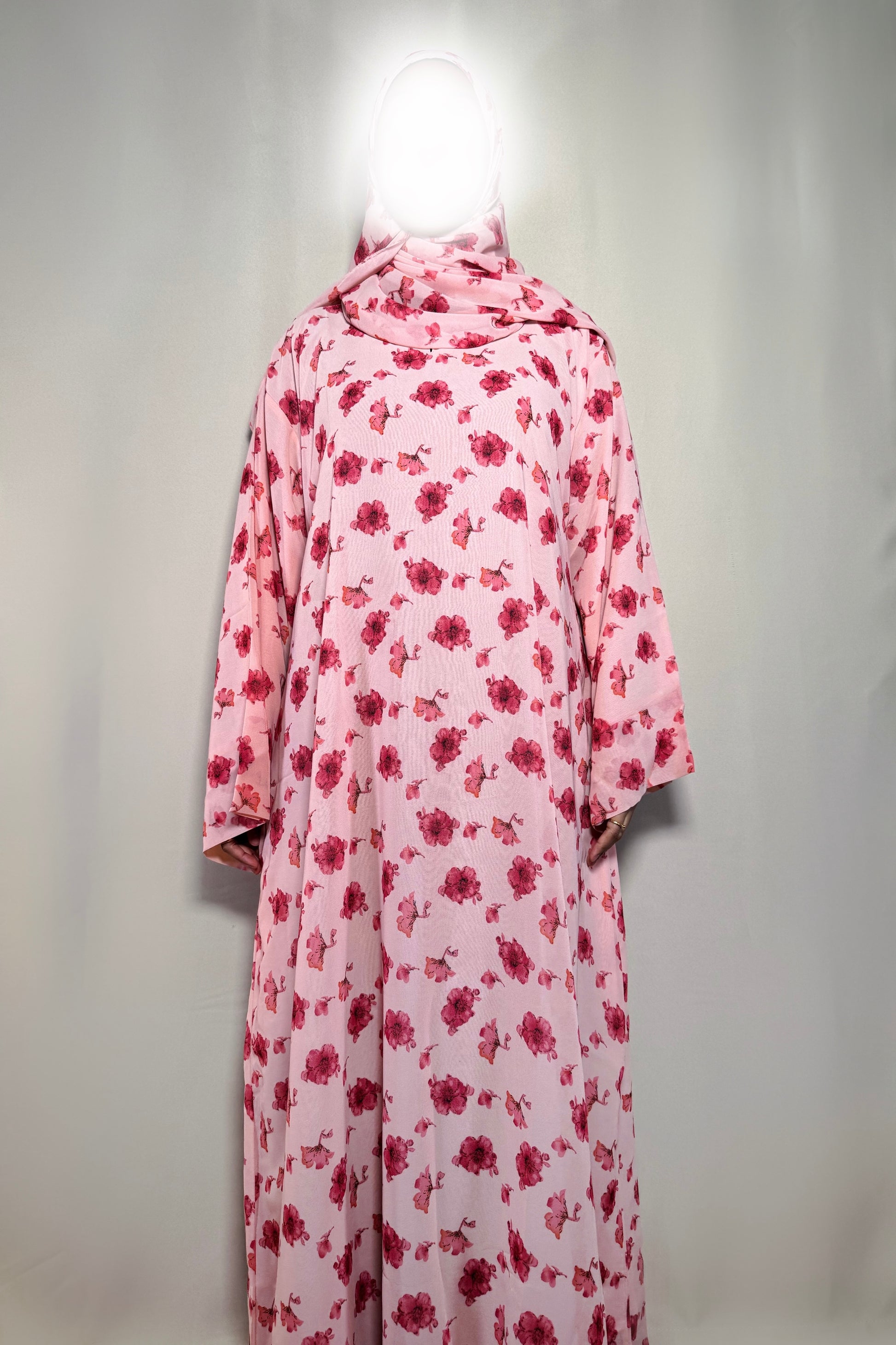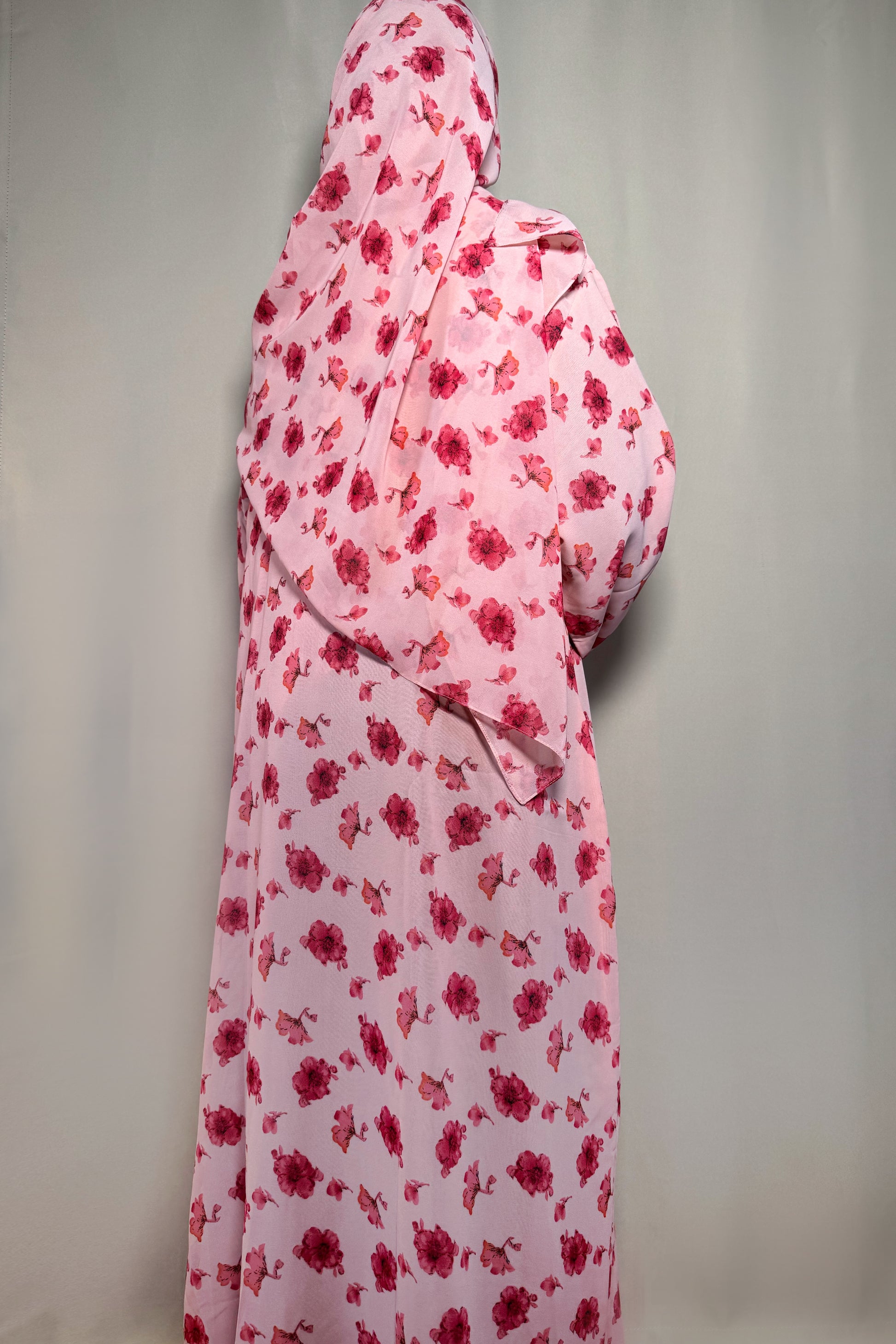 This printed abaya features a loose, comfortable fit with a button attached. Made from lightweight chiffon with a chiffon lining to maintain its flow, it comes with a matching hijab in the same printed fabric.