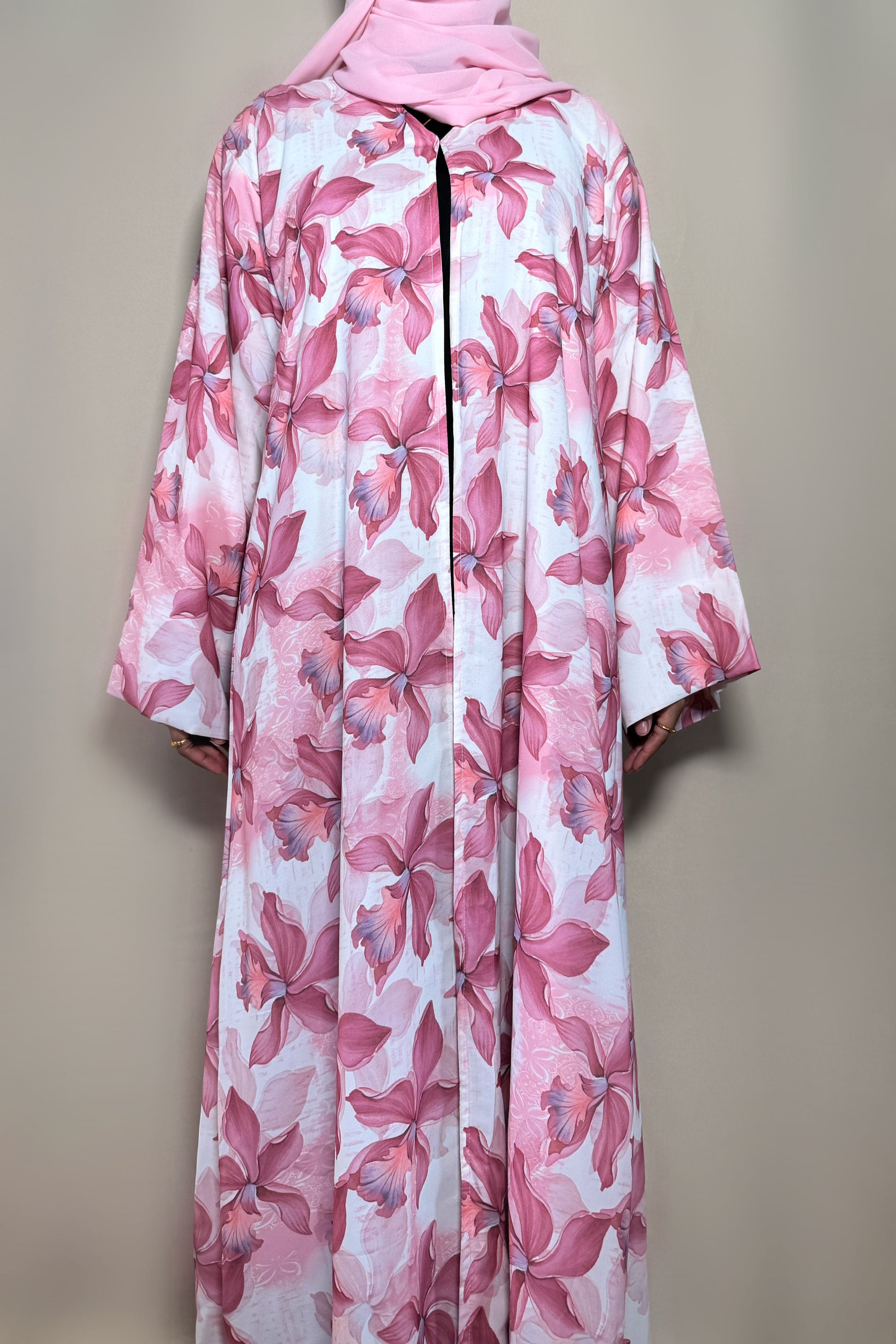 This printed abaya features a loose, comfortable fit with a button attached. Made from crepe with a chiffon lining to maintain its flow, it comes with a matching plain hijab.