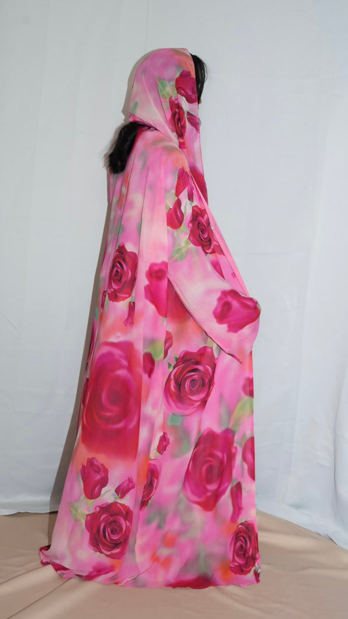 This printed abaya features a loose, comfortable fit with a button attached. Made from lightweight chiffon with a chiffon lining to maintain its flow, it comes with a matching hijab in the same printed fabric.
