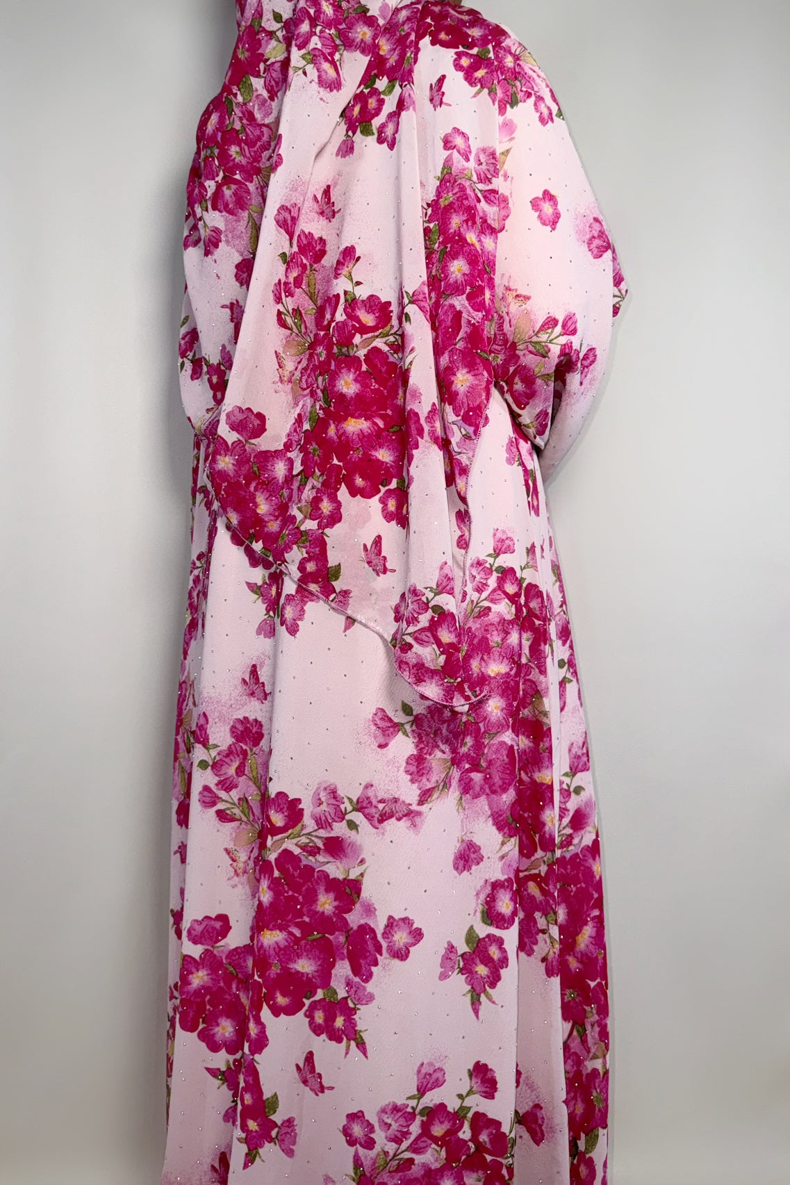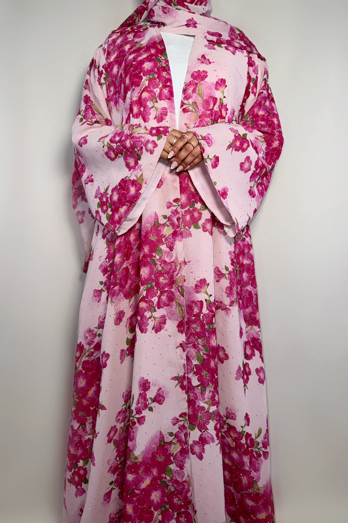 This open abaya features a floral print with sparkling crystal detailing throughout. It also comes with a matching hijab.