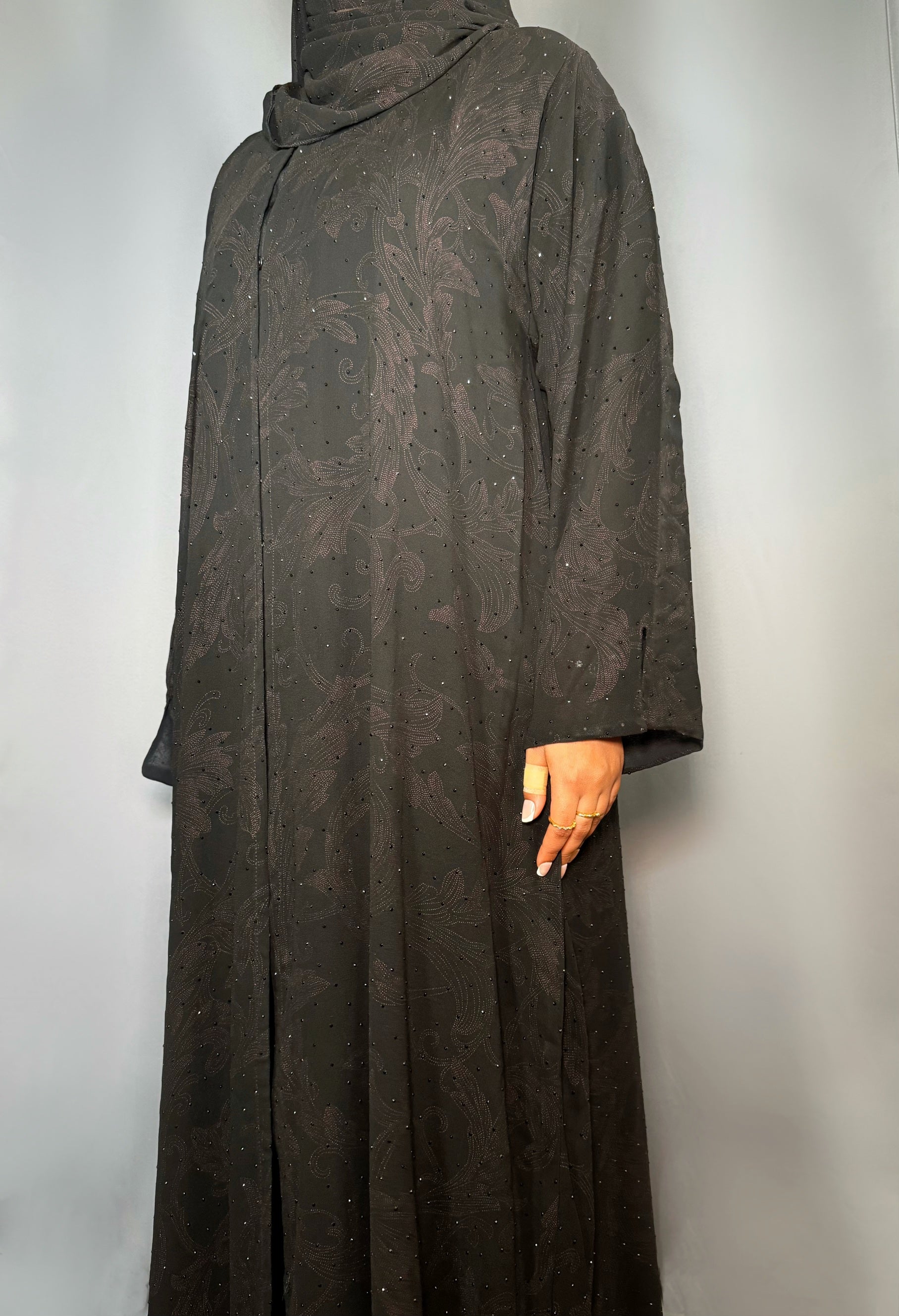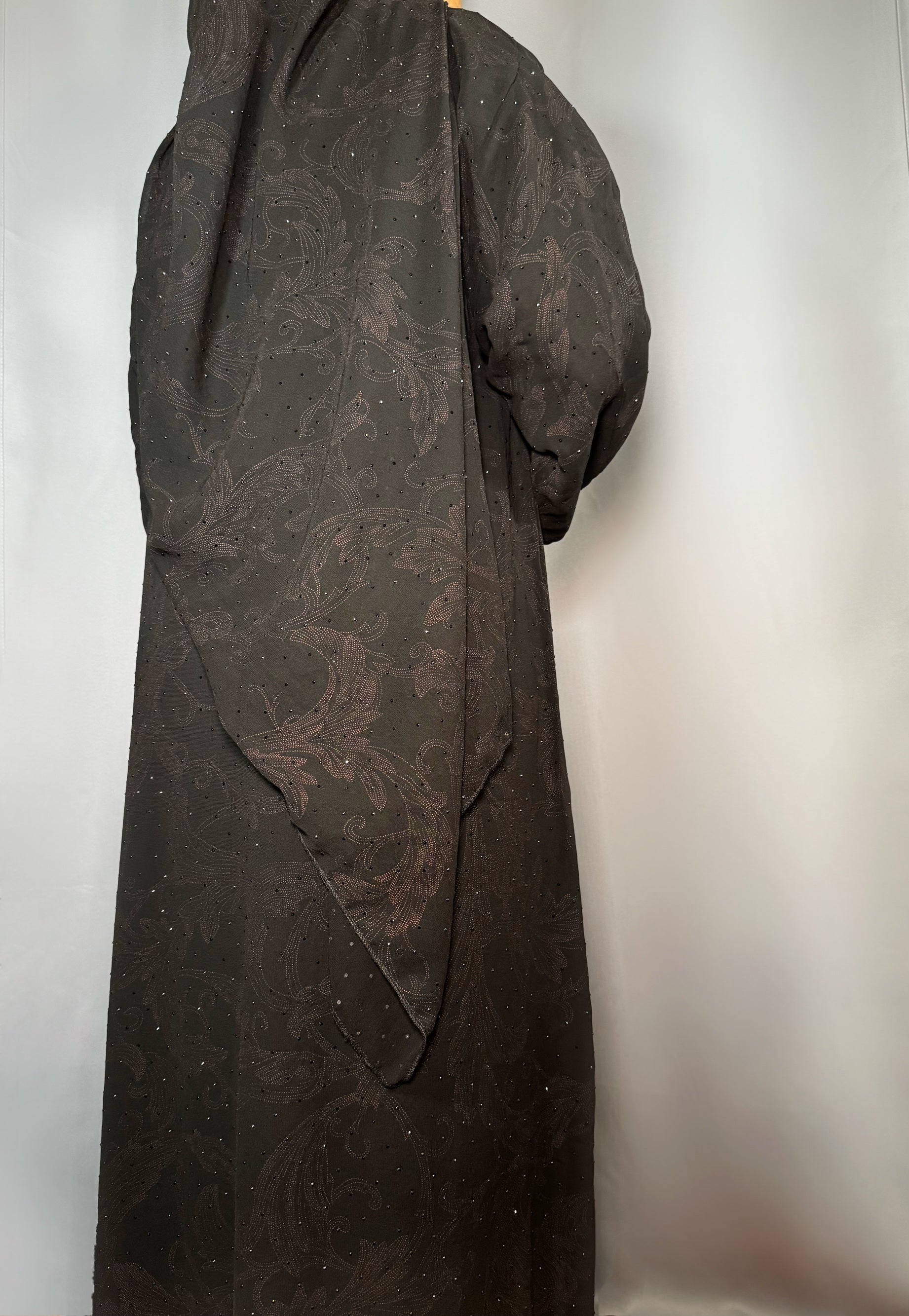 This black double-layered open chiffon abaya features a colorful shimmer print and sparkling stones throughout. It includes split sleeves, buttons for closure, and comes with a matching hijab for a coordinated look.