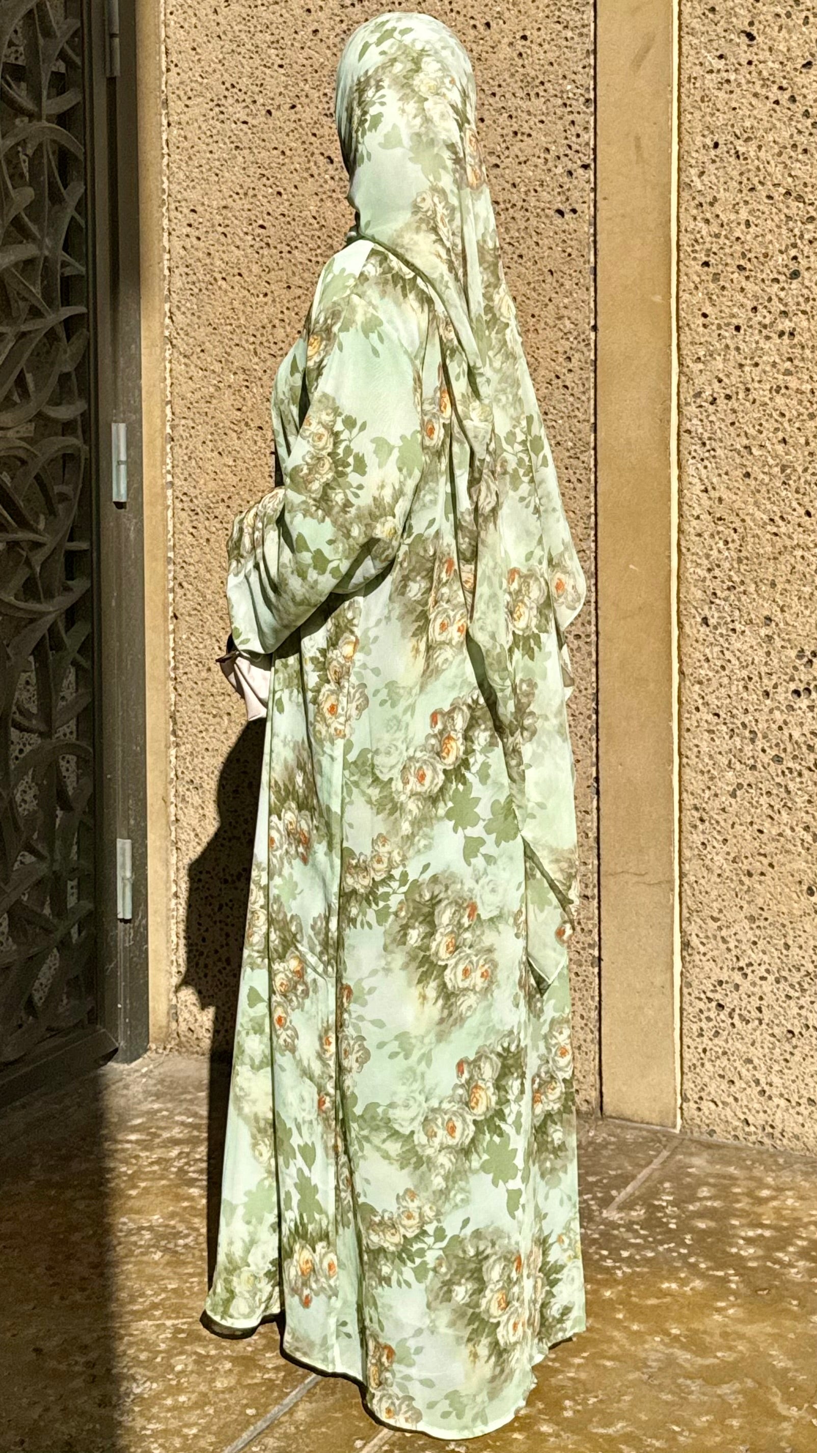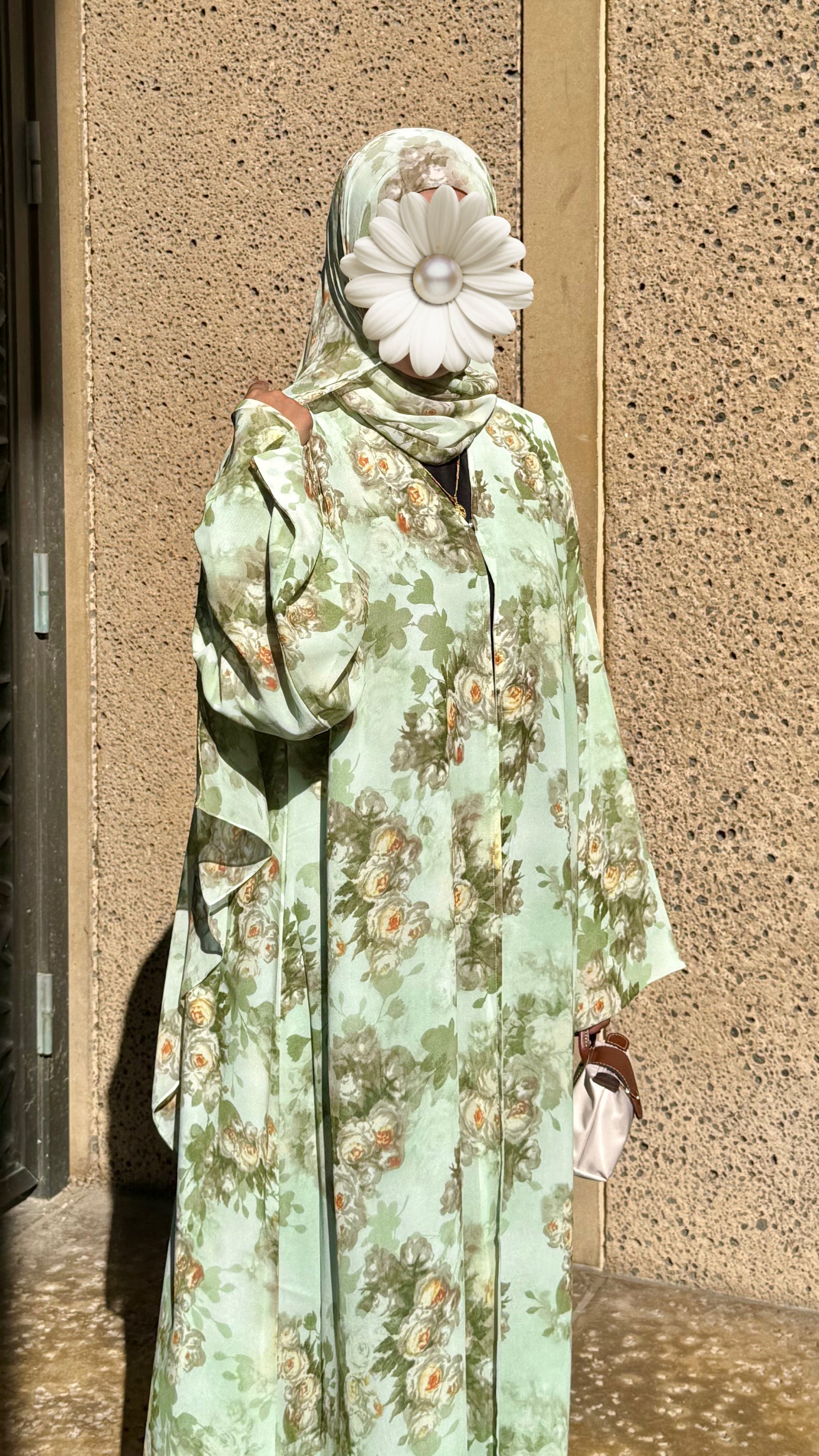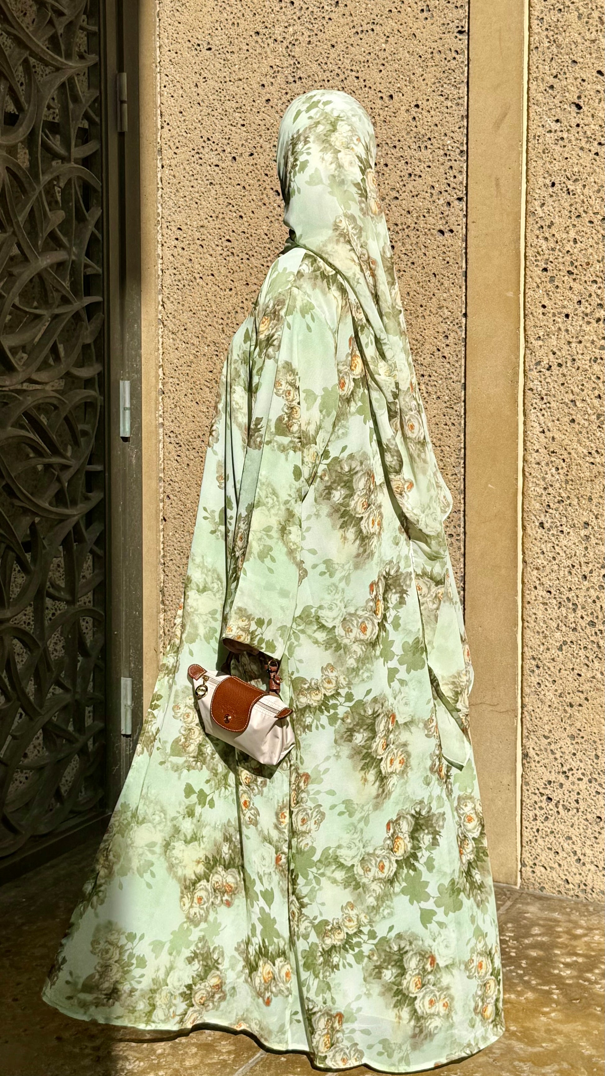 This printed abaya features a loose, comfortable fit with a button attached. Made from lightweight chiffon with a chiffon lining to maintain its flow, it comes with a matching hijab in the same printed fabric.
