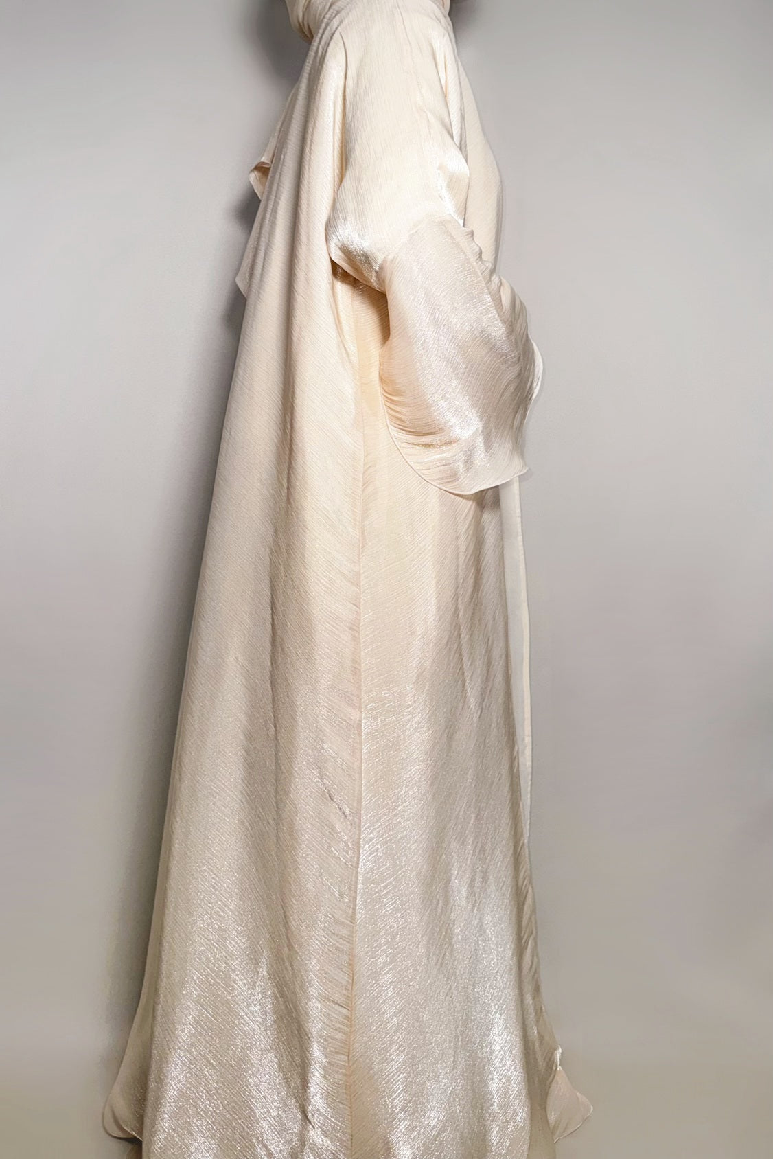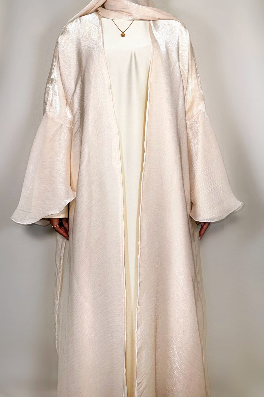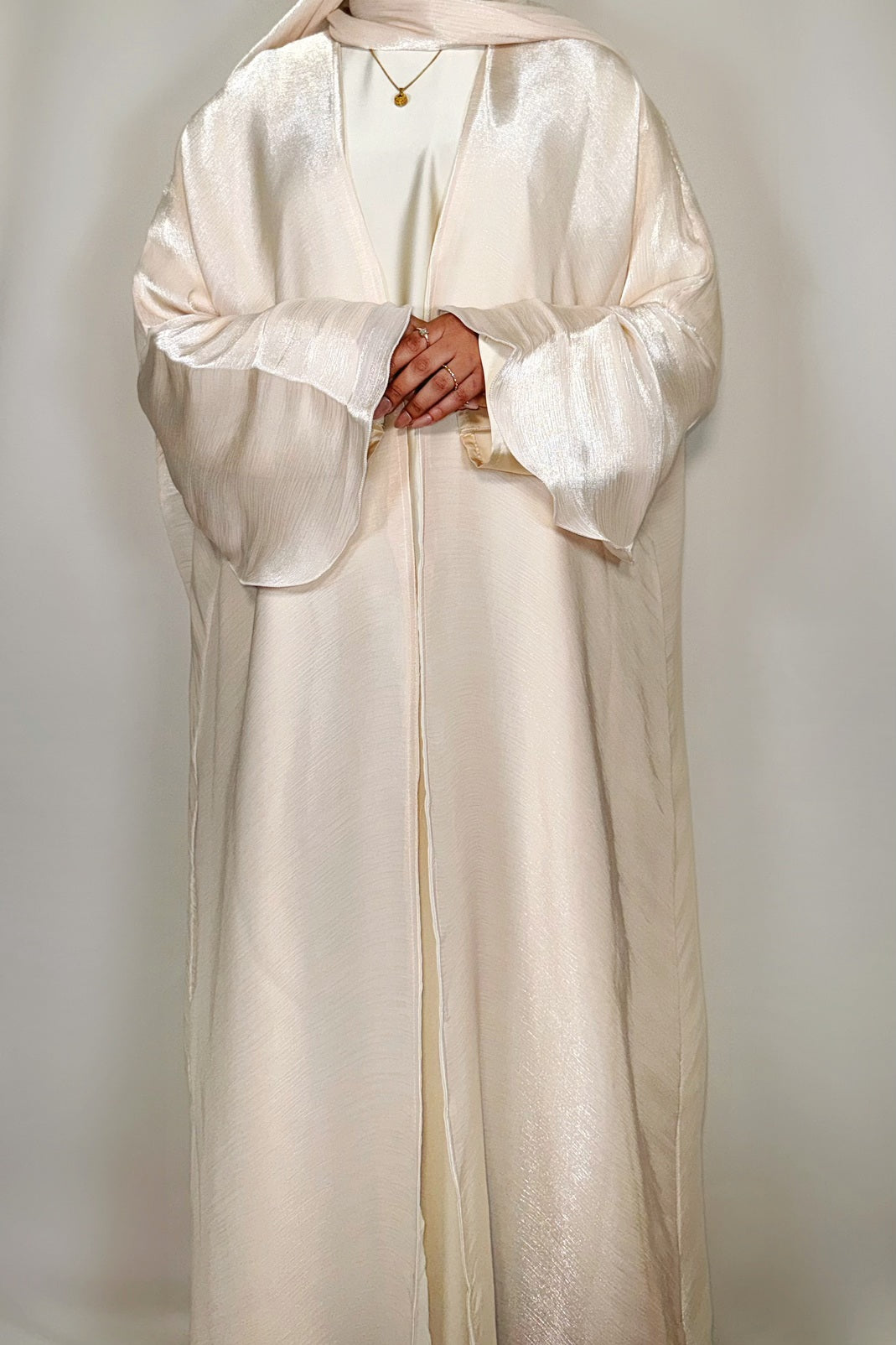 The outer abaya and hijab are crafted from lightweight organza, with the abaya featuring delicate ruffle detailing on the sleeves. The inner dress is made from smooth silk-satin for a luxurious feel.