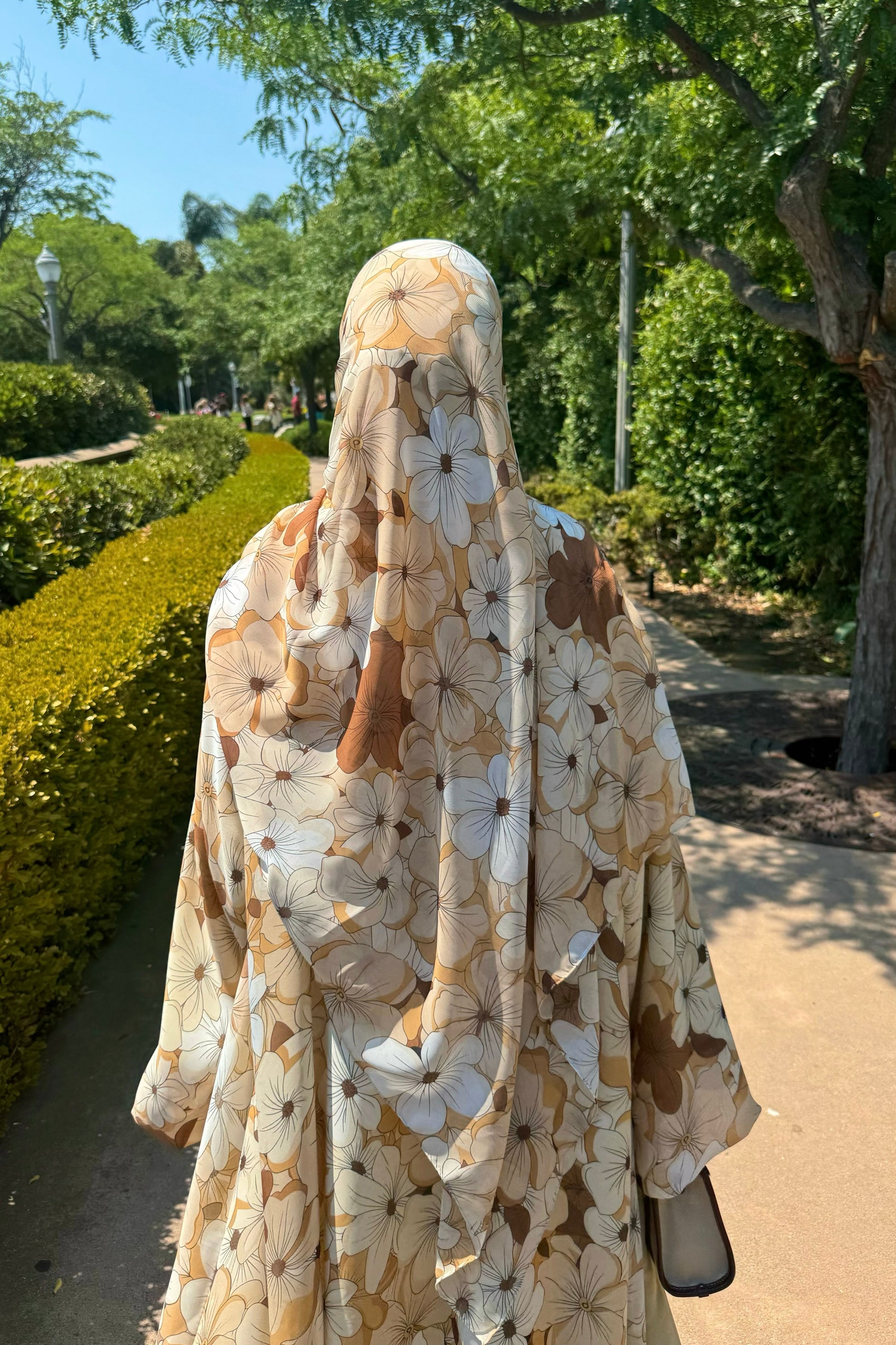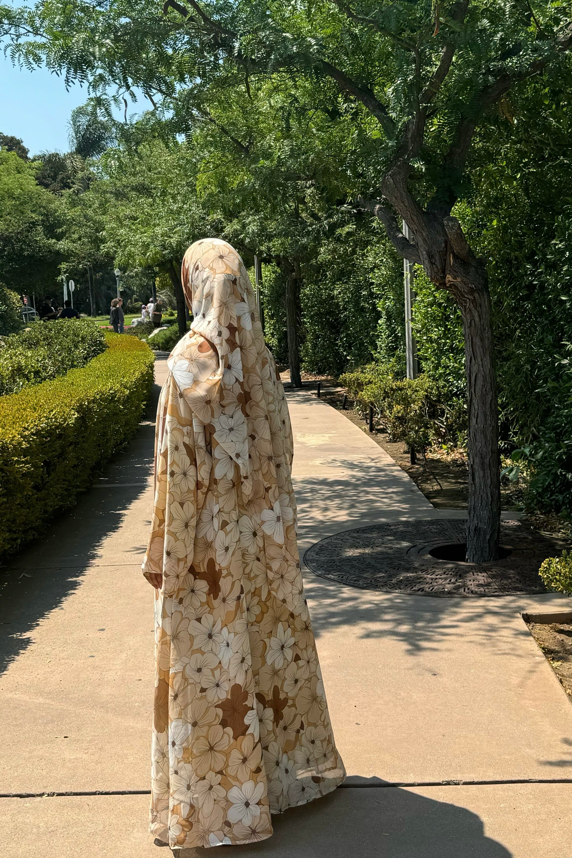 This printed abaya features a floral design and a loose, comfortable fit. Made from lightweight chiffon with a chiffon lining to maintain its flow, it comes with a matching hijab in the same printed fabric.
