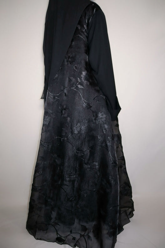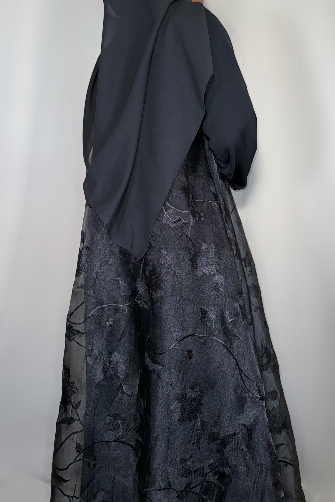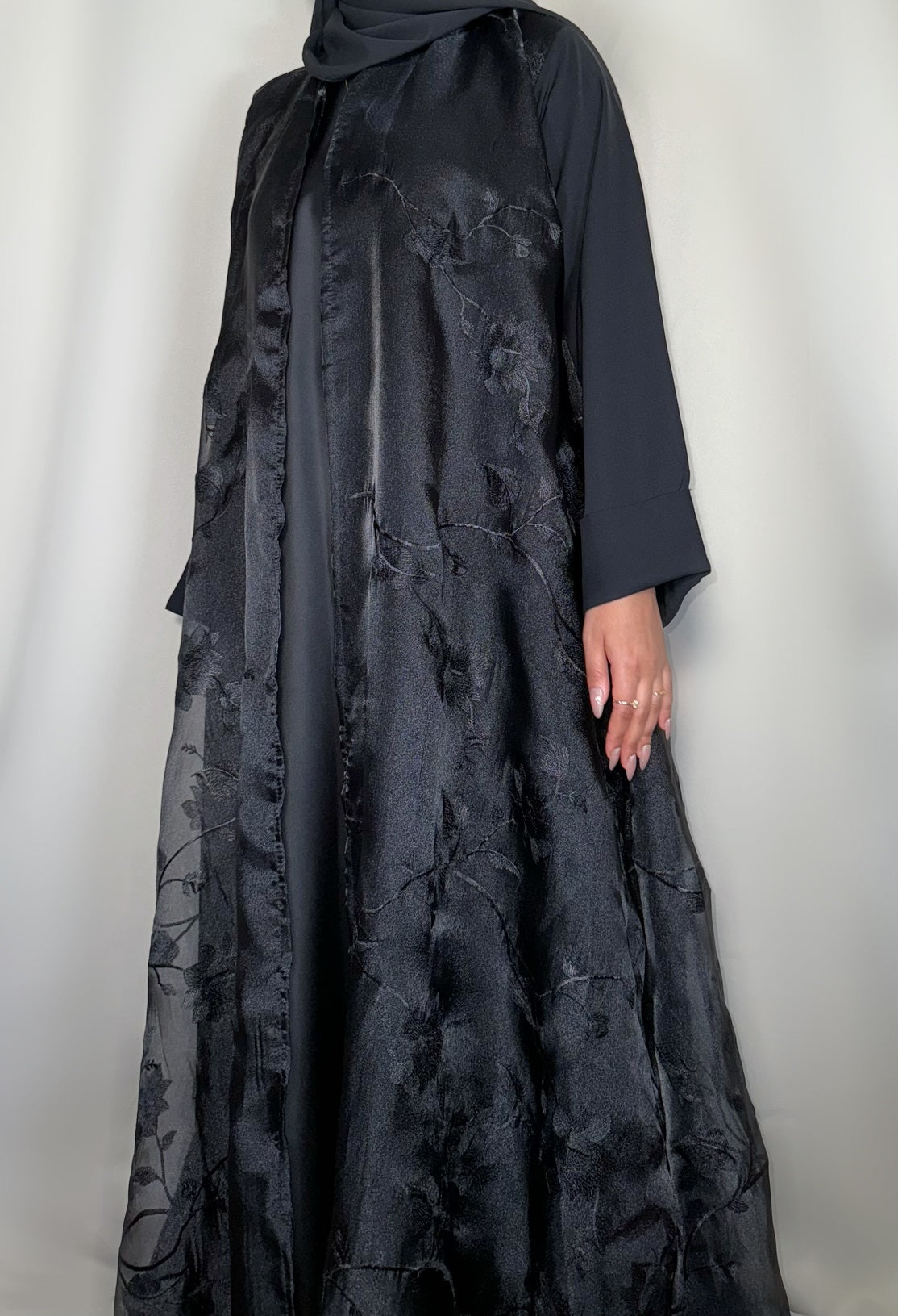 This abaya is made with detailed embroidered organza layered over a soft Nida lining for comfort and coverage. It includes Nida sleeves and cuffed arms for a clean and structured look.