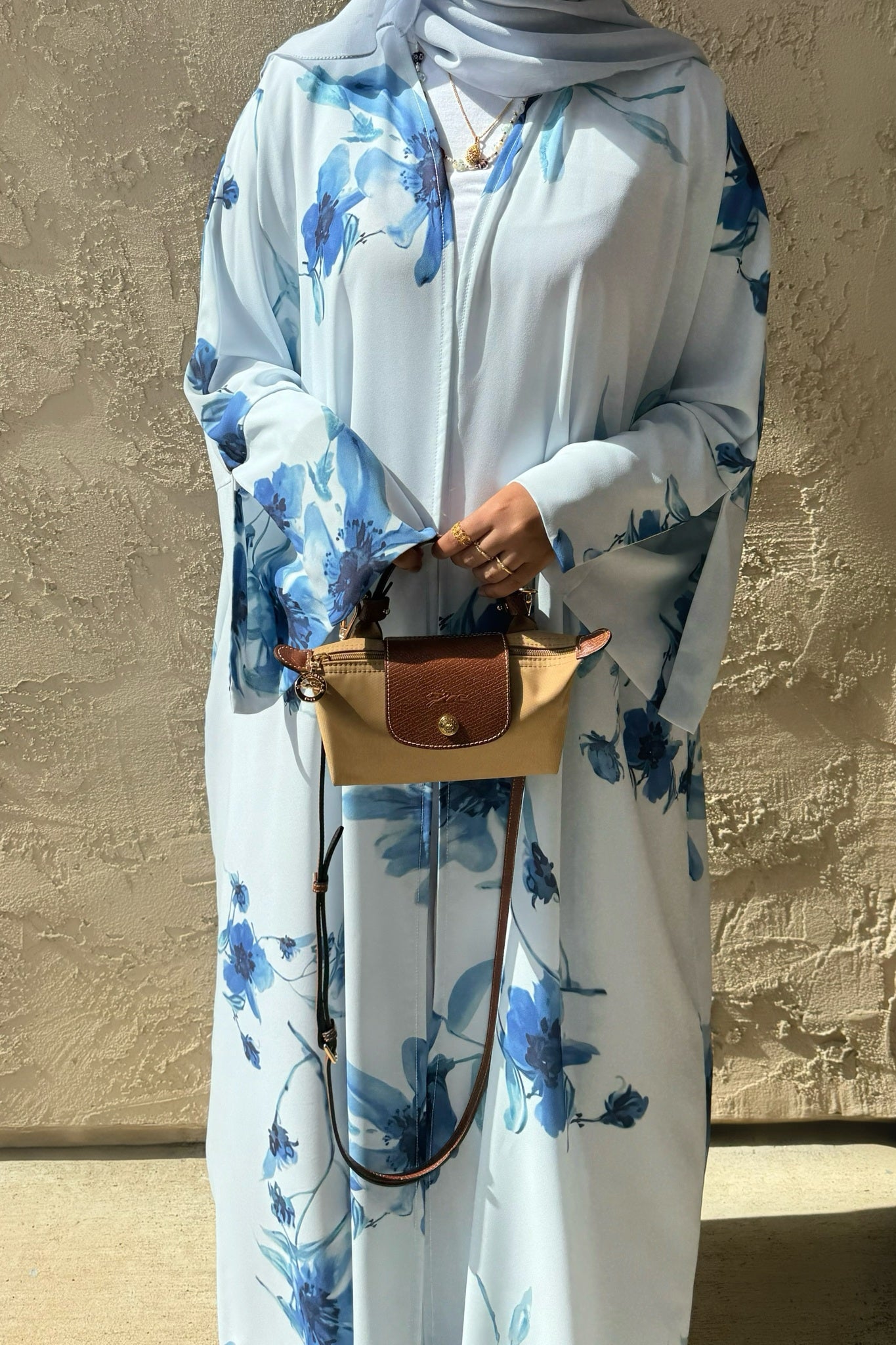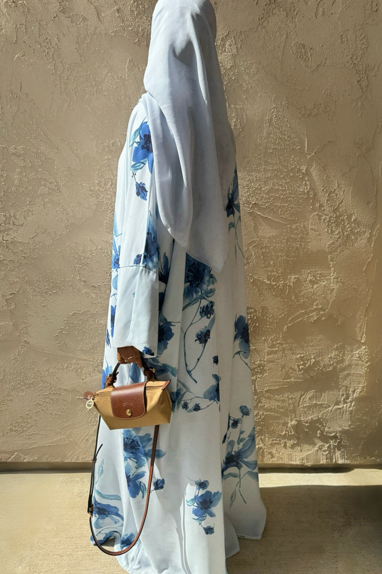 This printed abaya features a soft floral design with a wide, comfortable fit. Made from lightweight chiffon crepe, it offers a flowing silhouette and includes hand splits for added ease.