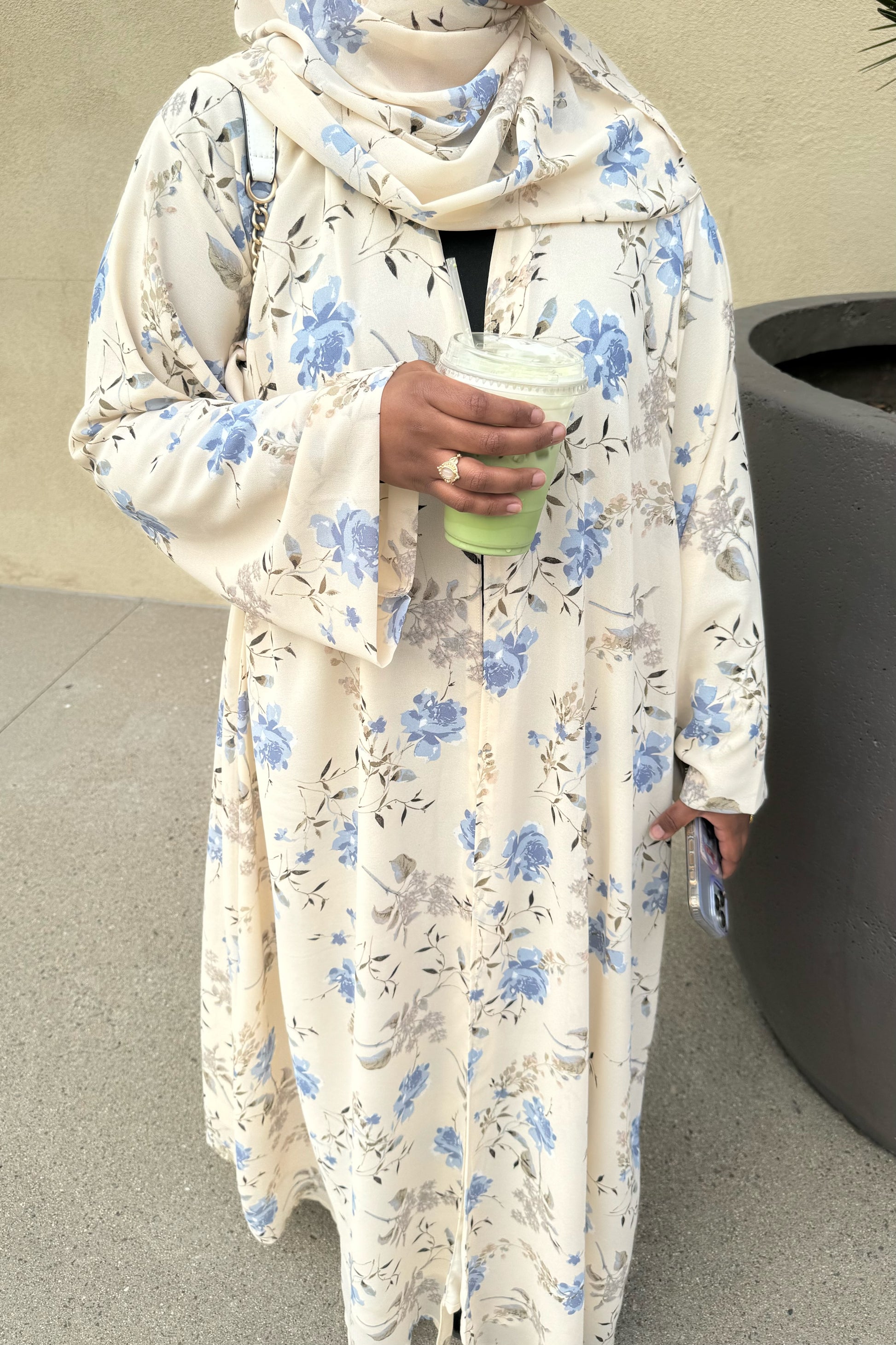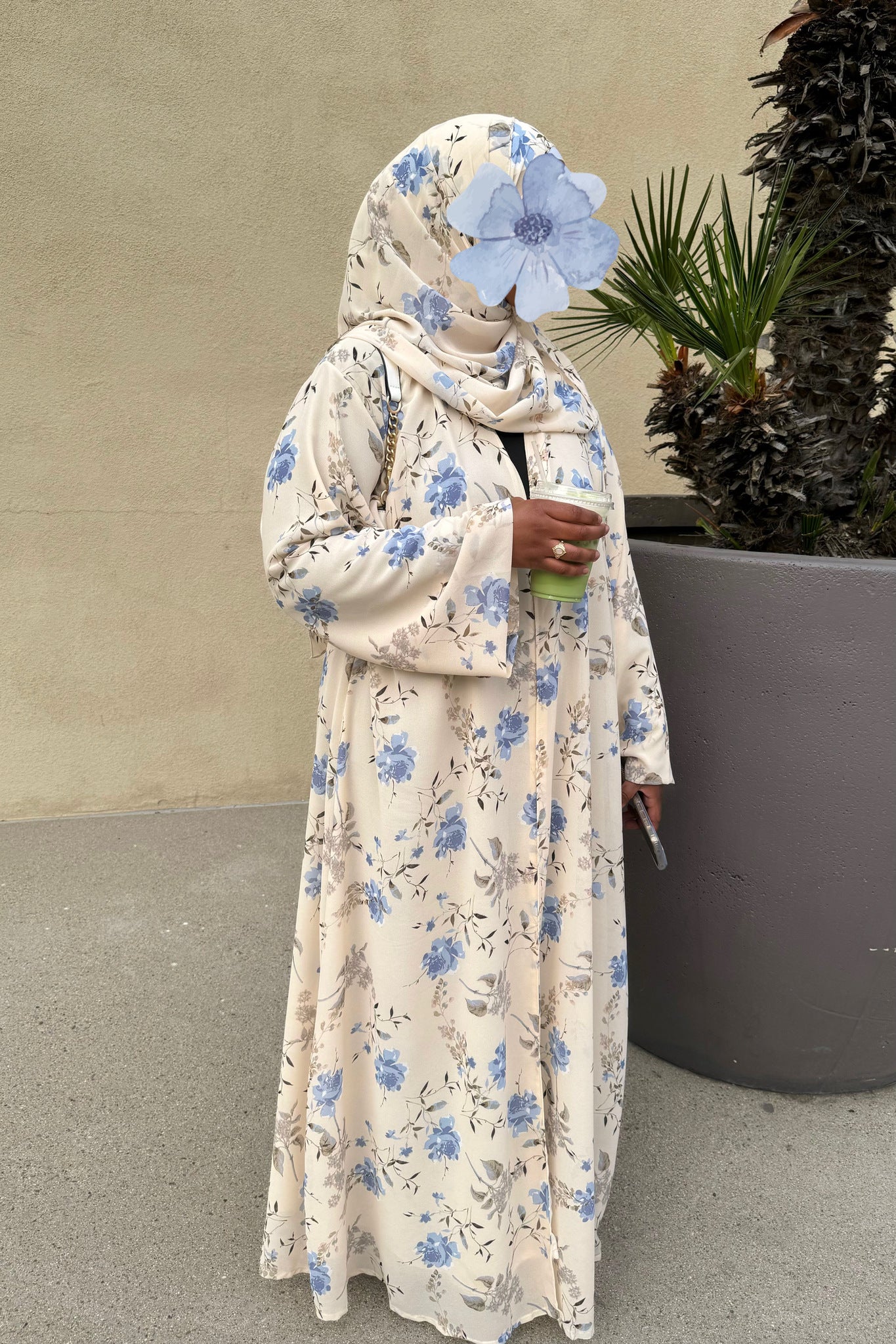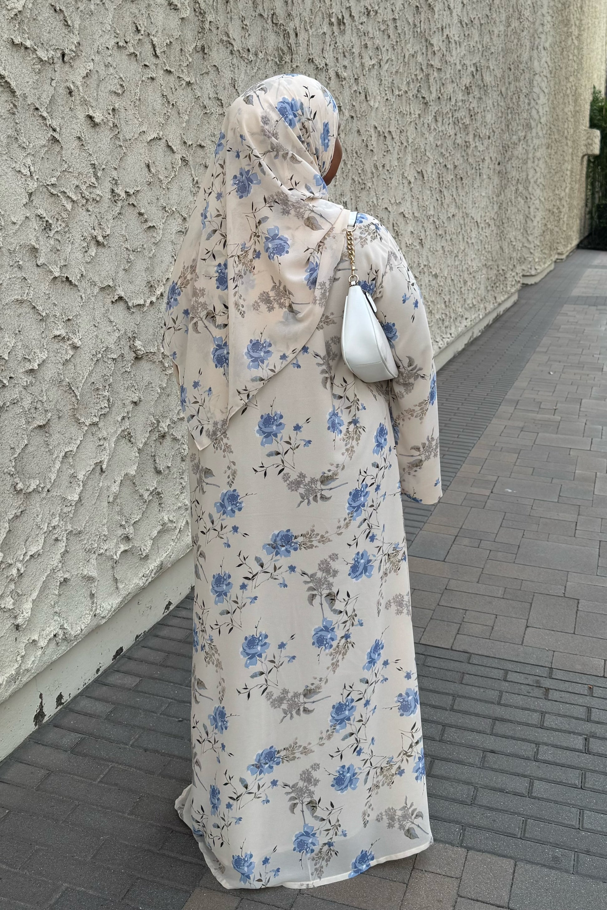 This printed abaya features a floral design and a loose, comfortable fit. Made from lightweight chiffon with a chiffon lining to maintain its flow, it comes with a matching hijab in the same printed fabric.